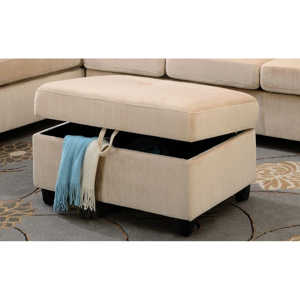 Romance : The Belville ottoman is a functional and versatile addition to any living room. Match it with the Belville sectional or mix it with any Decor in your living room. Comes in soft velvet upholstery; easy to maintain; while its storage function allows you to keep home essentials. It's available in beige; chocolate and gray finish. Sectional sofa and ottoman sold separately. Ottoman measures 35"L x 25"D x 19"H. Seat height is 20". Seat depth is 21".