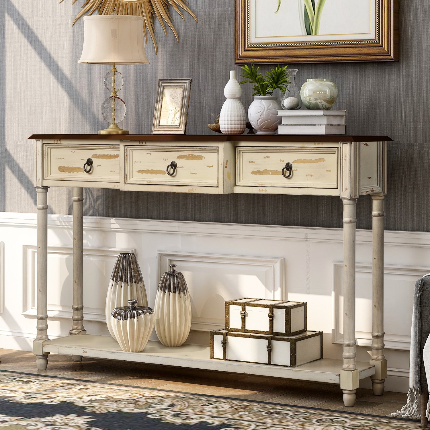 3.LARGE STORAGE SPACE: The console table features with 3 big functional drawers and a fixed lower shelf and long enough tabletop which provide enough storage space.