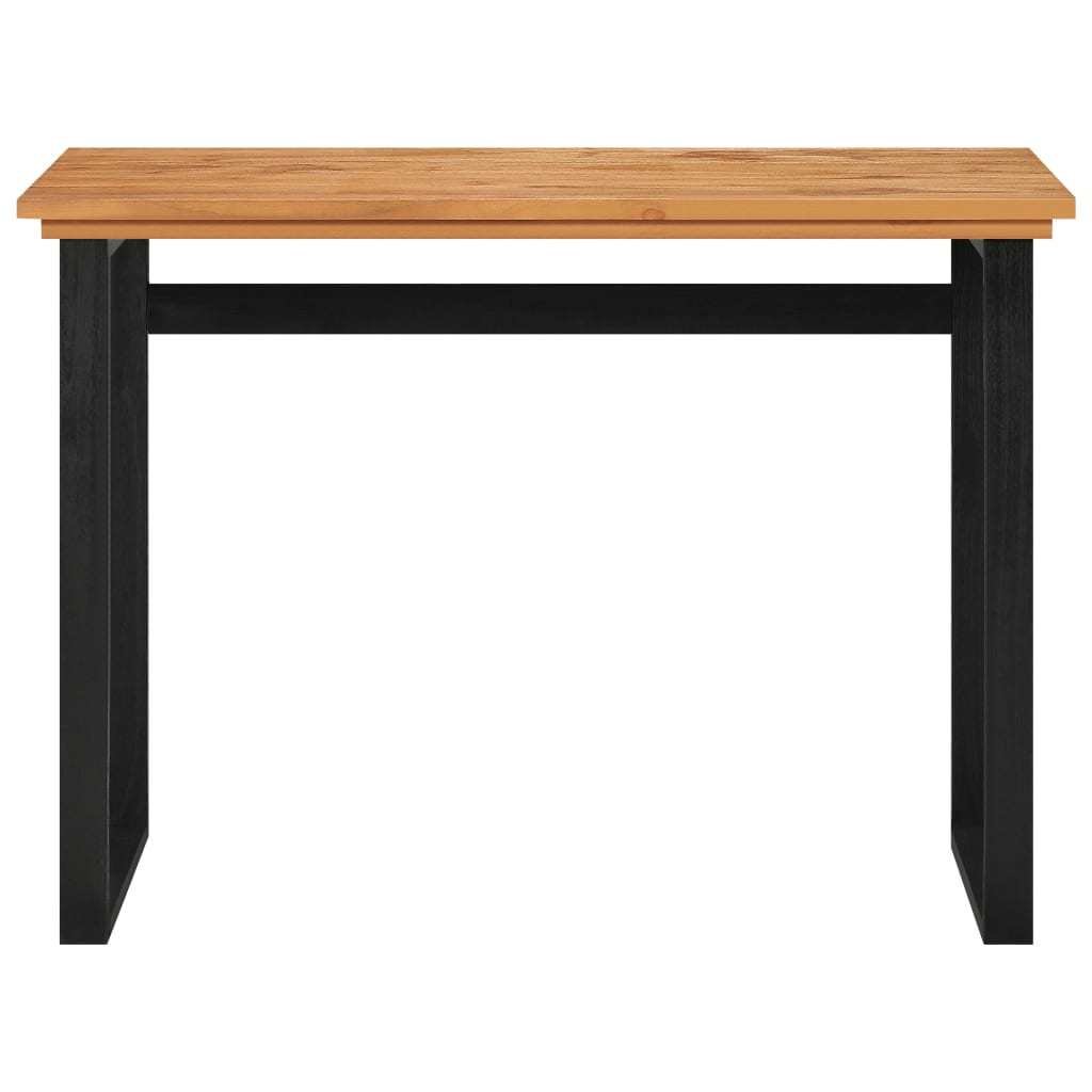 The desk is made of solid teak wood, making it sturdy and durable. The black color finish for the legs adds to the industrial style. It can also be used as a console table or computer desk.