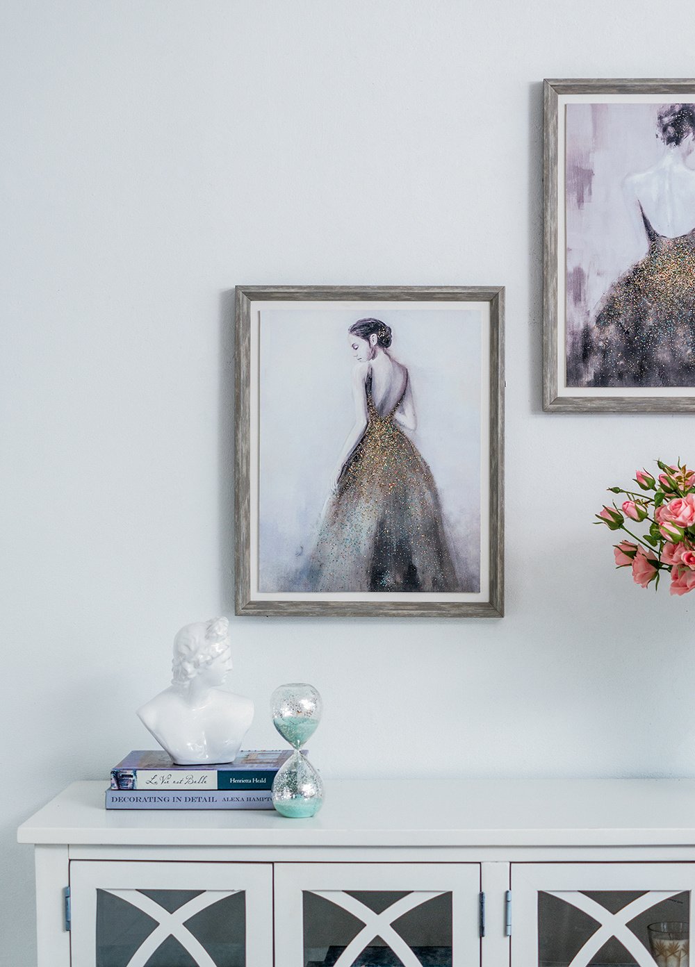 Features a sketch of a woman figure wearing dressGold accents to further enhance the artworkWith a soft wood color frame.