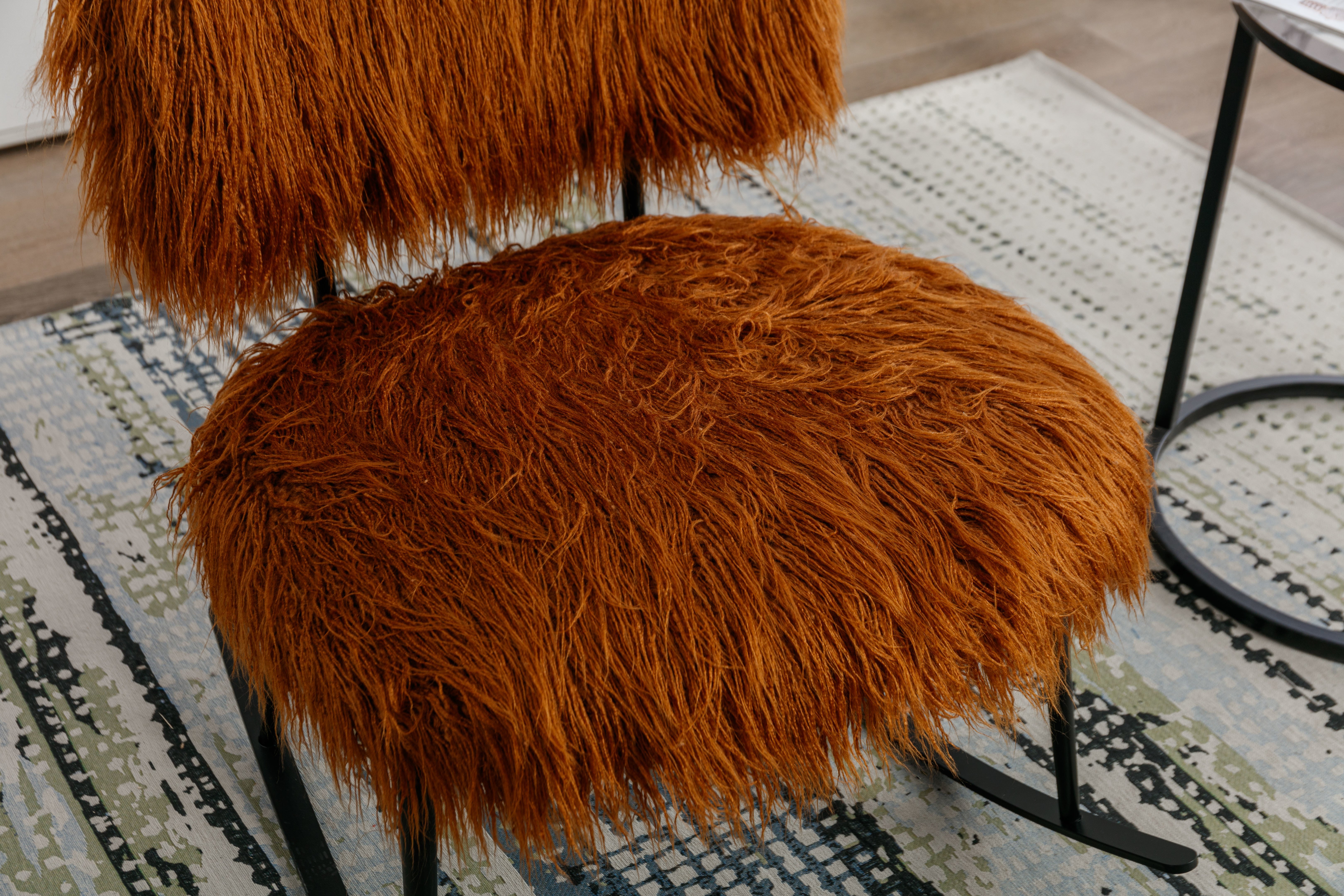 Unique Faux Fur Fabric The chair features a unique faux fur upholstery that adds a touch of luxury and a statement-making element to your decor. The soft and plush texture enhances the overall comfort and aesthetic appeal of the chair.