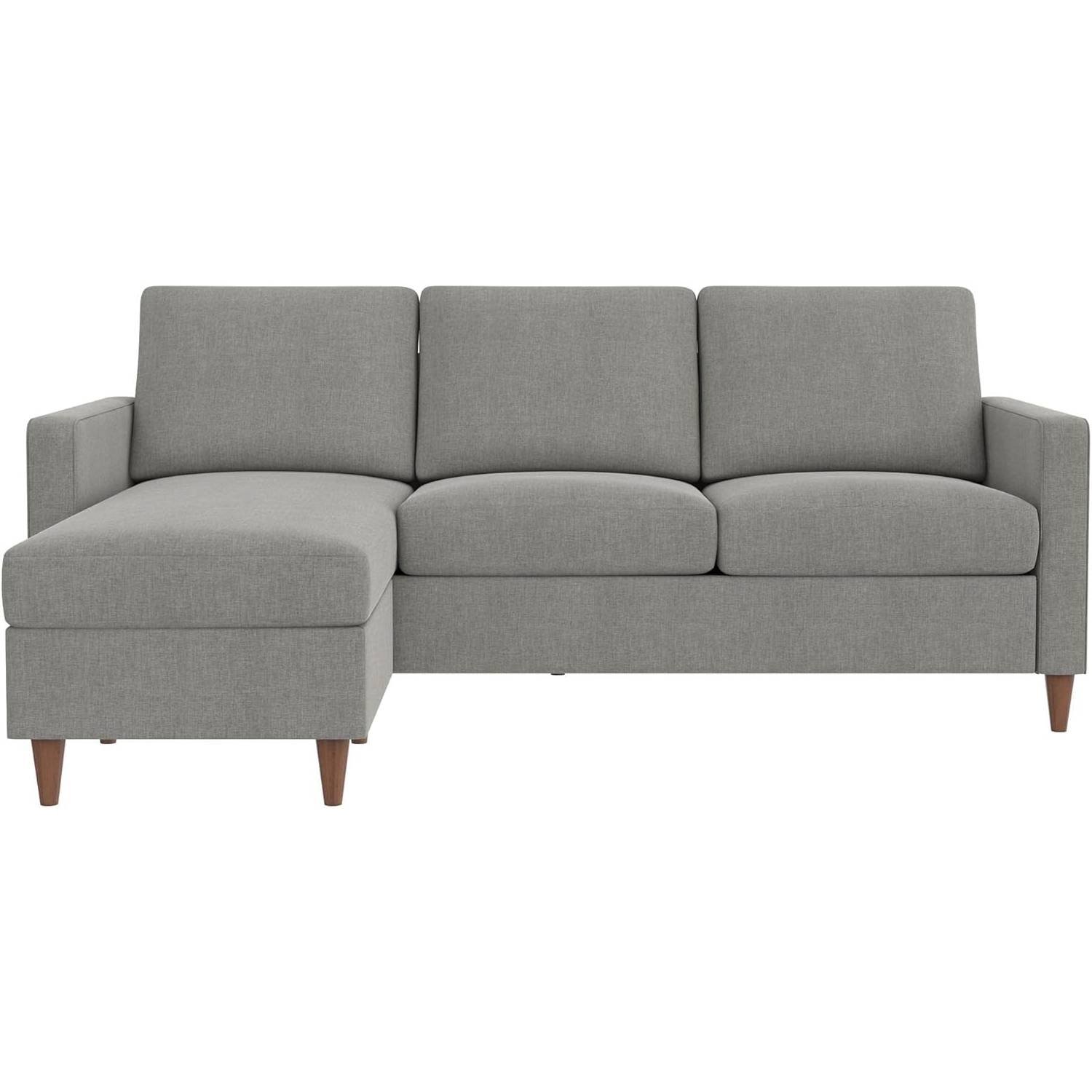 • Contemporary linen fabric upholstered sectional sofa adds character and comfort to your living room while adding depth to small spaces thanks to its lean profile. Its reversible chaise can be placed on either side to fit any room layout or converted into a standalone sofa and ottoman for added design choices
