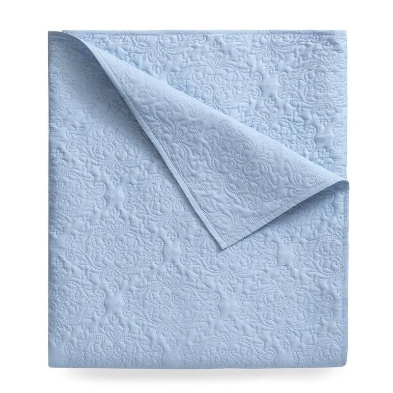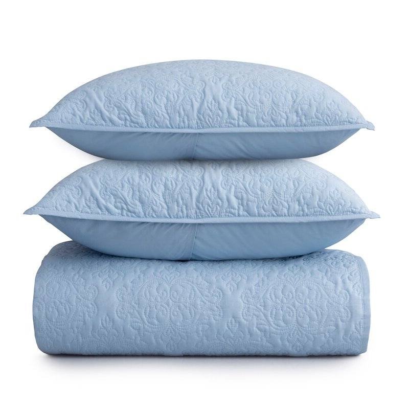 Queen Size Cotton 3-Piece Quilt Set in Blue with Quilted Damask Pattern
