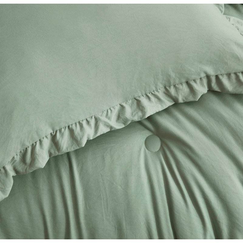 Transform your bedroom in a sophisticated and luxurious manner with this Queen Oversized Sage Stone Washed Ruffled Edge Microfiber Comforter Set. An attractive ruffled edge trim with an elegant yet simple presentation that makes you feel right at home. Fashionably providing everyday comfort. Lightweight, high loft comforter with adequate warmth for year-round use. The comforter is made of 100% microfiber polyester, giving a super soft smooth, and cozy feel. The fabric is stone-washed which creates a natural attractive crinkled fabric effect to enhance the aesthetics of the comforter.