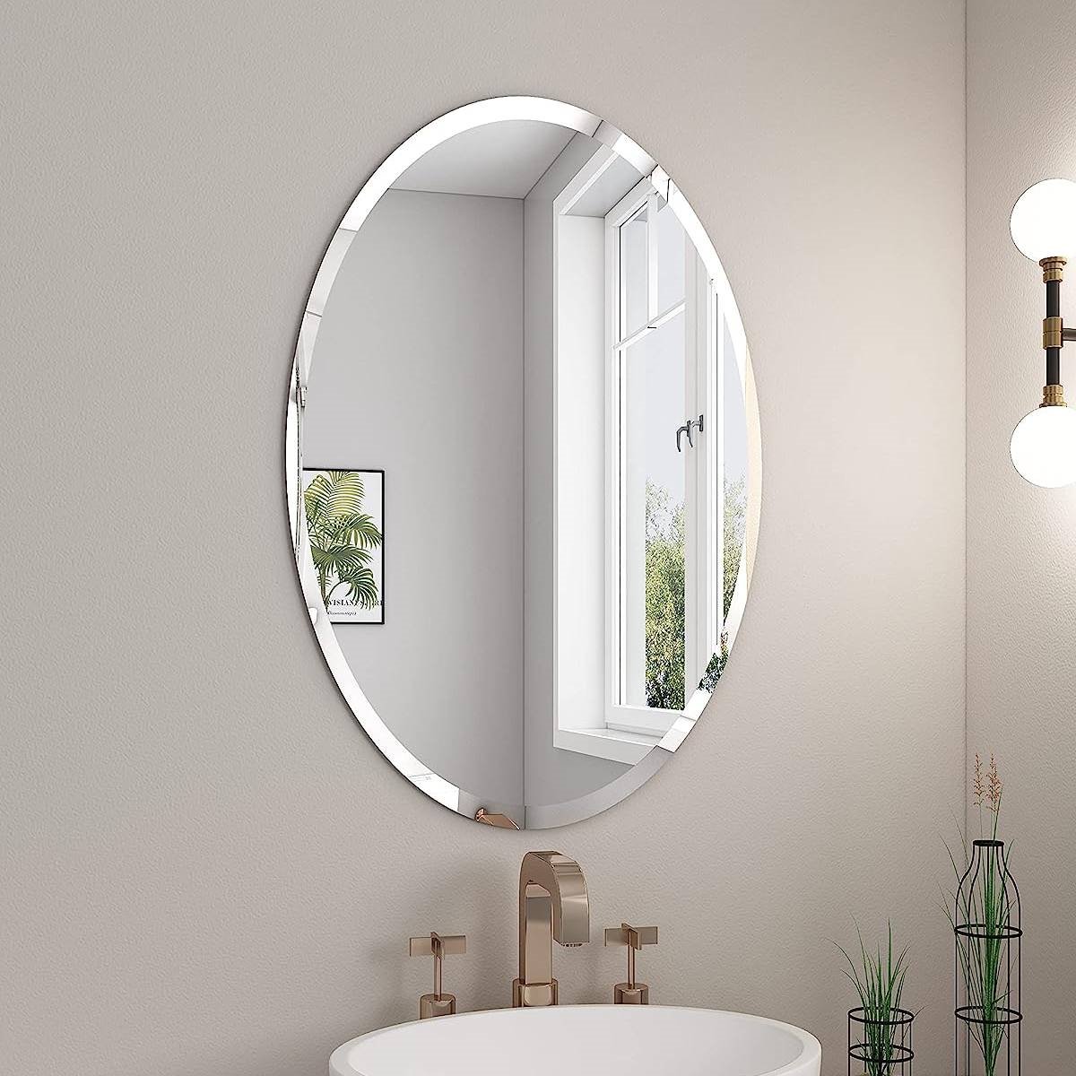The Classic Oval 35-inch Frameless Beveled Bathroom Bedroom Living Room Vanity Wall Mirror will make a great addition to any room in your home. Since there is no frame, this oval mirror makes it easy to match colors in your bathroom, bedroom, living room, or anywhere in between. Finely crafted 1-inch bevel offers showroom quality, while the polished edges ensure safe handling and a finished appearance.