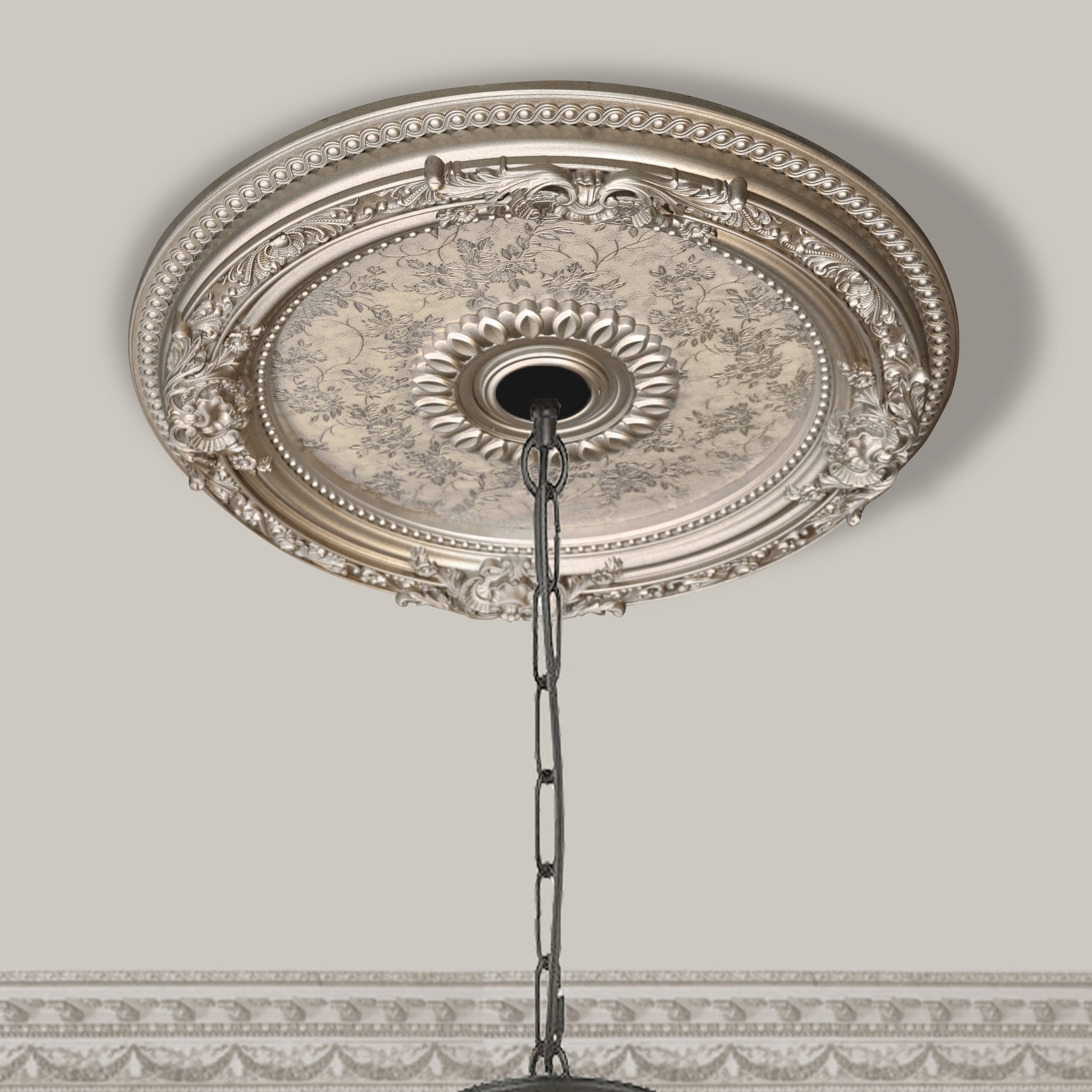 The Petite Round Champagne Ceiling Medallion 24 Inch Diameter is a classic round decorative ceiling Medallion or Coin. Finished in a softened Silver with a light wash of Gold, our Champagne Silver Medallion features a recessed center panel with slightly raised floral pattern detail, offering a luxurious finish in a stylish design. The item comes fully finished out of the package and is Hand Cast in a lightweight Polystyrene that will never shrink, split or crack. The medallion is designed with a 1.5 inch center hole that allows for the easy use as a crown for chandeliers, light fixtures, and fans. This beautiful ceiling medallion adds stunning architectural detail to otherwise plain open ceiling spaces. Installation can easily be done with architectural adhesive and finishing nails. Instantly provide your ceiling spaces with rich architectural details that are long lasting, maintenance free, and add value to your home at an affordable price.