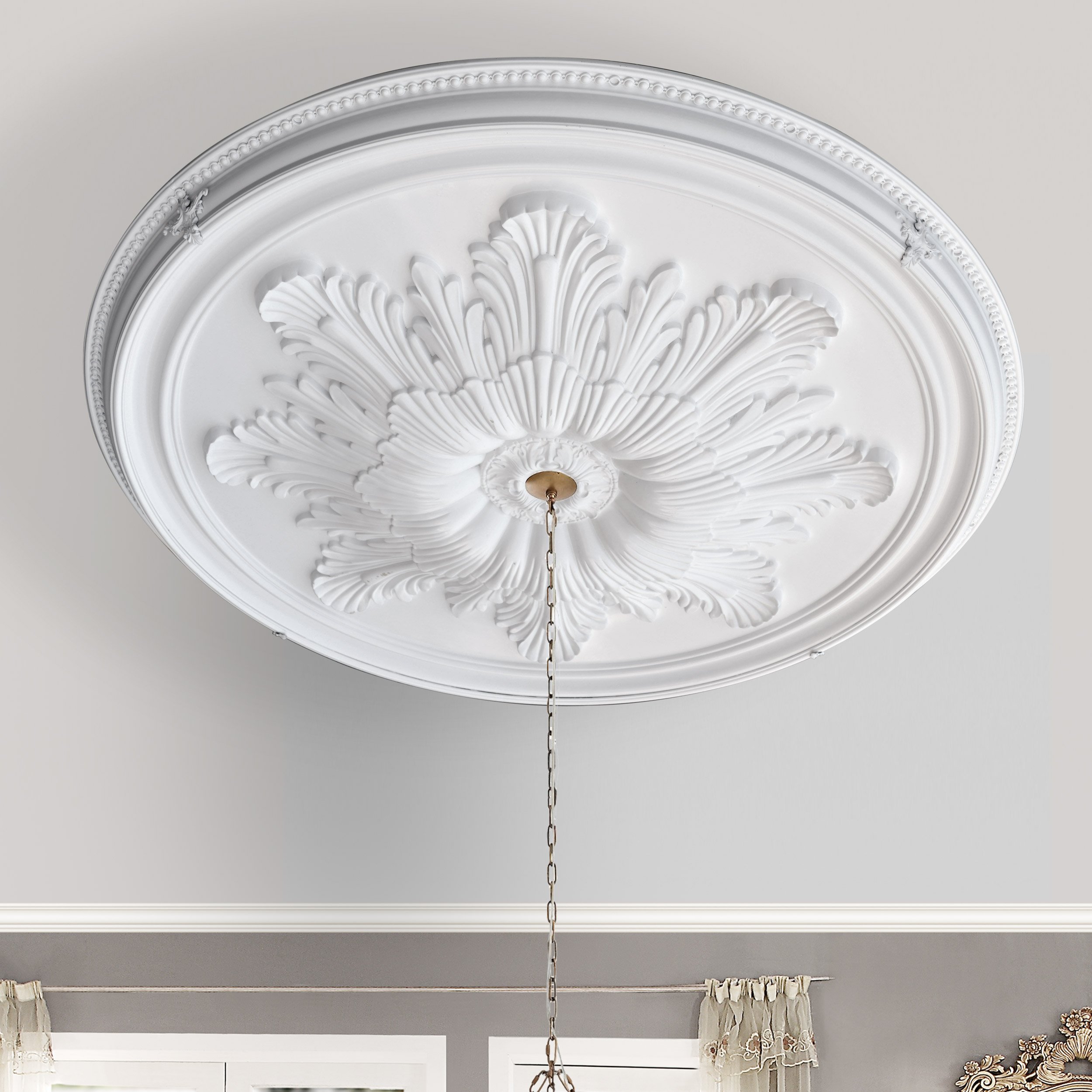Sophisticated and New. Introducing The Grand Acanthus Round Ceiling Medallion 65 Inch Diameter from Masterpiece Molding, a division of AFD Home. It is an exclusive and new offering in the market, designed to enhance fashionable living spaces with stately Architectural Detailing. Finished in a clean Ready To Hang White Finish, which is also an excellent base for any desired customized painting. This 3 dimensional ceiling medallion will add beauty for the owner to enjoy as well as value to your property investment. Prior to Masterpiece Moldings creation of this series, the only way to have had an advanced ceiling with this level of design would have been a very expensive addition and an owner willing to take on an elaborate installation project, requiring carpenters, finishers, and in some instances even artists. One of the best parts about this item is that installation could not have been made easier, as the outer ring is created with intermittent spaces designed specifically as the locations needed for installing the simple hollow wall anchors, matching decorative caps are provided that will cover the screw heads of your anchors and when applied will offer a complete professional looking install. The item comes fully finished out of the package and is created using lightweight, durable polyurethane. The newest and best solution in the market for adding architectural detail to a plain ceiling which also adds a crowning elegance to a Chandelier Installation. The overall measurements are 65 x 3.20 x 65. Hollow wall anchors are not provided.