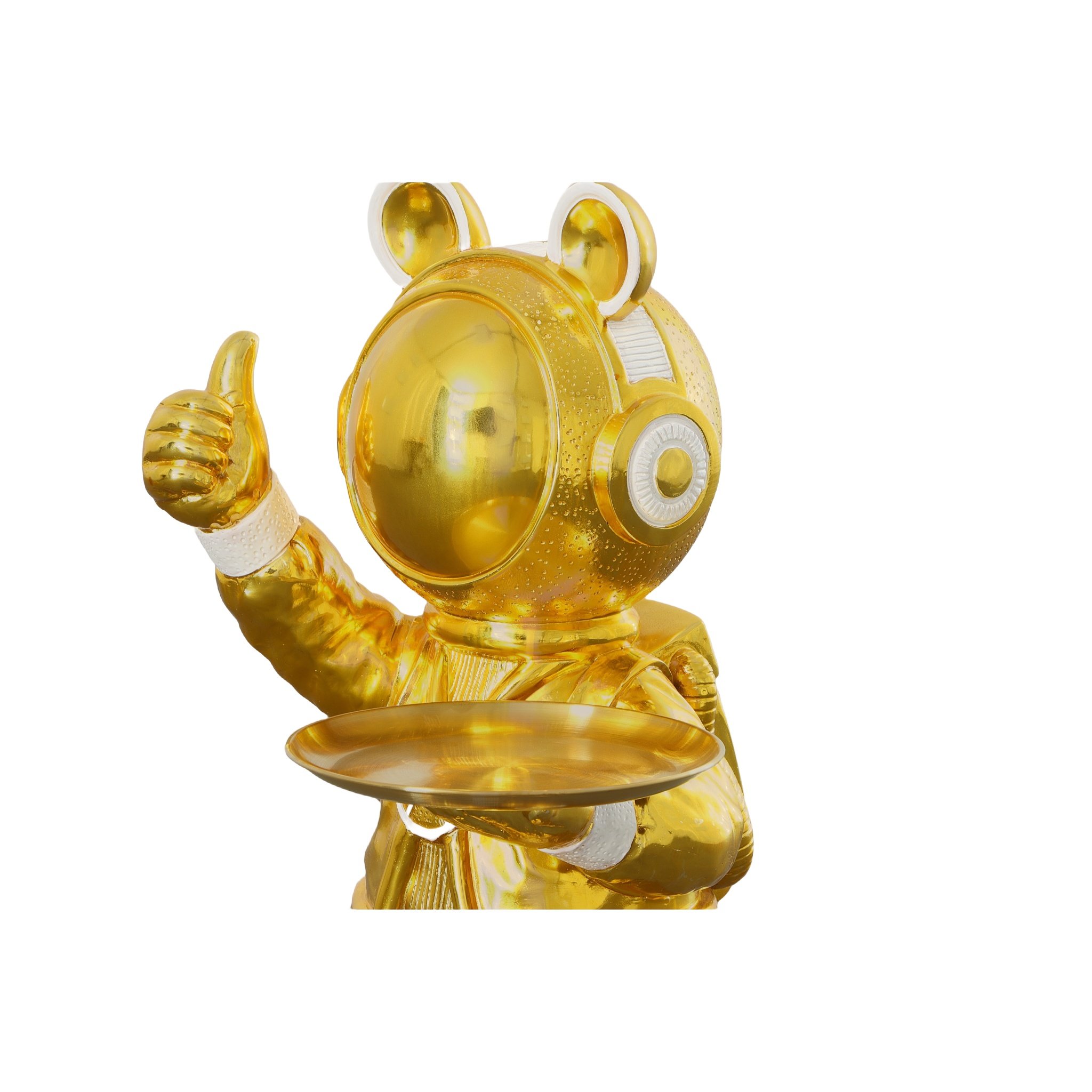 Meet the Cosmic DJ Astronaut Statue from the Whimsical Treasures Collection - a quirky 33-inch tall figure, finished in flashy gold with cheeky French White accents. Get ready for a giggle as you spot a mouse rocking an astronaut suit, giving a big thumbs up while holding a butler tray. This playful statue brings fun and creativity to any space. Embrace the whimsy and let this quirky piece become the talk of the town in your home or office. It's time to add a cosmic touch to your decor and spark some smiles along the way!