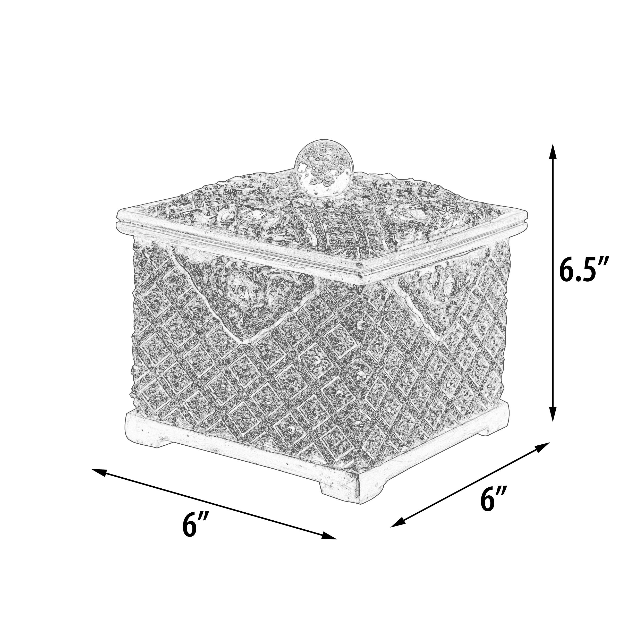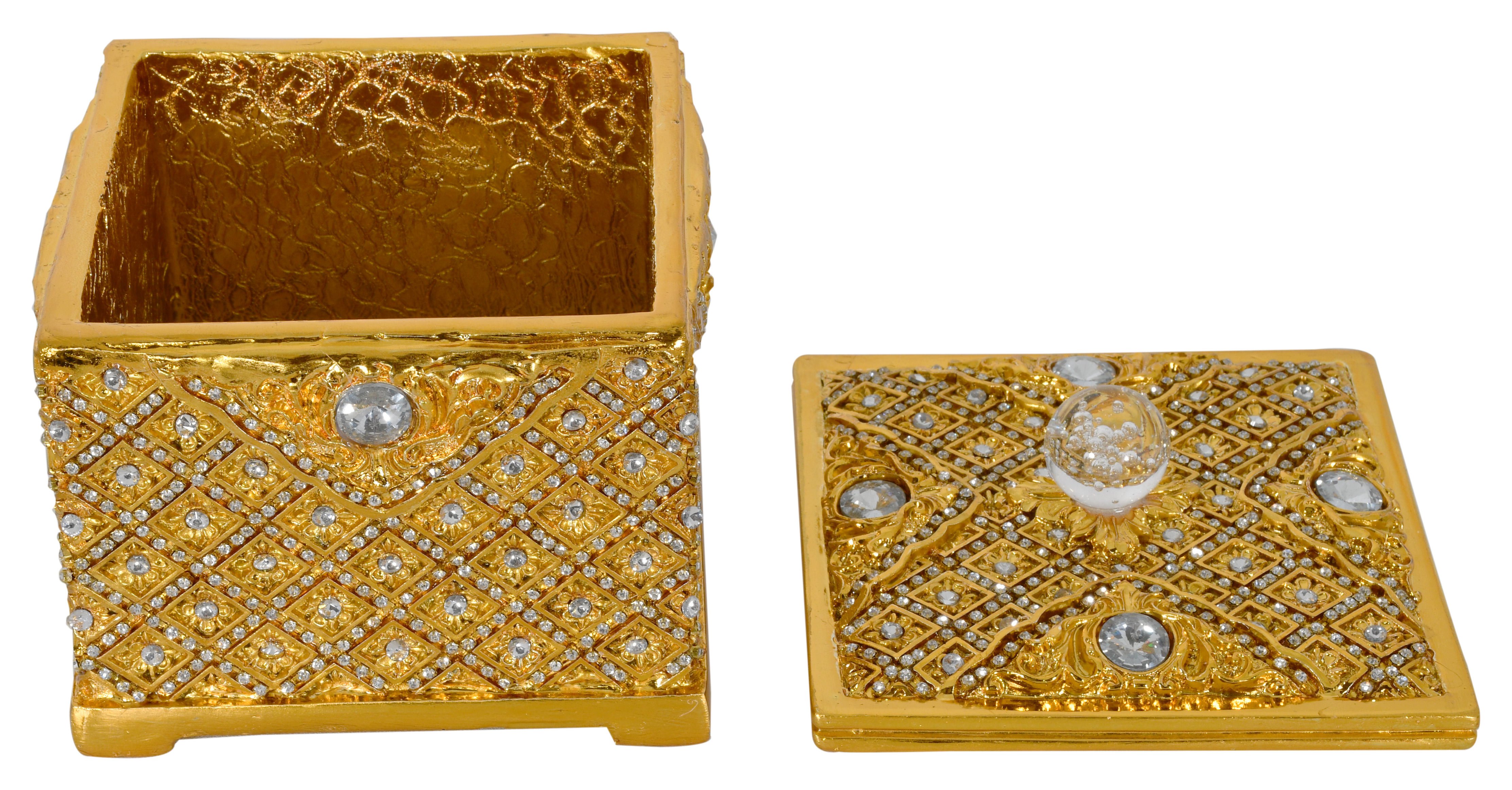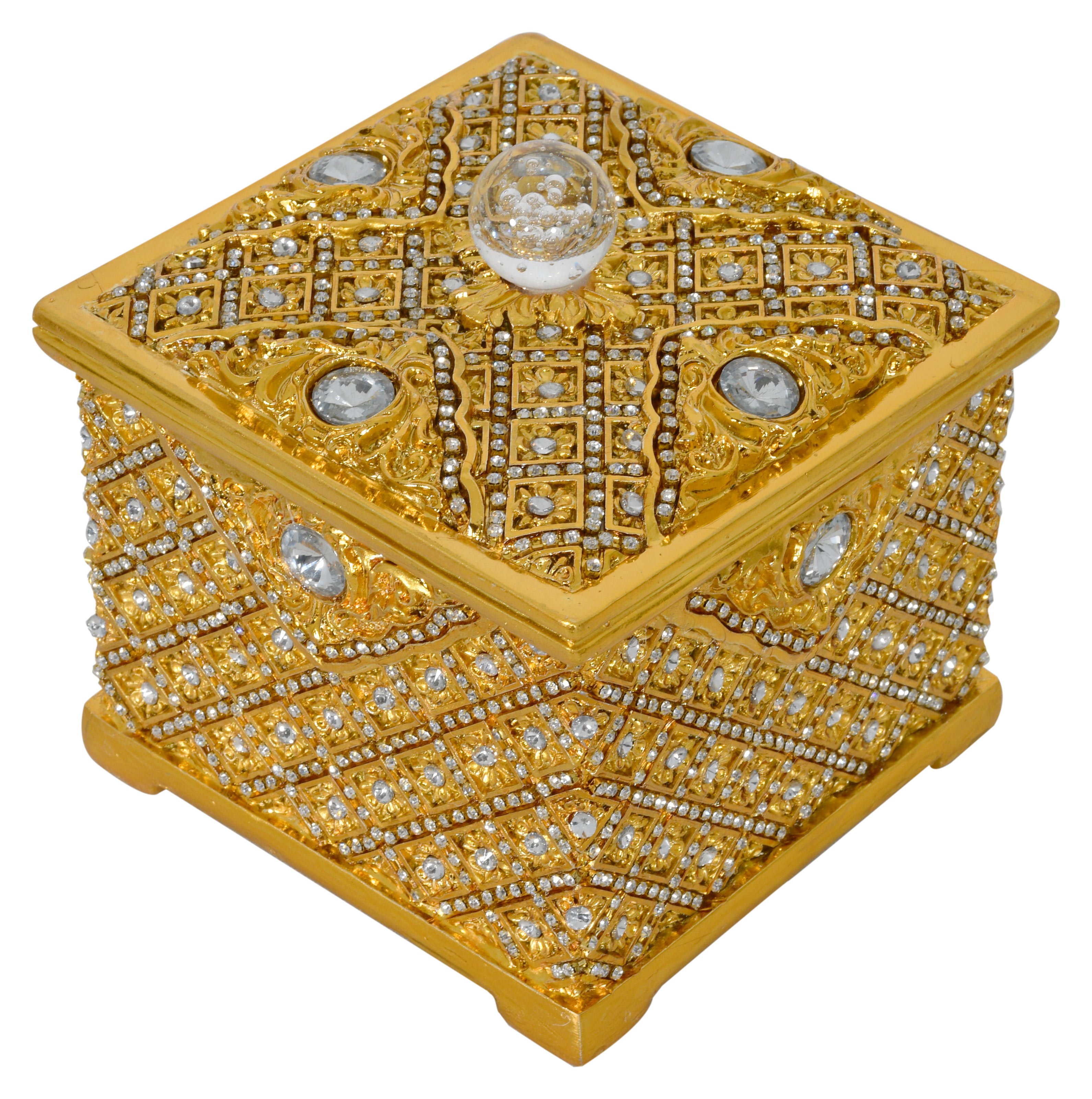 Introducing an exquisite trinket box that epitomizes the grandeur of a bygone era, its design resonates with the splendor reminiscent of European refinement. Embellished with an ornate golden lattice and sparkling jewels that capture and reflect light, this piece is crafted to be not just a holder of treasures, but a treasure in itself. With dimensions that make it a perfect addition to any vanity or display shelf, it promises to safeguard your keepsakes while being a dazzling decorative element. The elaborate patterns and crystal adornments are a testament to the skilled craftsmanship and an eye for luxury. The jewel-encrusted lid is crowned with a transparent orb, adding another layer of elegance and charm. This box is a timeless piece, offering a touch of opulence to your home, and it's sure to spark conversations about its intricate beauty and the storied past it represents.