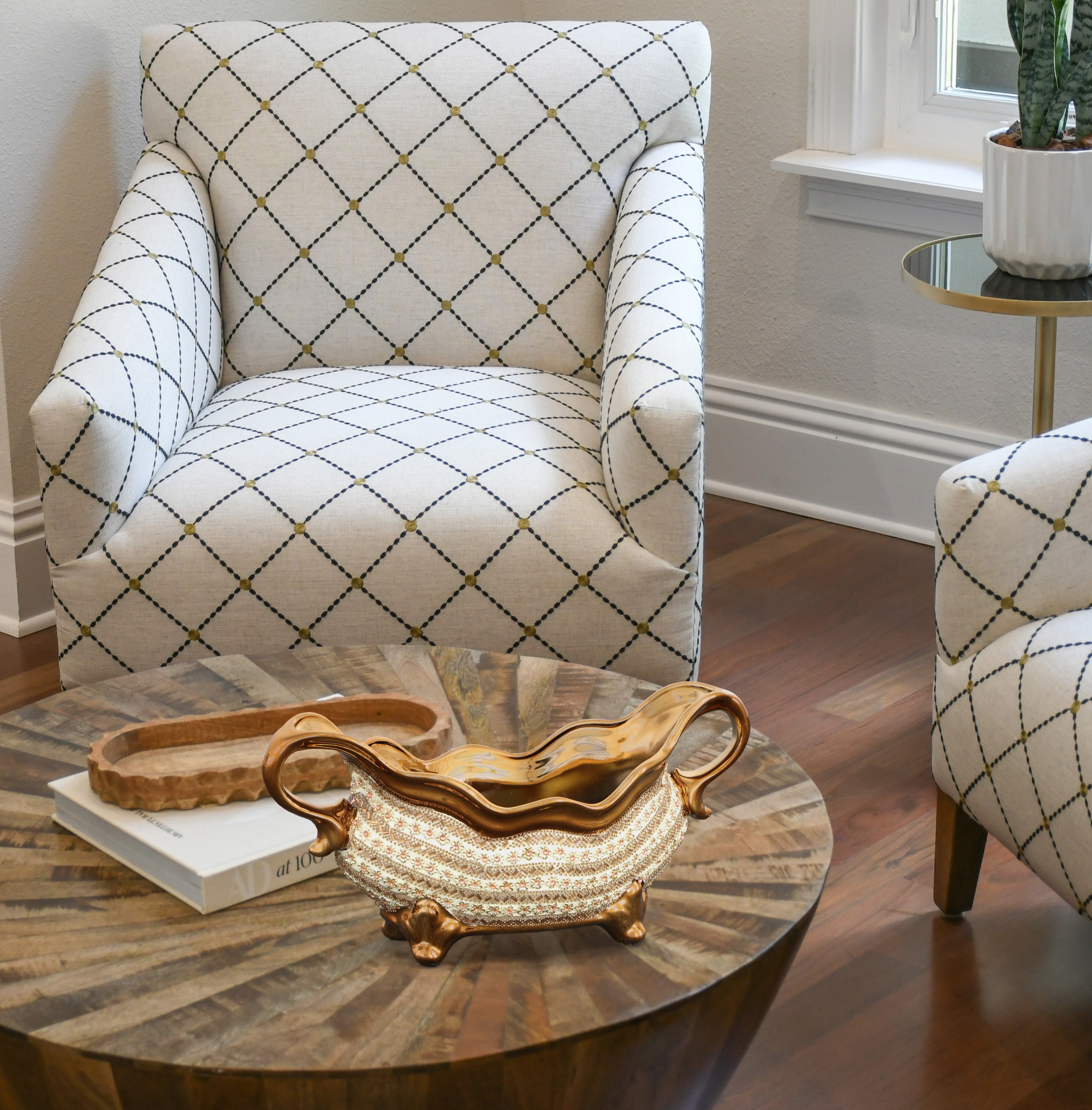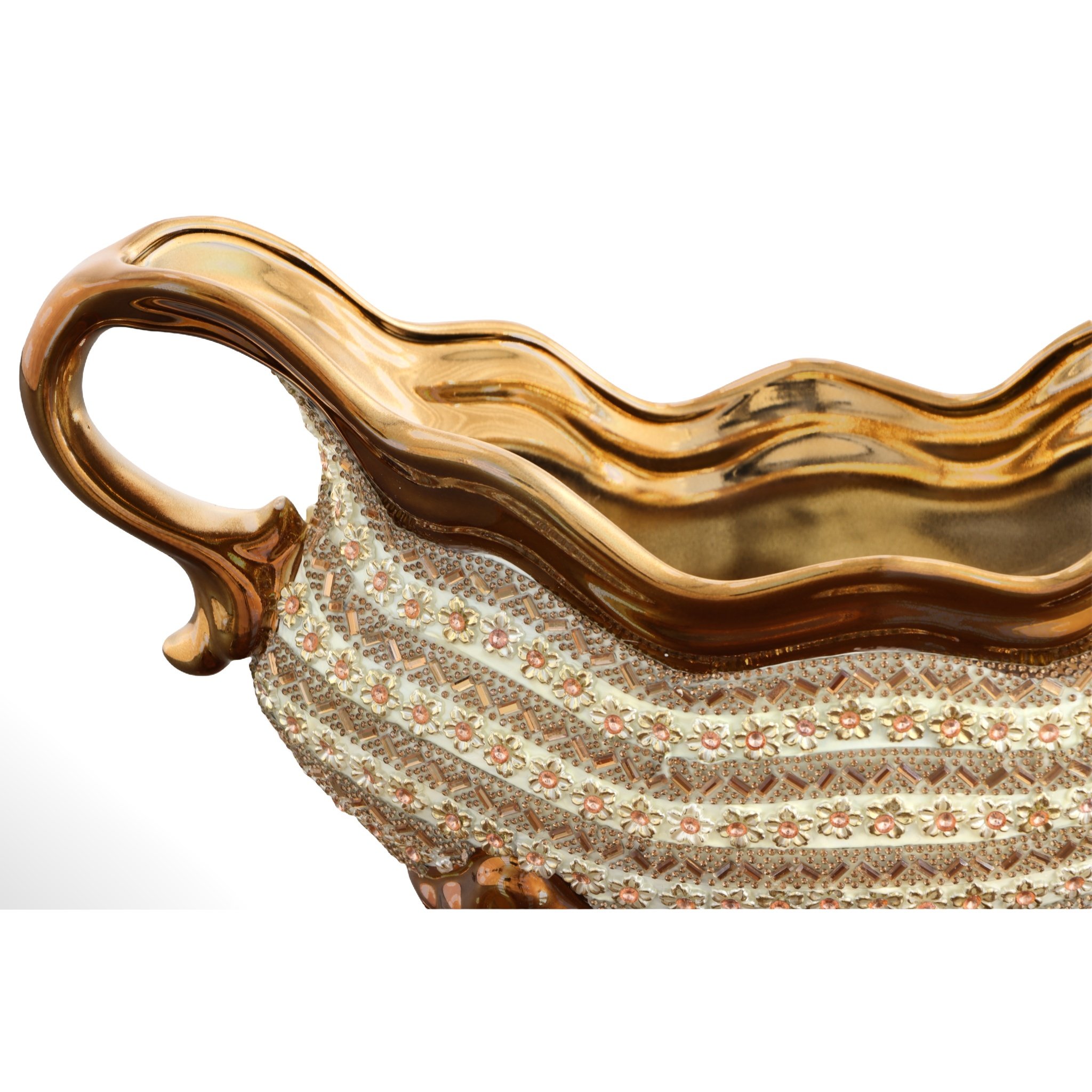 The 16.7 inch wide Amber Floral Tureen is a beautiful and deeper shaped oblong center bowl. It is hand cast in porcelain with a striking gold plated body and accents. Features hundreds of individually hand applied Amber and Clear rhinestones. The gold, amber and white colors create a soft contrast effect on this handcrafted functional decor item. Sold separately but often ordered in pairs for balance or symmetry. Also consider adding to other items from the Amber Floral series for a larger display affect. No Assembly required.