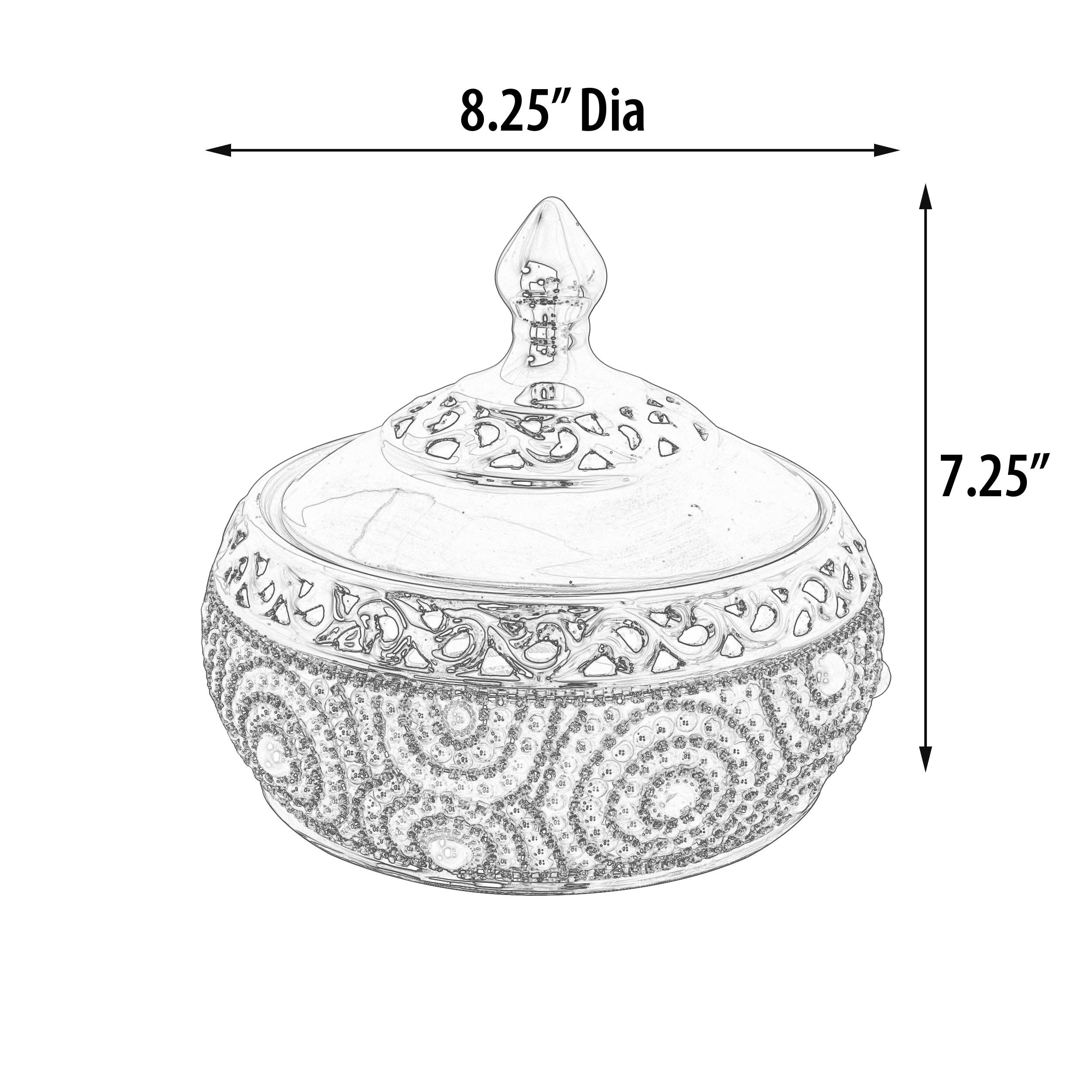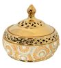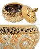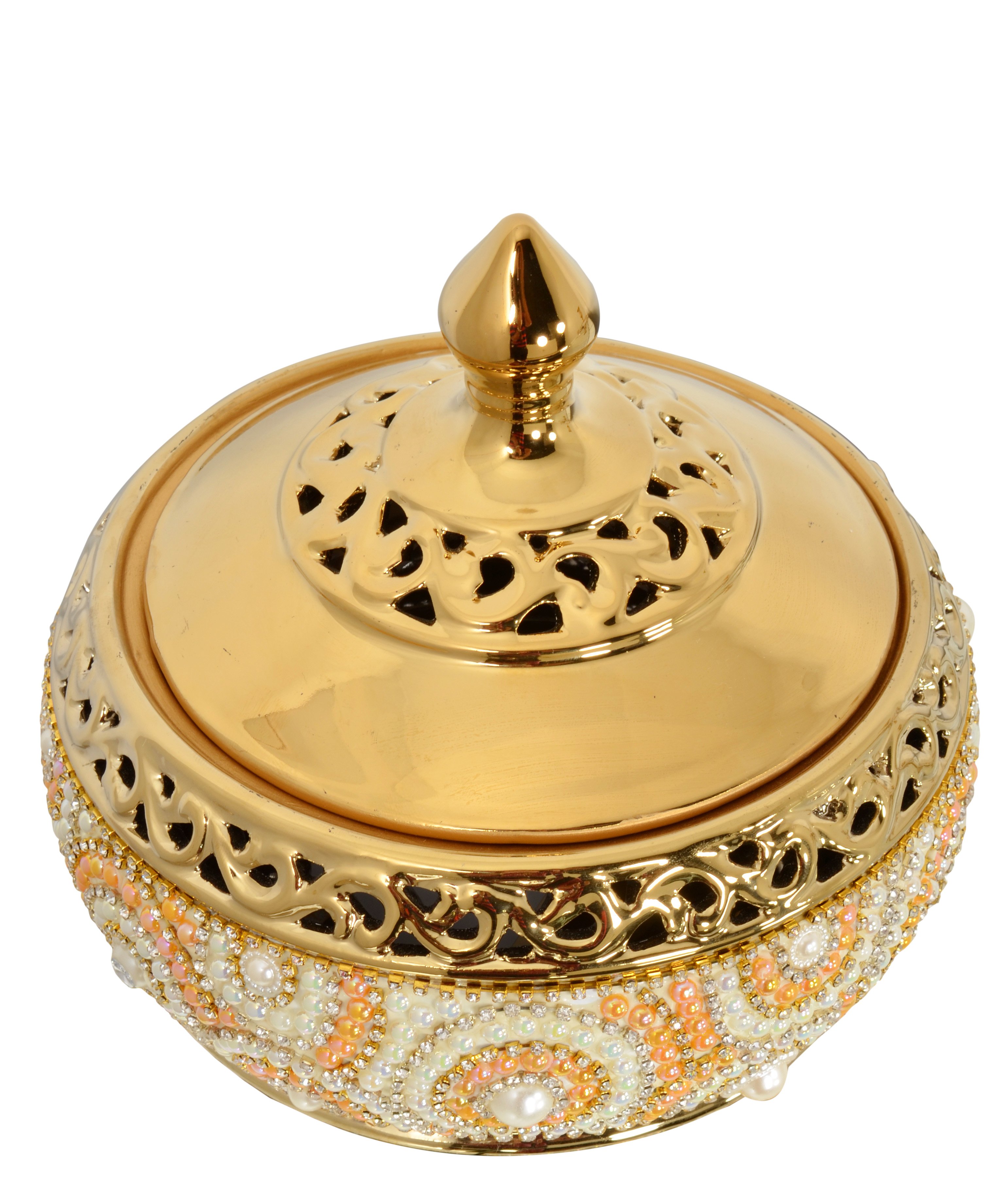 The Radiant Pearl Box with removable lid for keepsake or jewelry storage 8.25 inch diameter. An attractive holding solution for a ladies desk, dresser, or vanity. Hand cast in Porcelain. The finish is a strikingly beautiful gold plating then further enhanced with a circular pattern of intermittent rings of faux pearls in hues of white and peach tones. The contrast and design create a radiant effect on this unique hand crafted functional decor item. Makes a great gift, consider combining this item with the matching Radiant Pearl Vases.