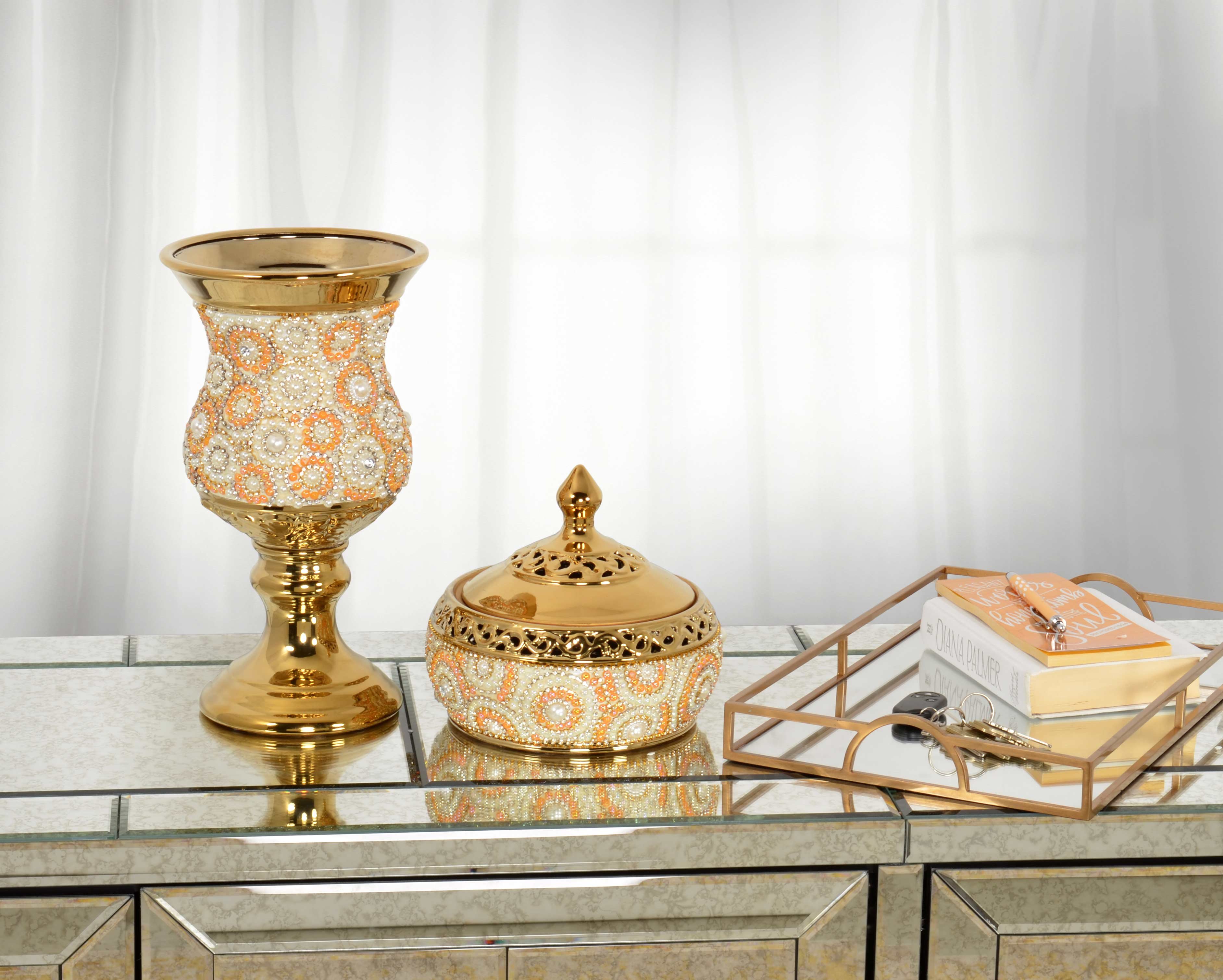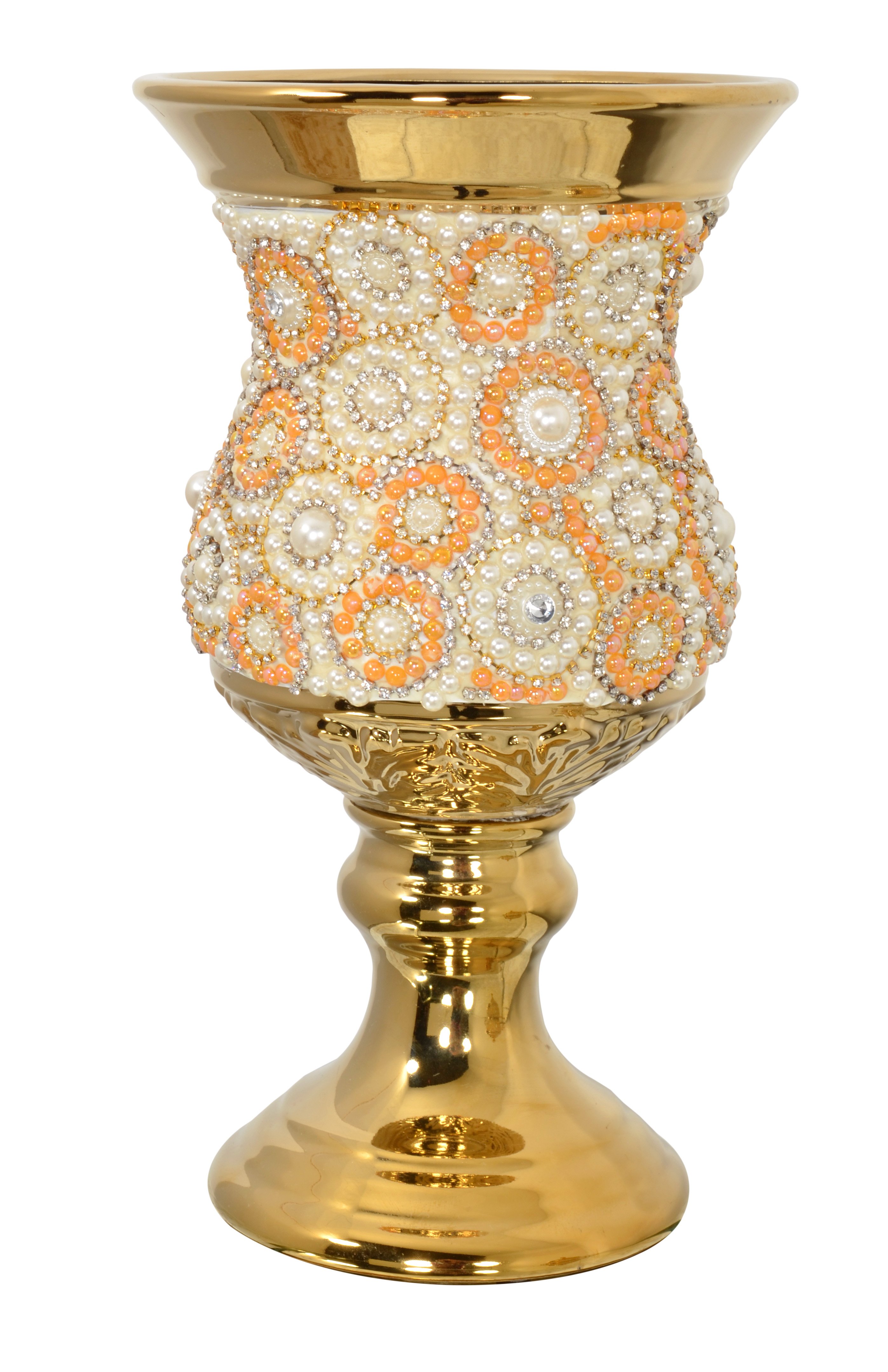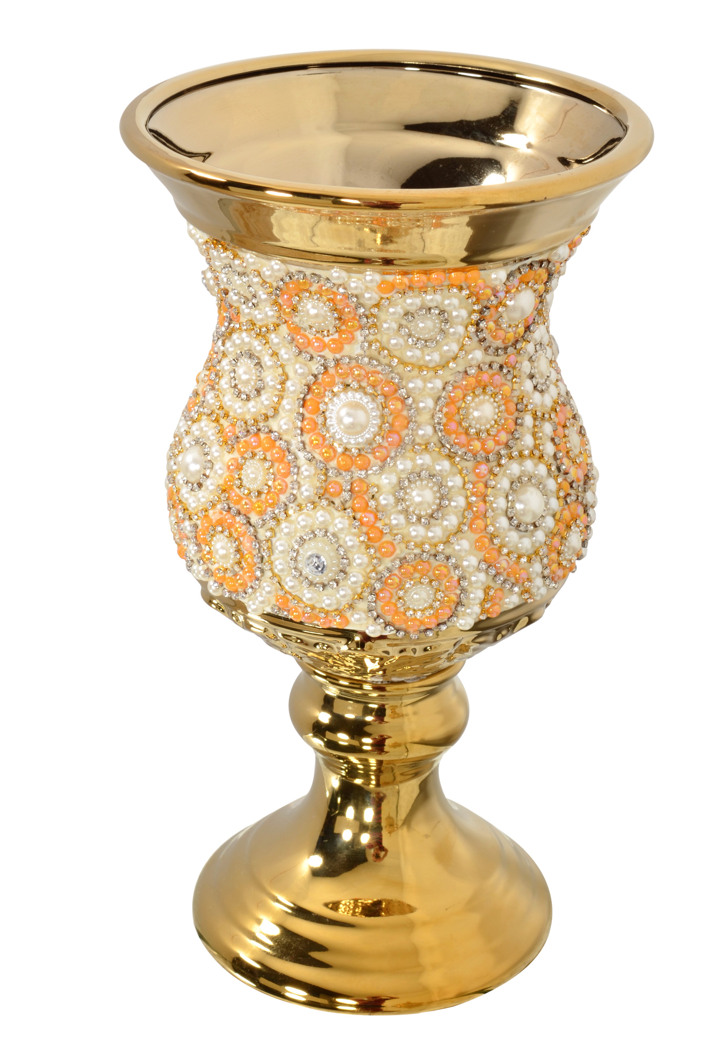 A contemporary 11.5 inch tall Radiant Pearl Vase, The vase is beautiful and often used as a stand alone object or as a base of a Glamorous Floral arrangement. The attractive design and smaller size lends itself for many storages and organizing uses in ladies workspaces. Hand cast in Porcelain. The finish is a strikingly beautiful gold plating then further enhanced with a circular pattern of intermittent rings of faux pearls in hues of white and peach tones. The contrast and design create a radiant effect on this unique hand crafted functional decor item. Sold separately but often ordered in pairs for Balance or symmetry or combine with the matching Radiant Pearl Box. No assembly is required.