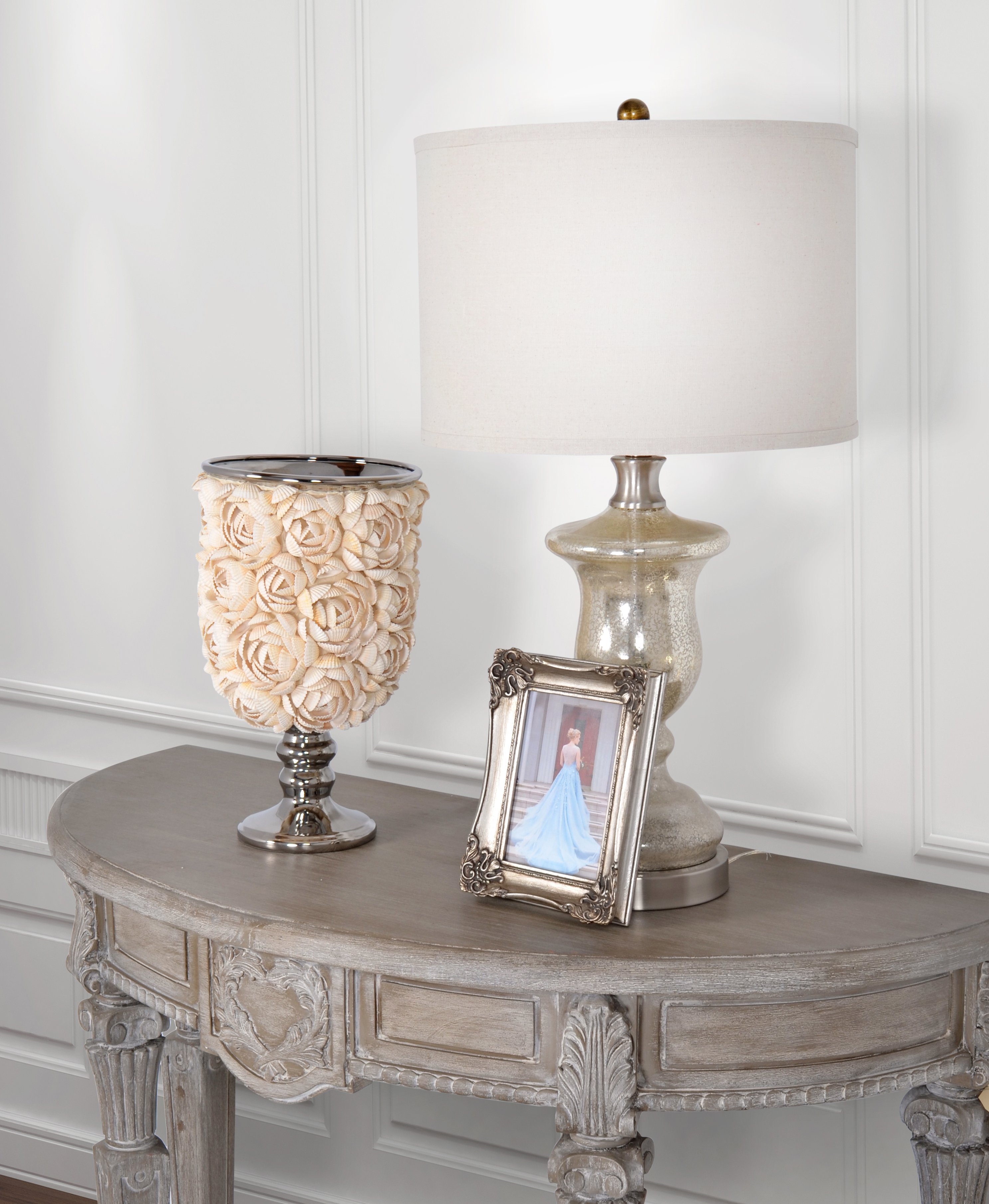 Amazing Shell Vase 16.5 Inches Tall. Thousands of fine Seashells are handset in an all over flower petal pattern. An artist created a coastal chic creation that brings a natural feeling indoors. Hand cast in porcelain with a striking silver plating, this Urn is beautiful and suitable for display as an art piece or used as an urn for an arrangement. Sold separately but consider a pair for Balance