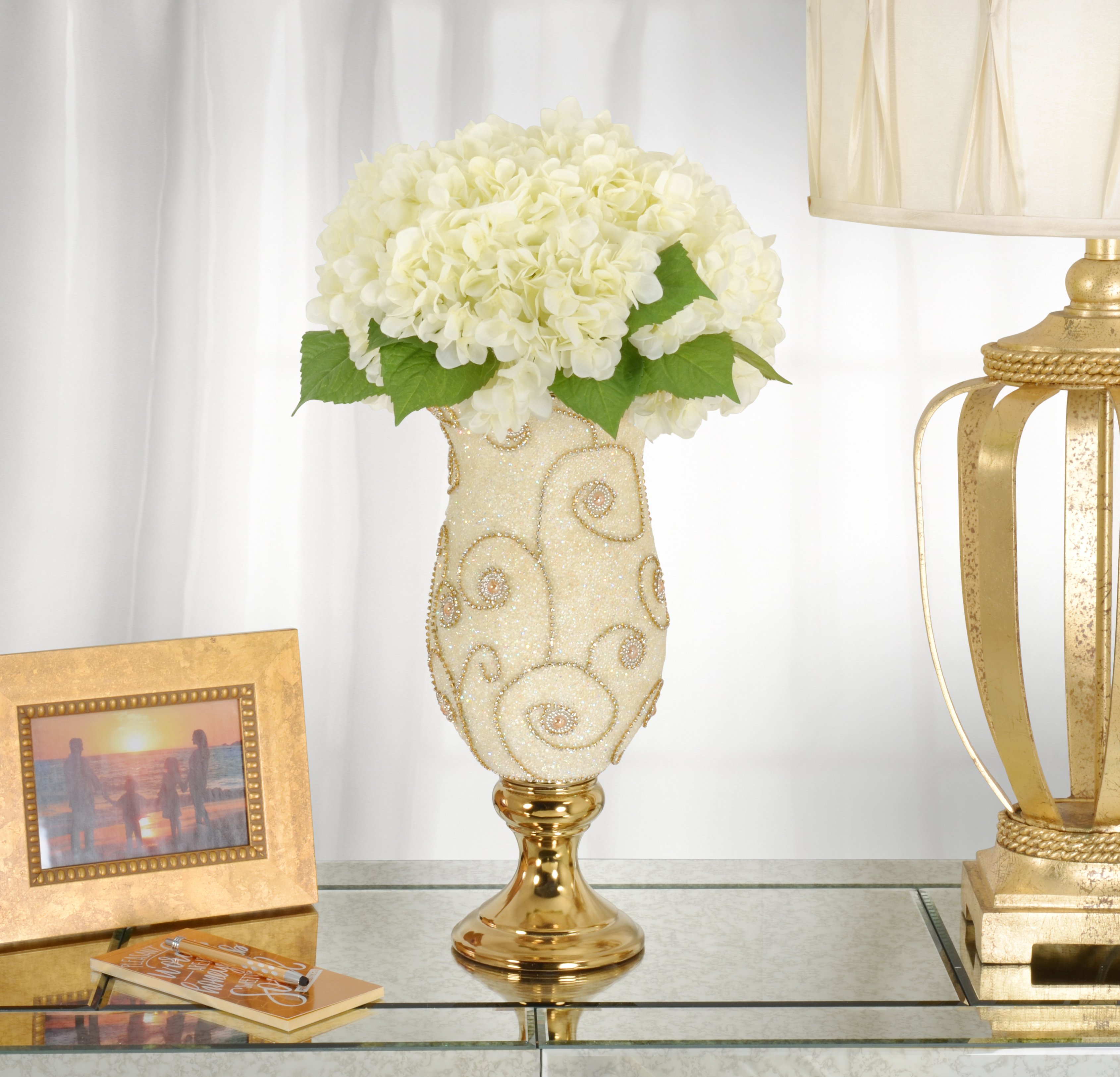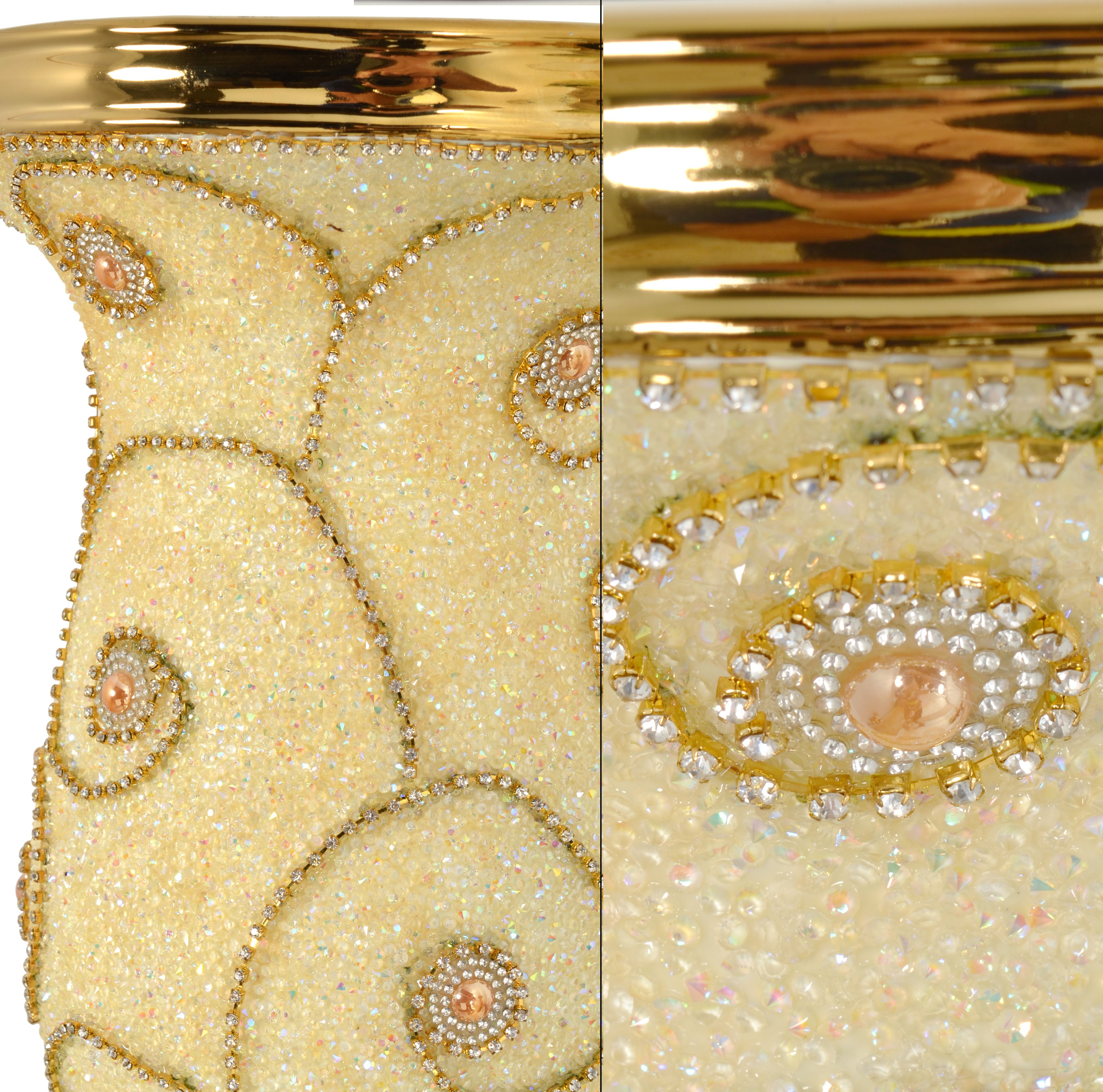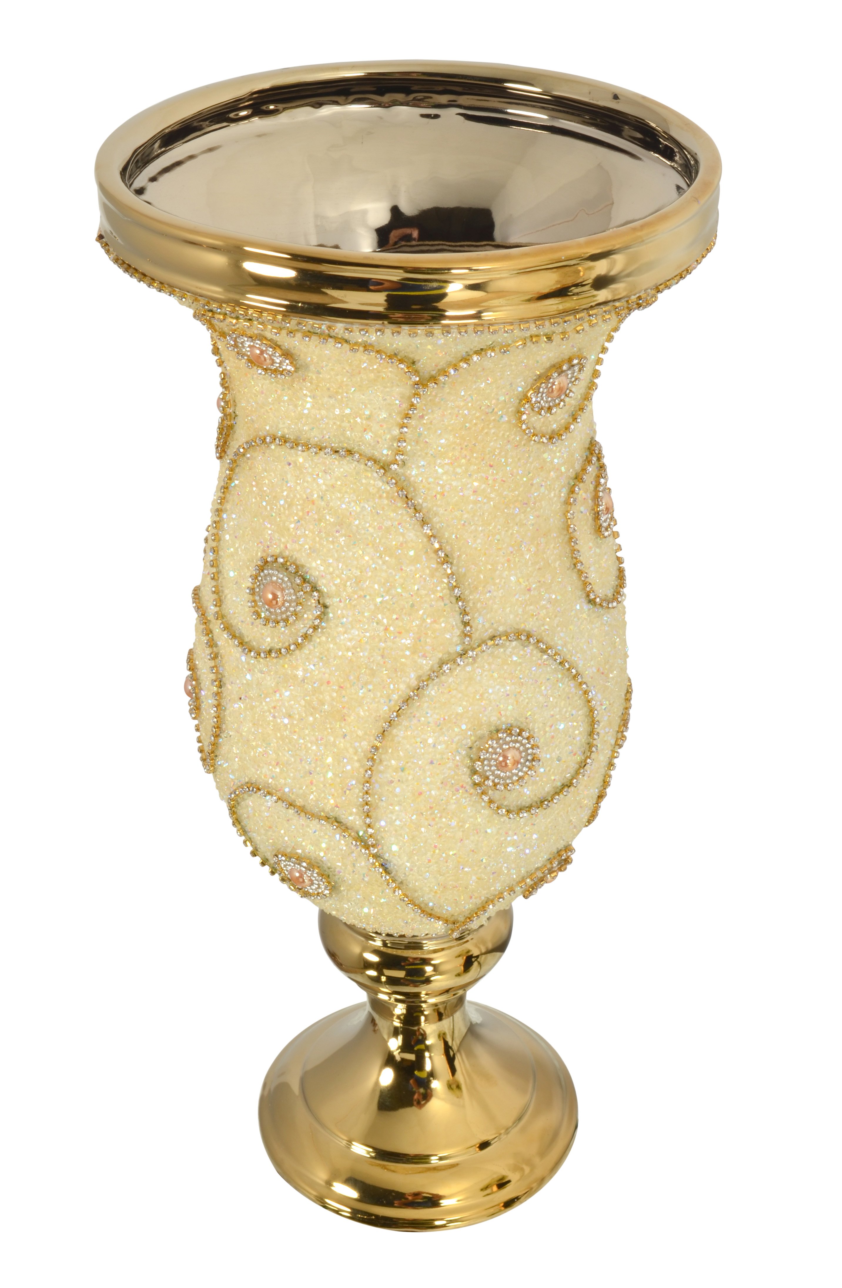 The Pearl and Swirl Golden Chalice Vase stands 17.32 inches tall. Hand Cast in porcelain and finished with an applied Gold Plating for richness and durability. The urn's body is uniquely covered in Obliquitous crushed faux Pearls further embellished by artist used decorative swags of small pronged crystals in a flowing pattern. The combination offers a delicate effect, and the finished creation is beautifully functional. Consider ordering a pair for Balance or Symmetry and combining it with other new items from our Pearl and Swirl Series by AFD Home. No assembly required