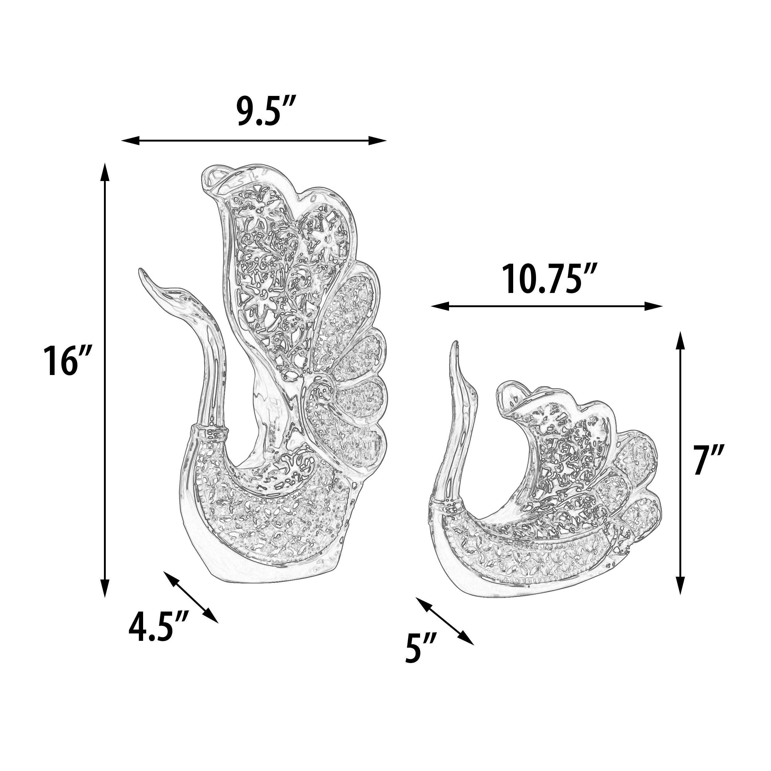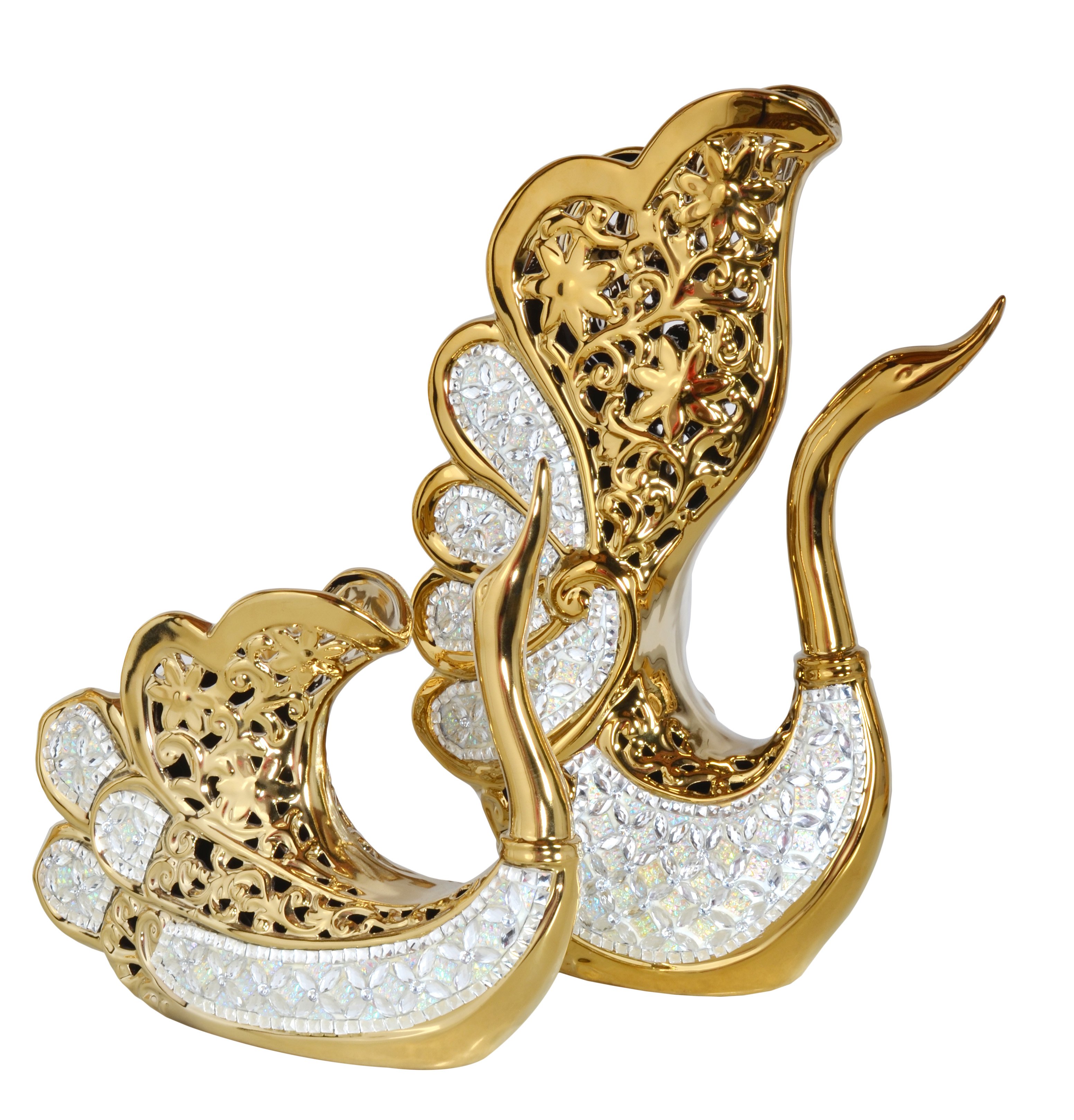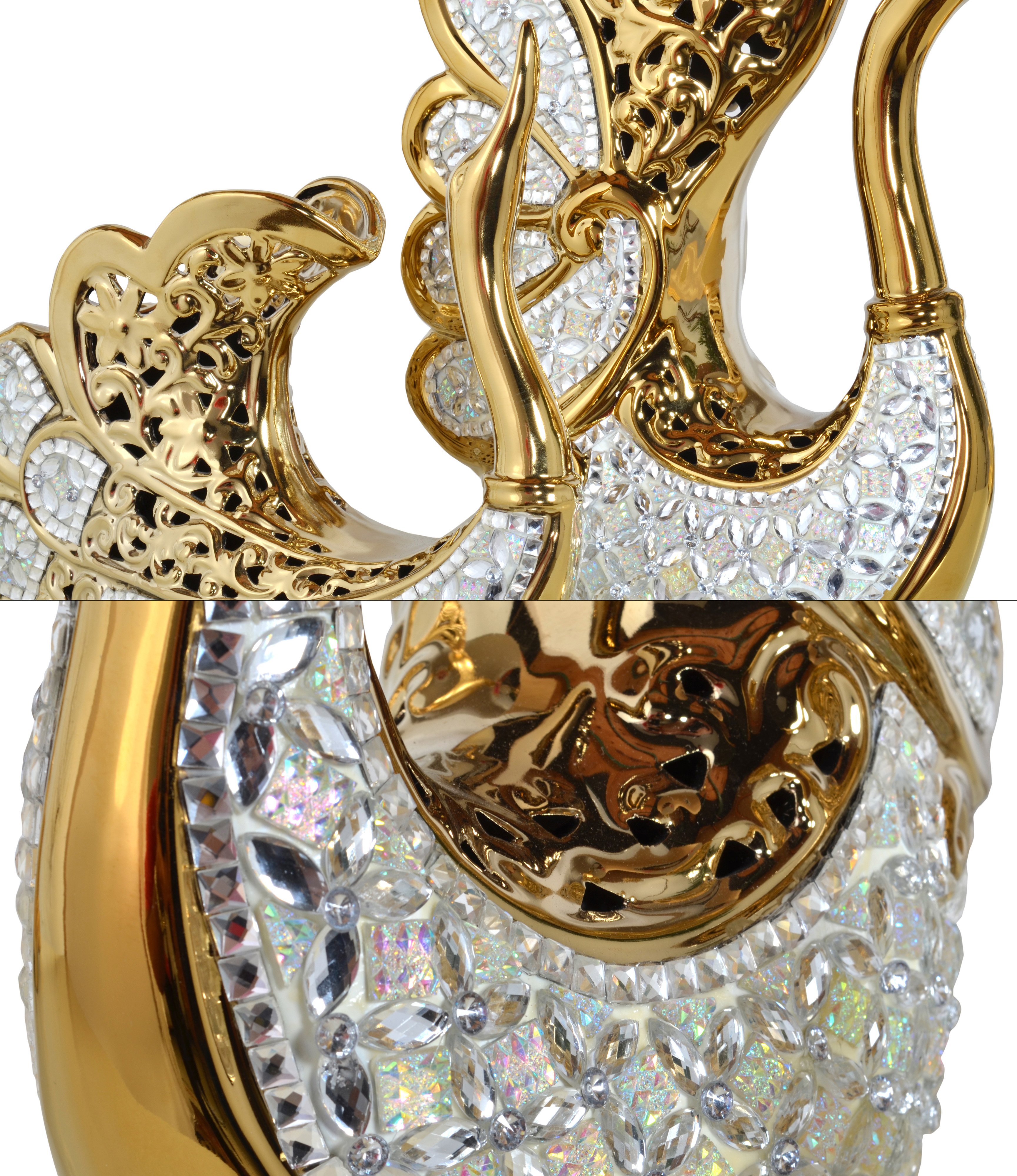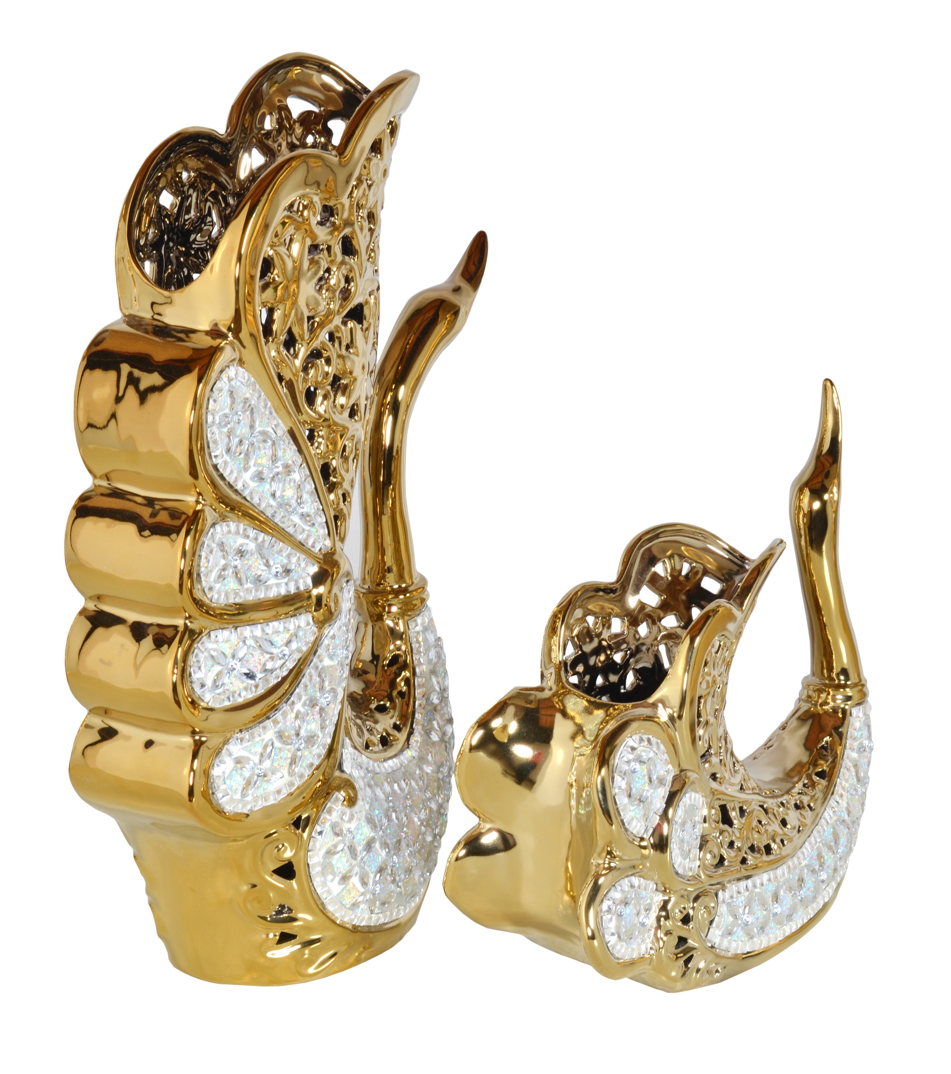 Our set of 2 graduated height Opalescent Swan Vases 16 inches and 9 inches tall is spectacular. These decorative Swans in varying heights and widths are displayed as either statuary objects of art, and through their open-top design allows additional usage as figural flower vases. The set is Hand Cast in Pierced Porcelain. Each is individually hand plated in stunning gold. The artists adorn each with hundreds of opalescent faux gems and crystals. The contrast and design create a striking opulent affect. Set requires no assembly.