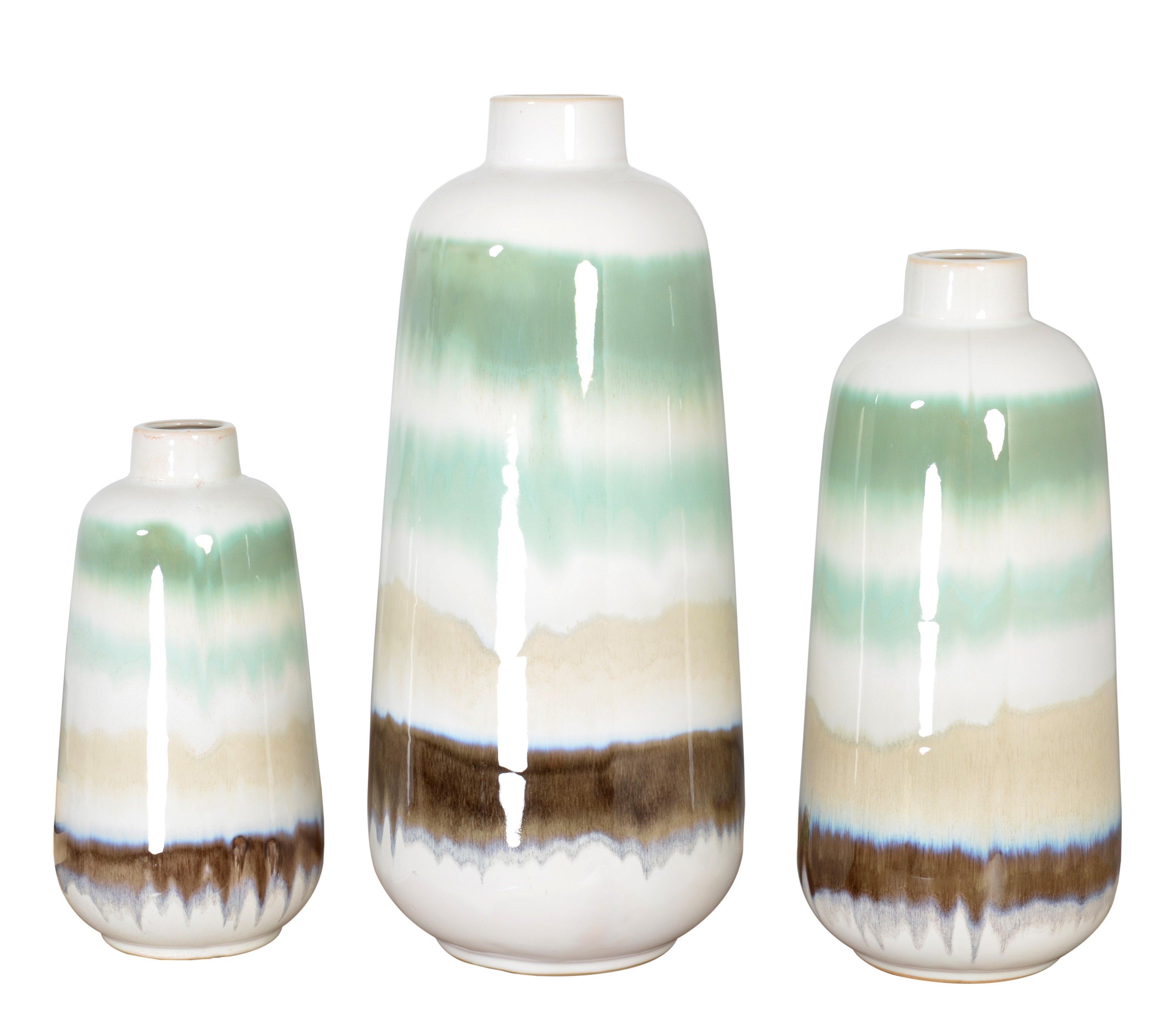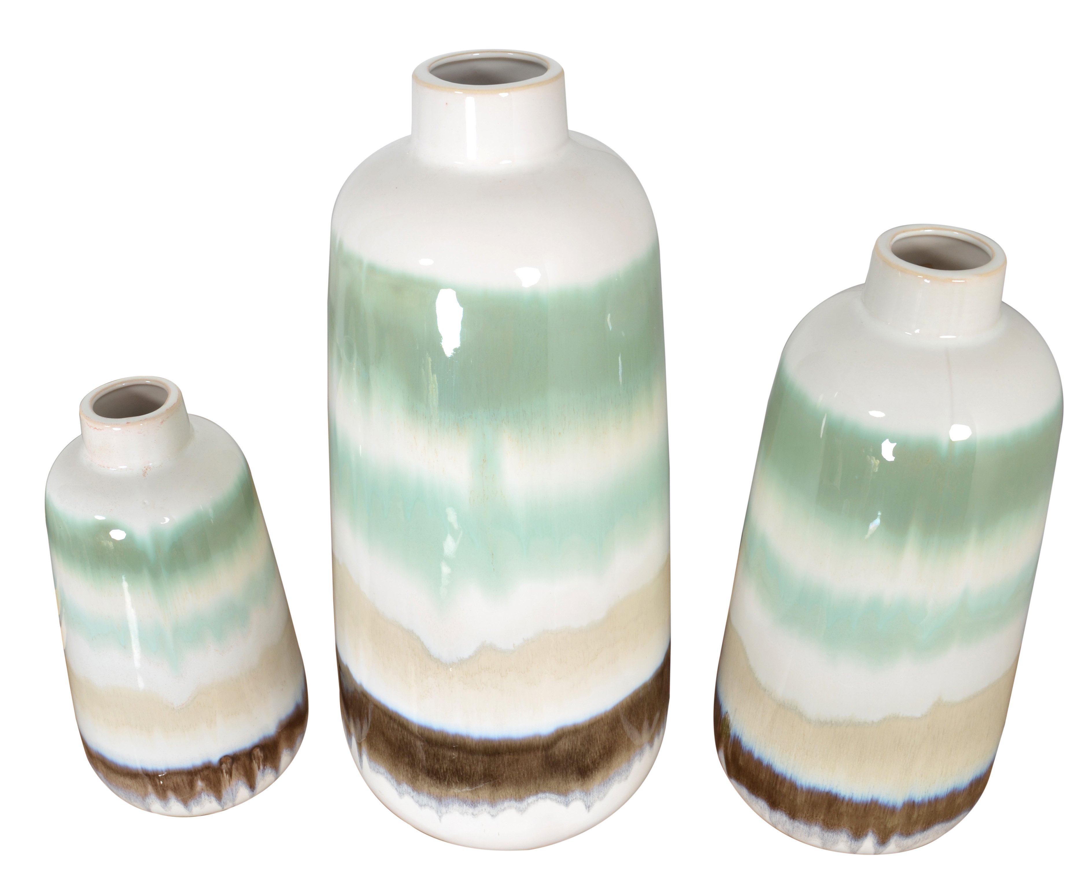 A stylish Green Sand Vase Set of 3 offers three distinct Artistic Vases in varying heights widths. The set is Hand Cast in Porcelain. The finish uses an attractive fusion of different fashionable glazing colors over a white glazed form. They offer an artistic flair to functional shapes. The vases can be enhanced with flowers or used stand alone as decorative Objects of Art. No Assembly Required.