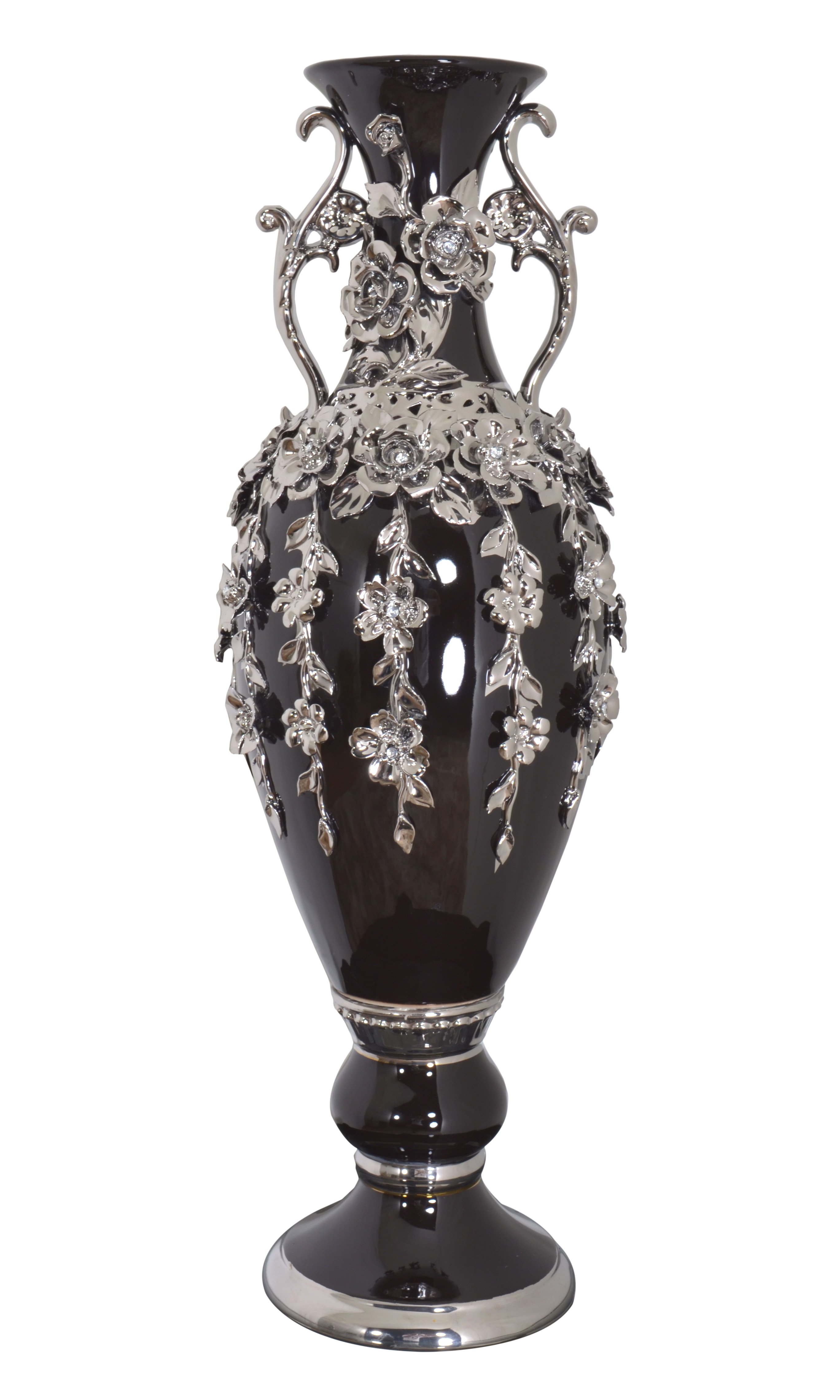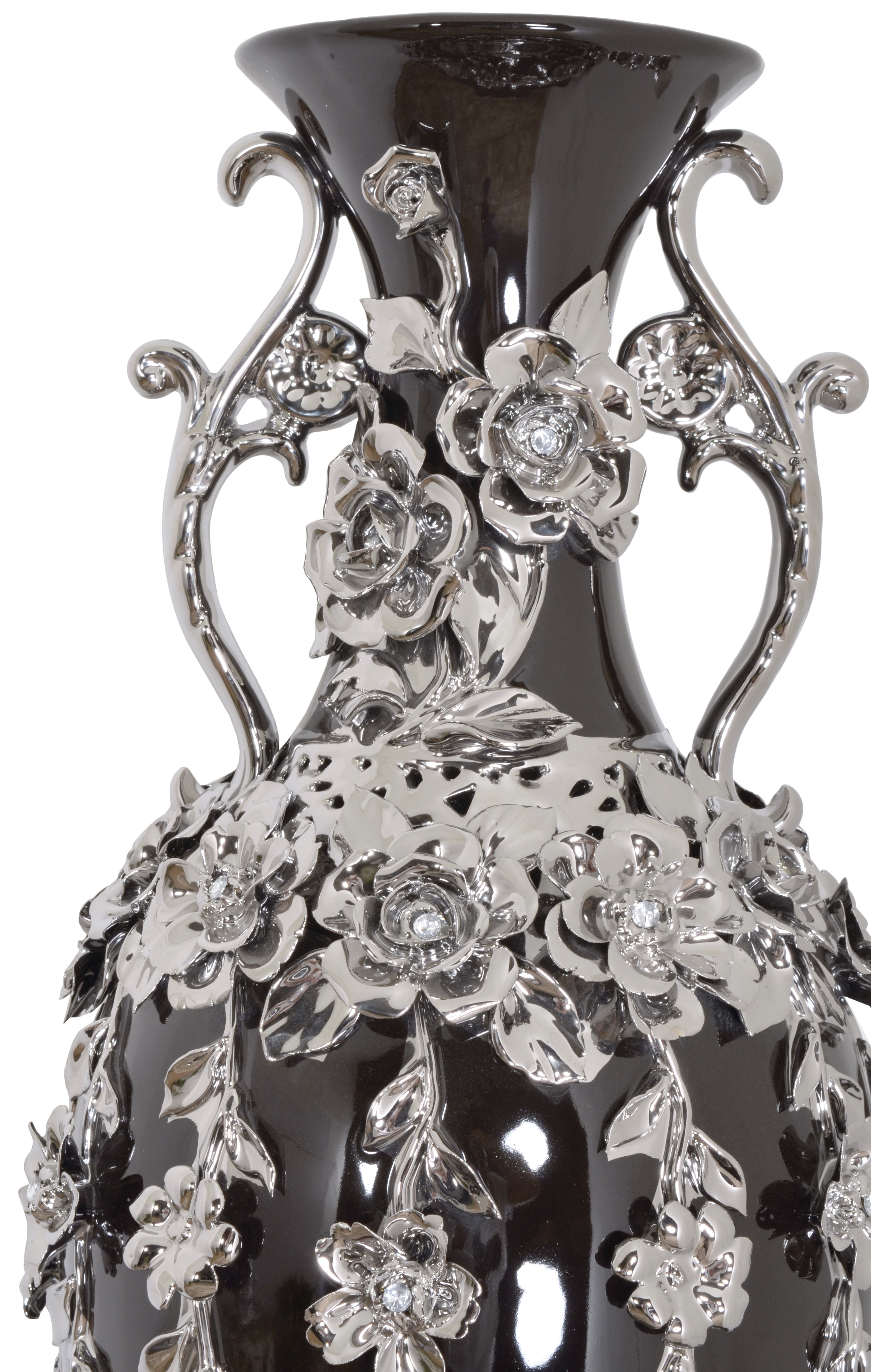 A Stunning Black and Silver Floret Jeweled Vase 35 Inches Tall. The vase is Hand Cast in Porcelain. The finish is a striking combination of Black Enamel and Silver. The vase is adorned with delicately carved dimensional flowers in a hand applied contrasting silver plating with Rhinestone Crystal insets in the center of each Flower. It is a challenging item for the artist who sculpted it and for the casting foundry for its size and delicate nature to recreate, but certainly, a work of art for the owners to cherish and proud of owning. Sold separately but often ordered in Pairs for balance or symmetry. No Assembly Required.