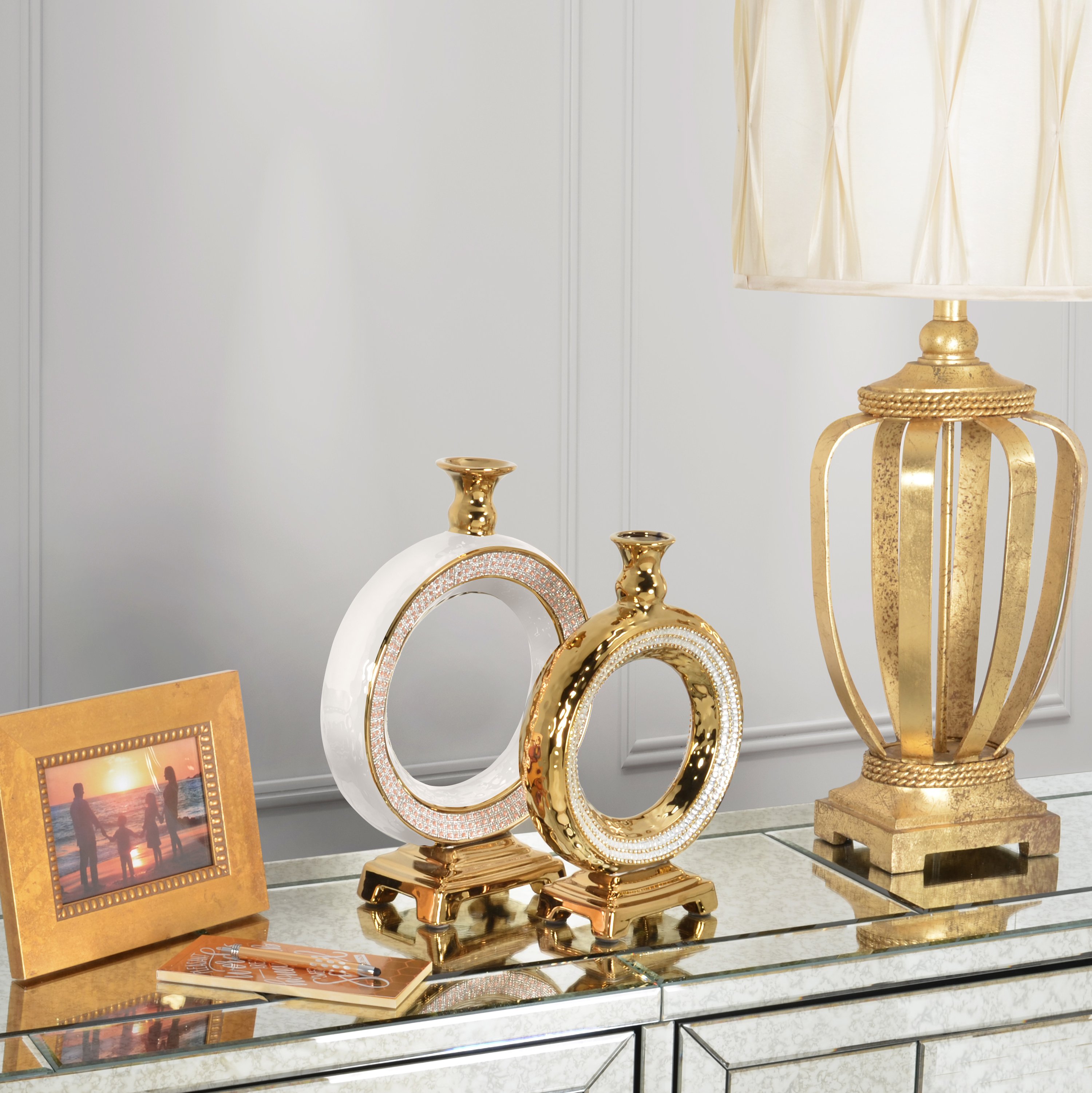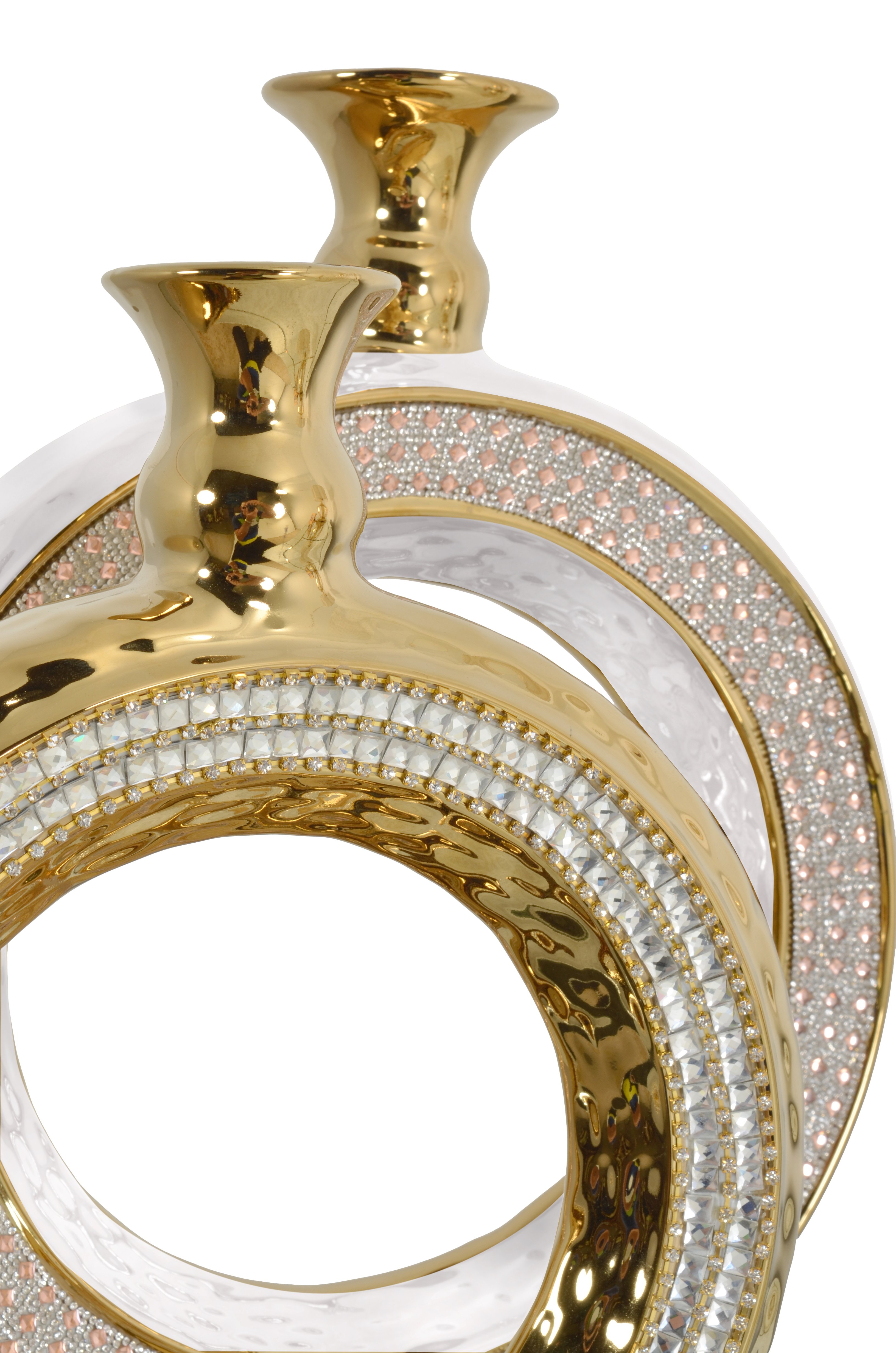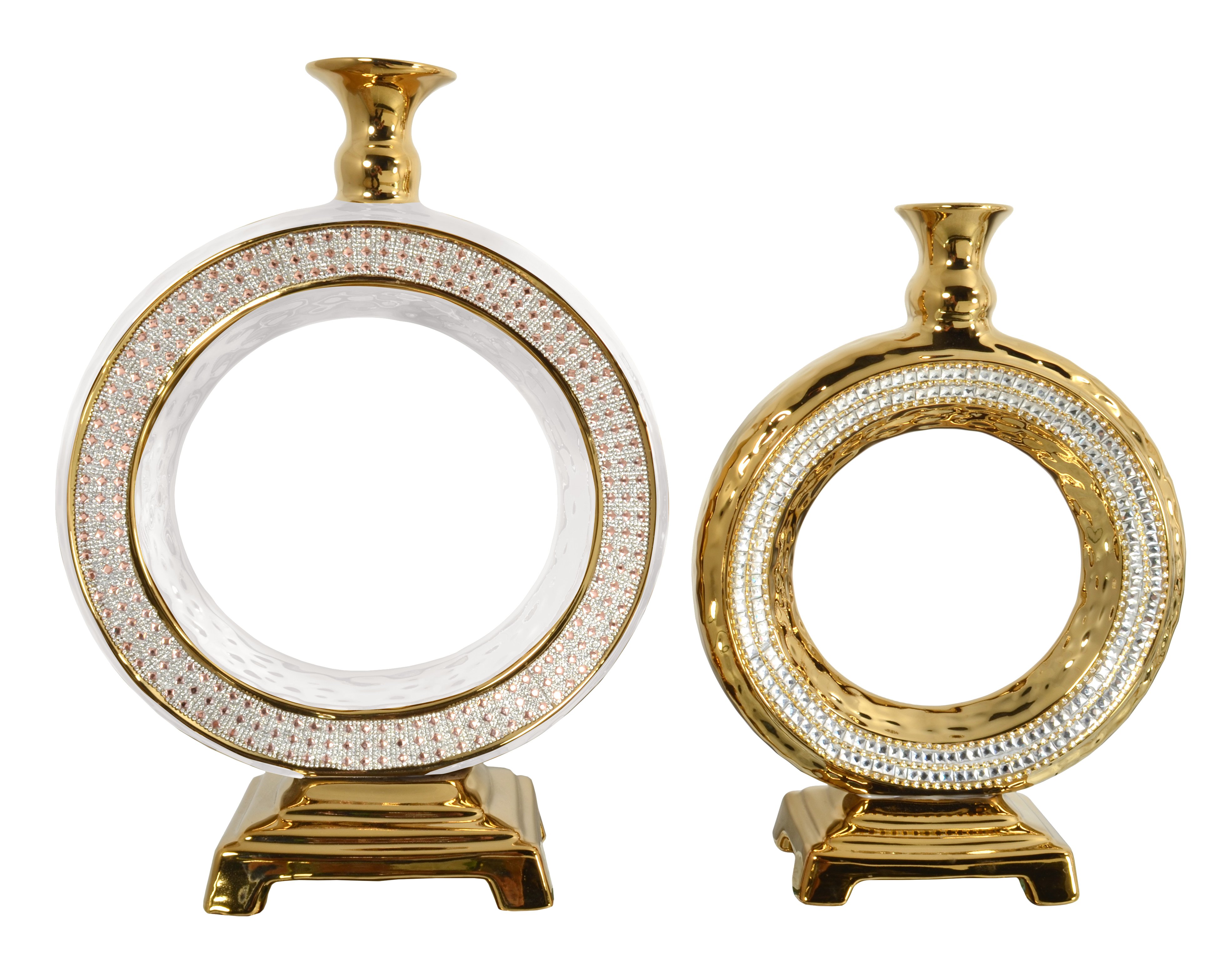 A Set of 2 Modern Circular Rhinestone Vase with graduated, offers use as unique objects of decorative art or as planters. Whether enhancing a traditional setting with a pop of pizzazz or a more contemporary design, they offer a focal point with a bit of sparkle and color that will surely liven up the decor. Each vase is Hand cast in porcelain with gold plating. Each vase features intermittent applied Rhinestone Crystals distinctly different contrasting from each other and adding interest to the pair. The crystal tones used also contrast beautifully against the Gold plated finish on the body of each circular vase. Another unique Hand Made accessory from AFD Home.