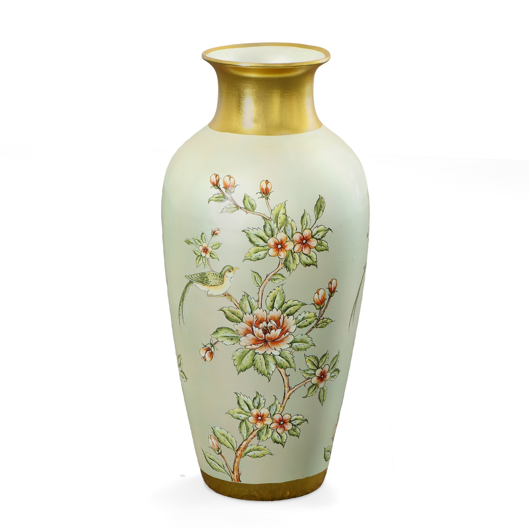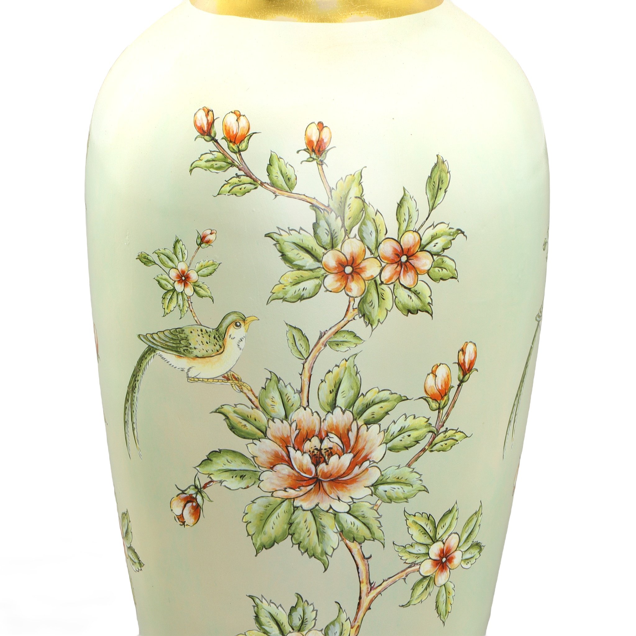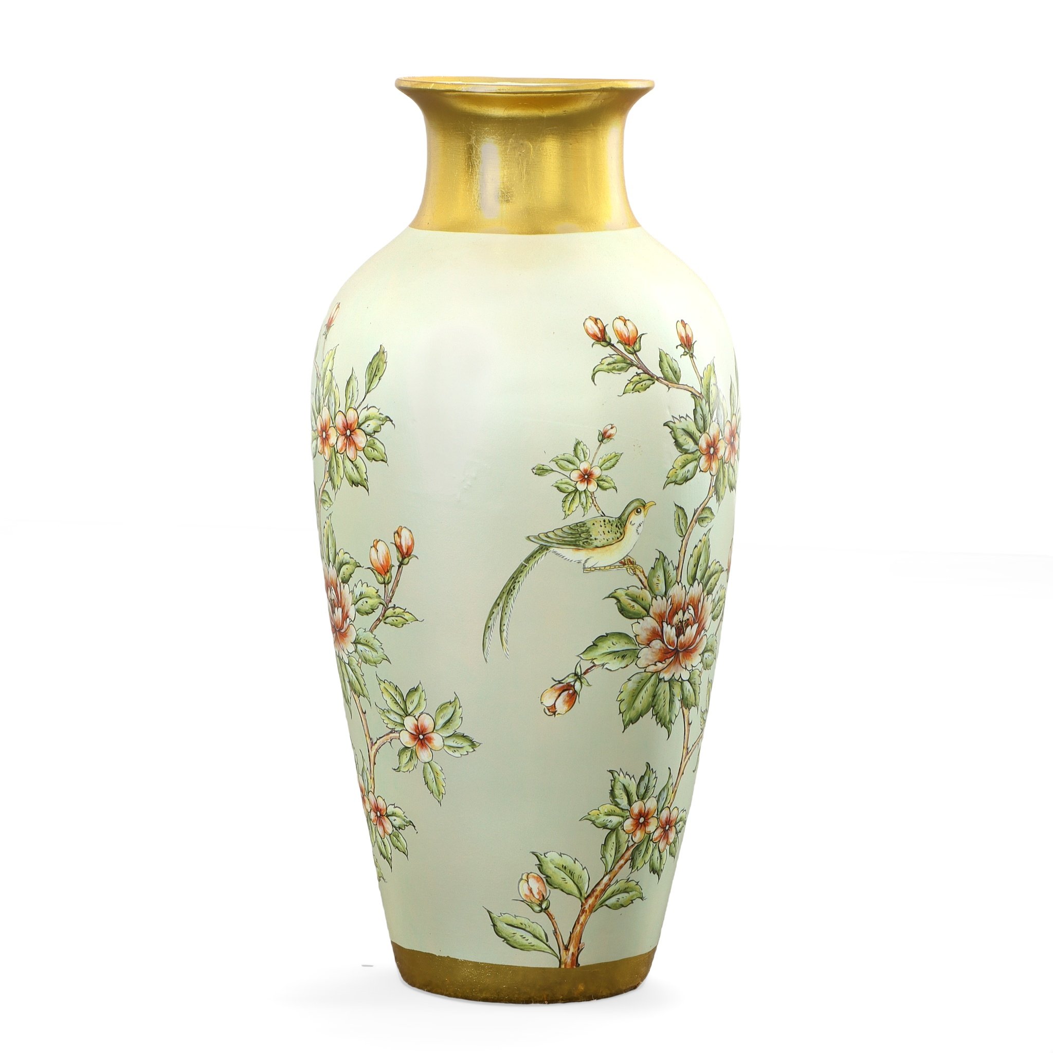 An Aviary Floral Chartreuse 24" Tall Vase. This beautiful vase is part of a new Aviary Floral Series. The item is hand cast in Porcelain and hand-finished is a soft greenish hue, accented with gold. The overall design embodies a delicate pattern of flowers and birds. The item can be combined with other matching items from the collection, and while beautiful enough to stand on its own, it can also be further enhanced as a vase for flowers. Consider ordering a pair for balance or symmetry. No assembly required.