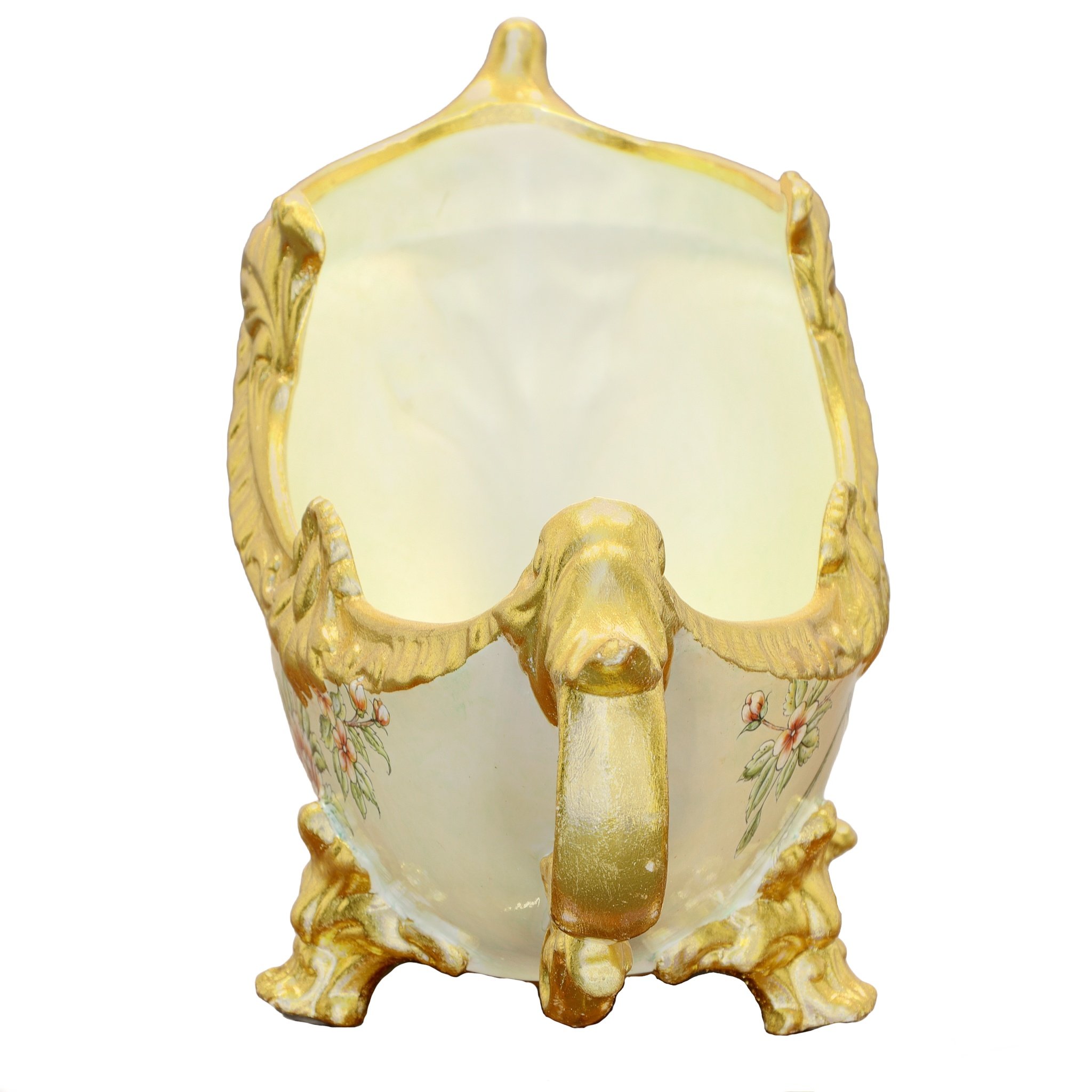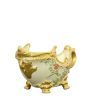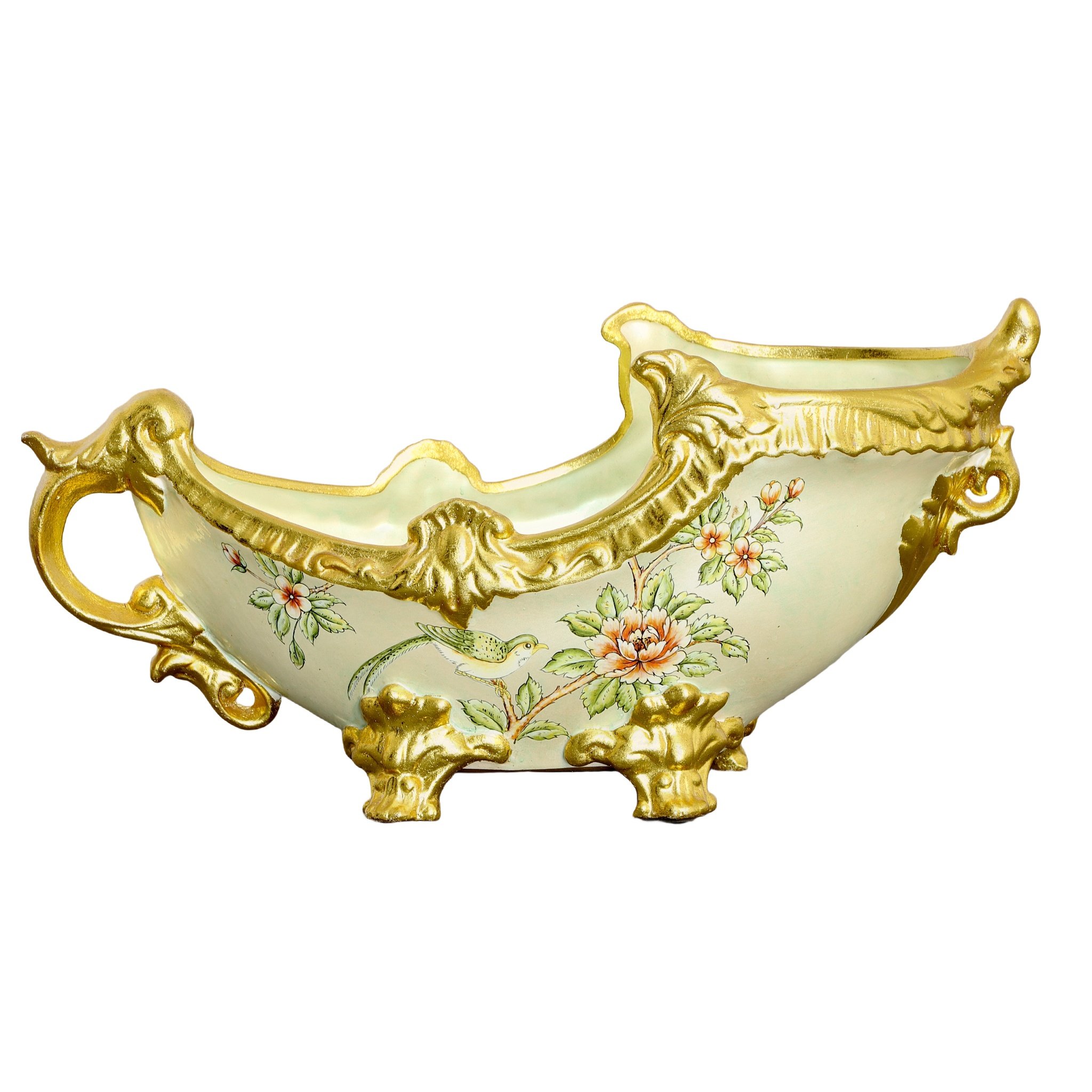 An Aviary Floral Chartreuse Ornamental Vase. This beautiful vase is part of a new Aviary Floral Series with enhanced ornamentation. The item is hand cast in Porcelain and hand-finished is a soft greenish hue, accented with gold. The overall design embodies a delicate pattern of flowers and birds. Consider adding a pair of matching Aviary Floral Chartreuse Ornamental Vases to enlarge your display or beautiful on its own as a bowl for fruits and flowers. No assembly required.