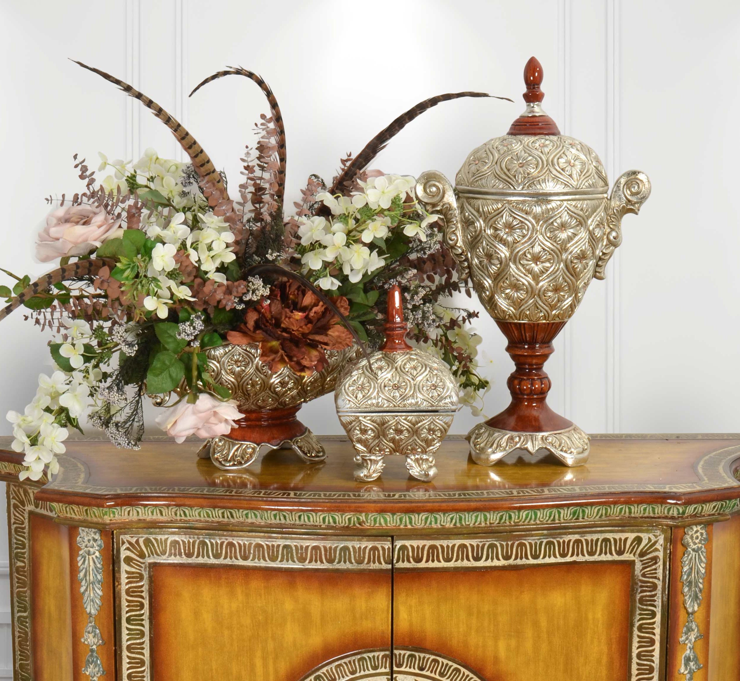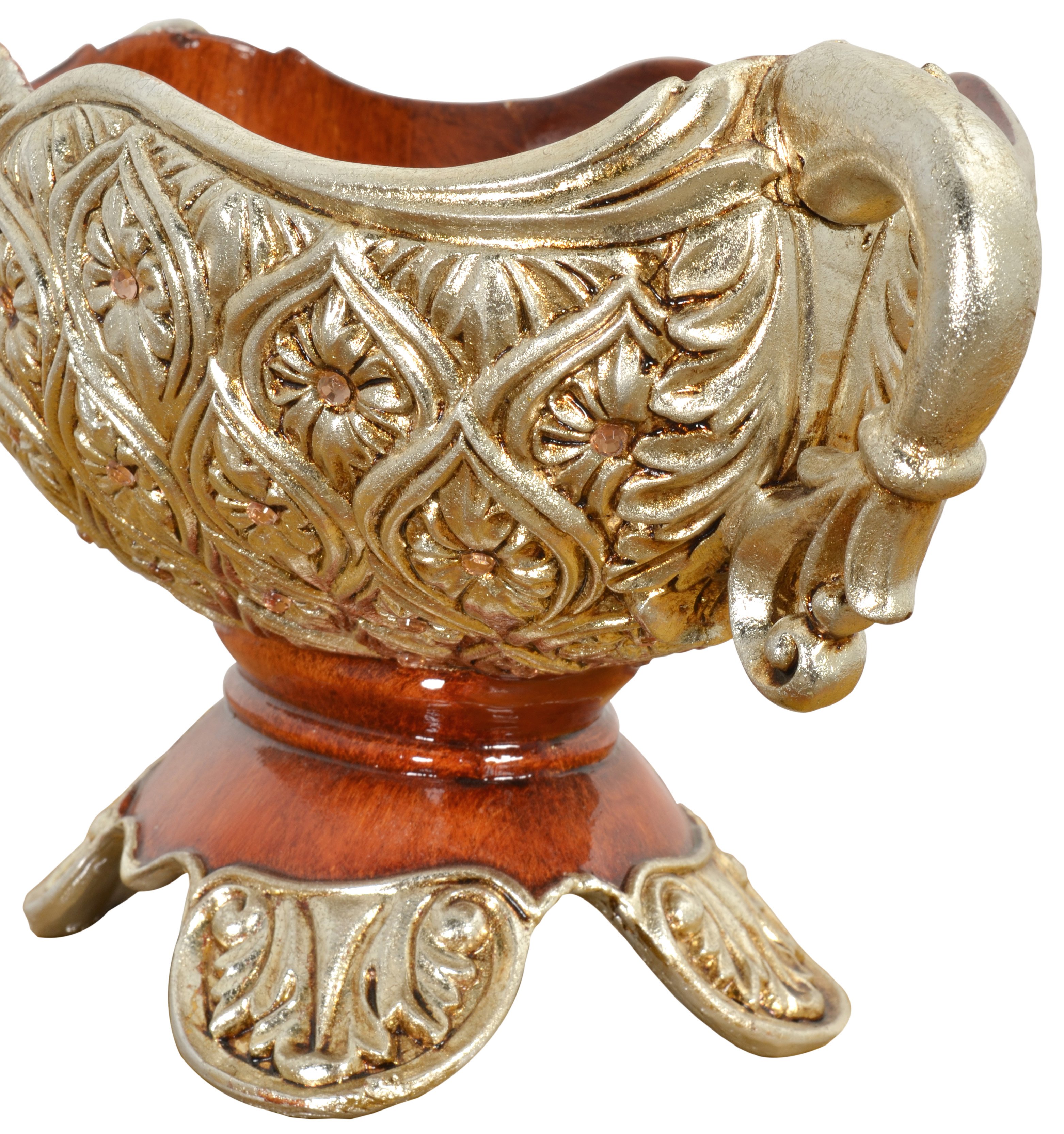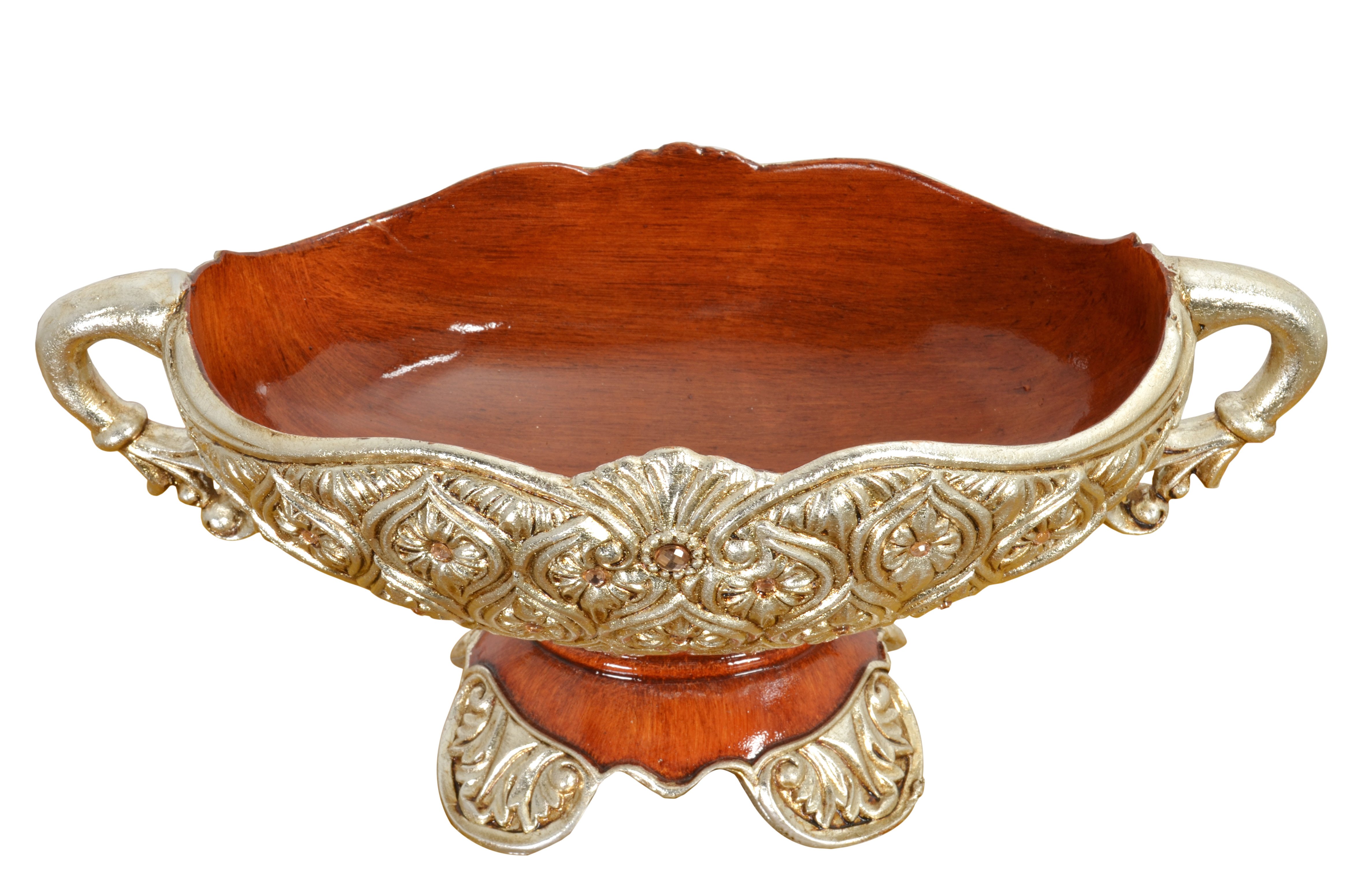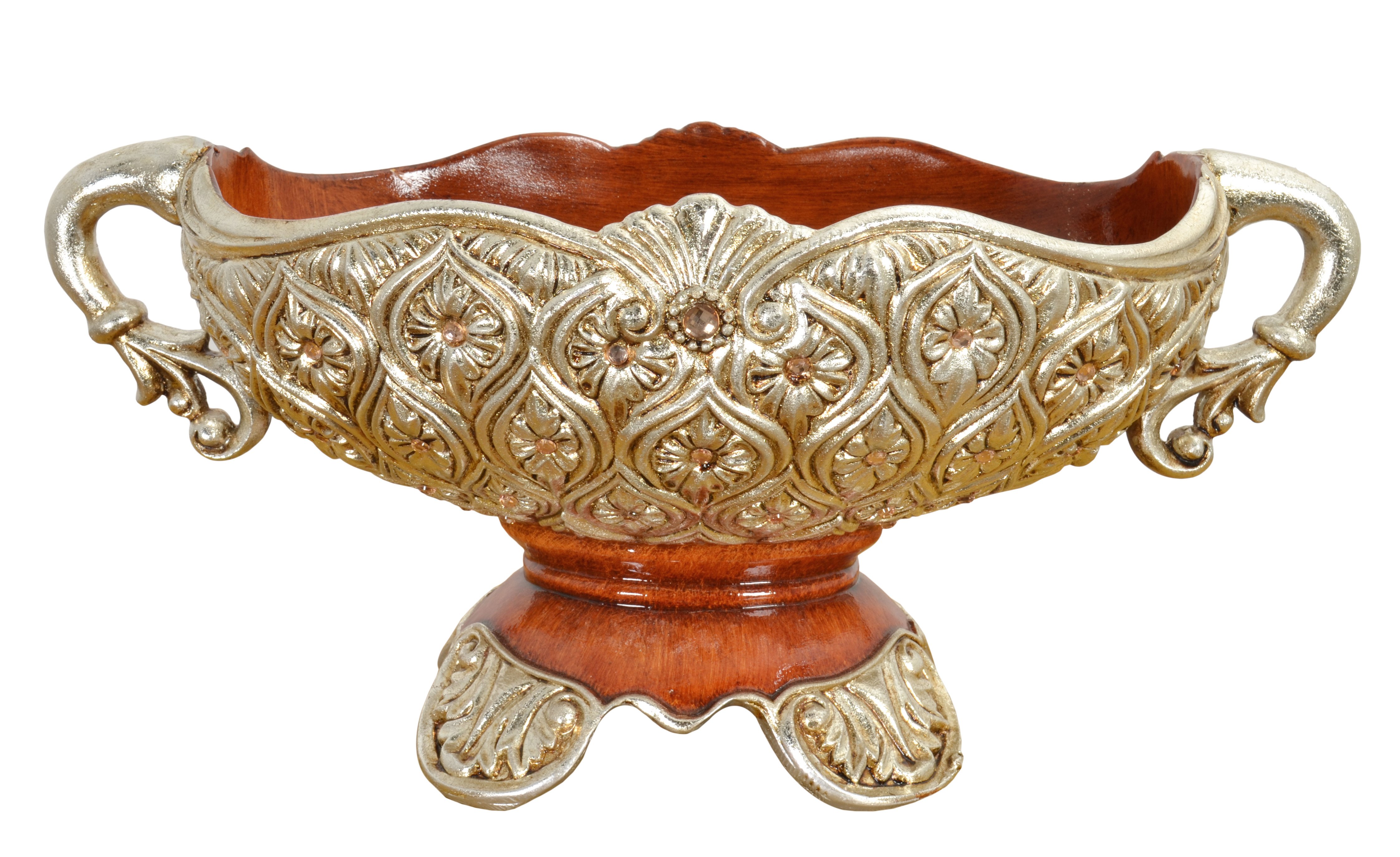 A 16.9 inch wide Valencia centerpiece with Handles from the stunning Valencia Collection, the presence of this collection will become a point of beauty and a noticeable enhancement of any interior setting. The item is hand cast in durable polyresin. Hand finished in a lustrous wood tone with a dramatic contrast of antiqued silver leafing. While this centerpiece bowl offers many applications, consider flanking it with a pair of matching Valencia Urns for a larger tabletop display. No Assembly Required.