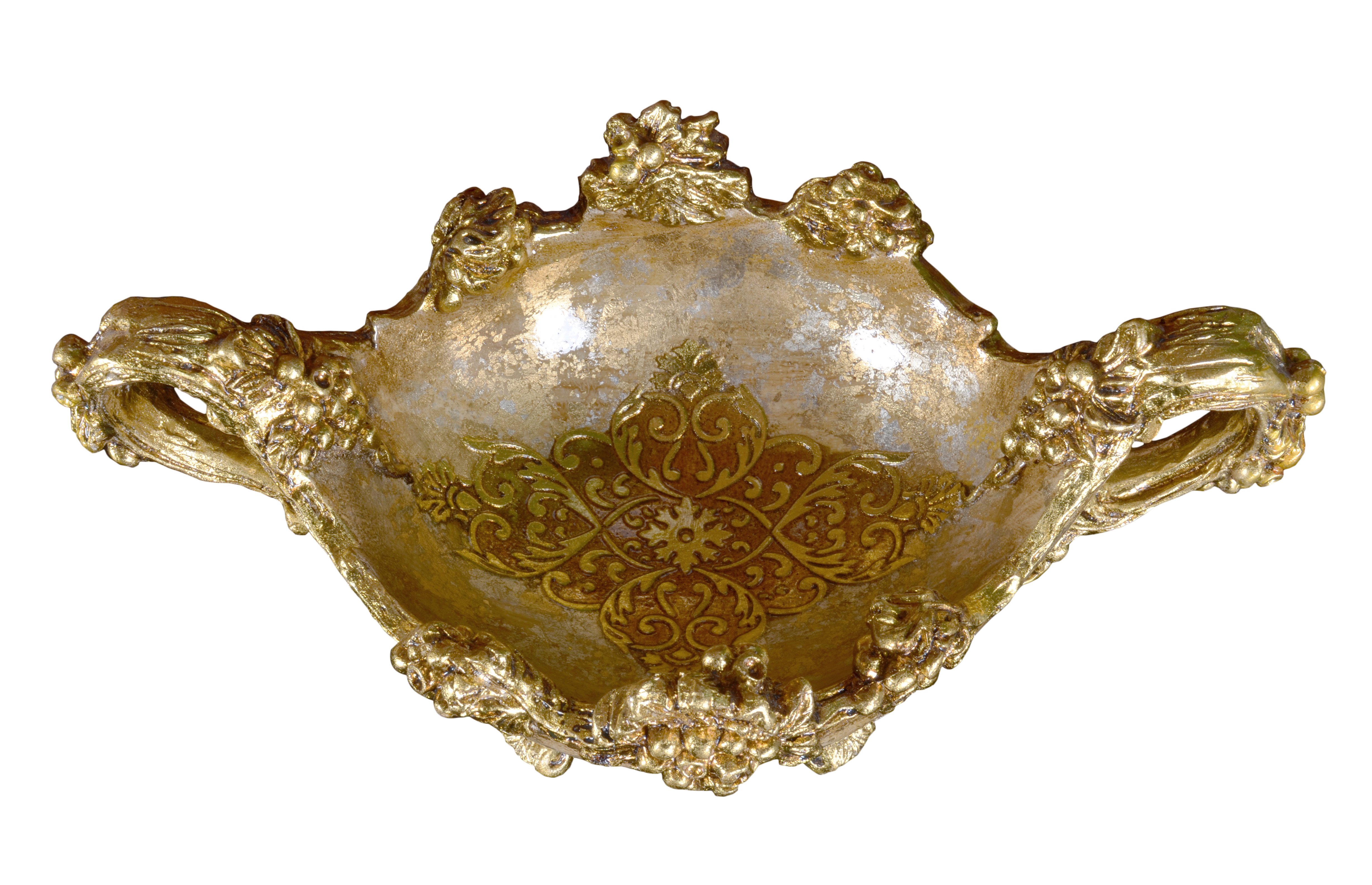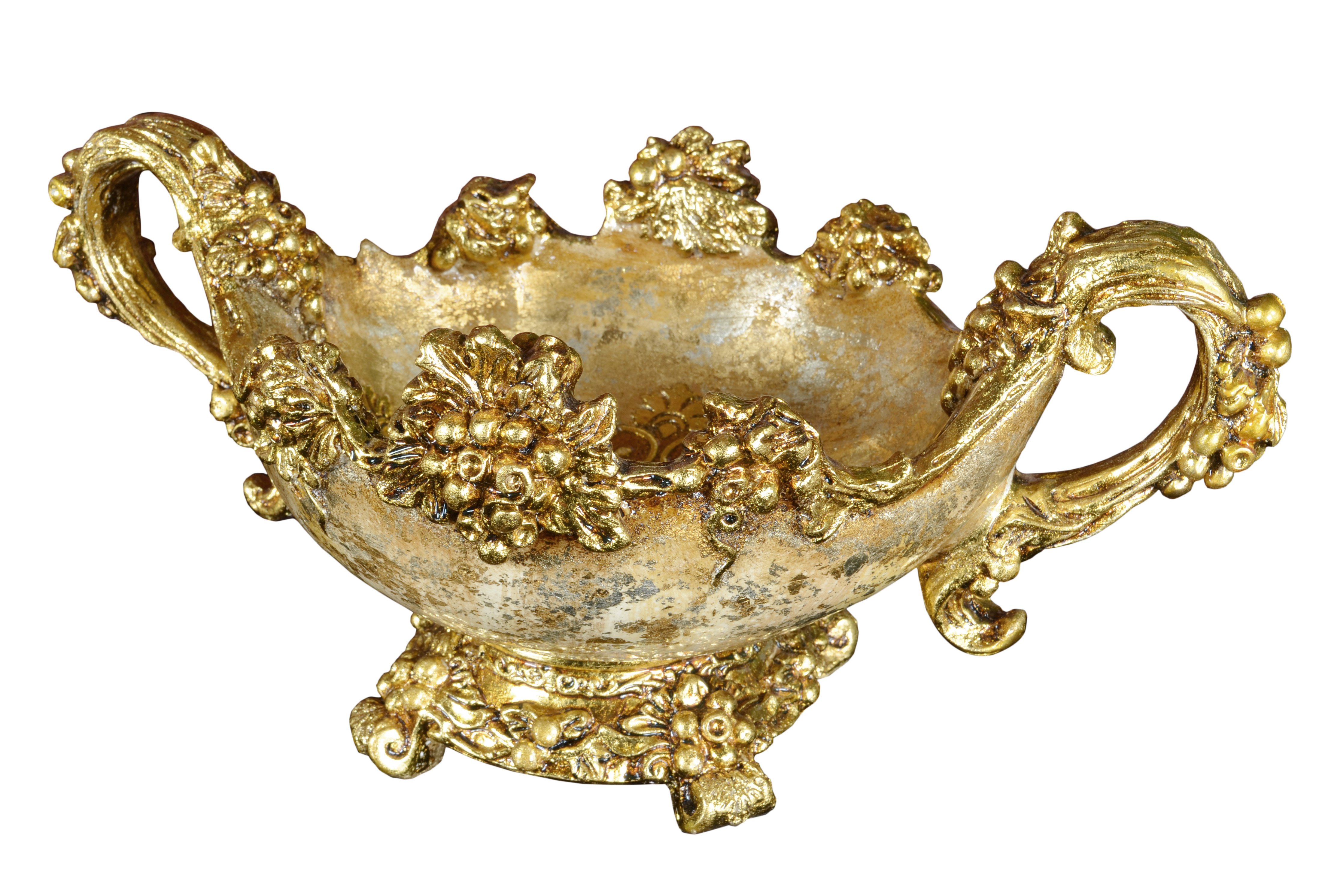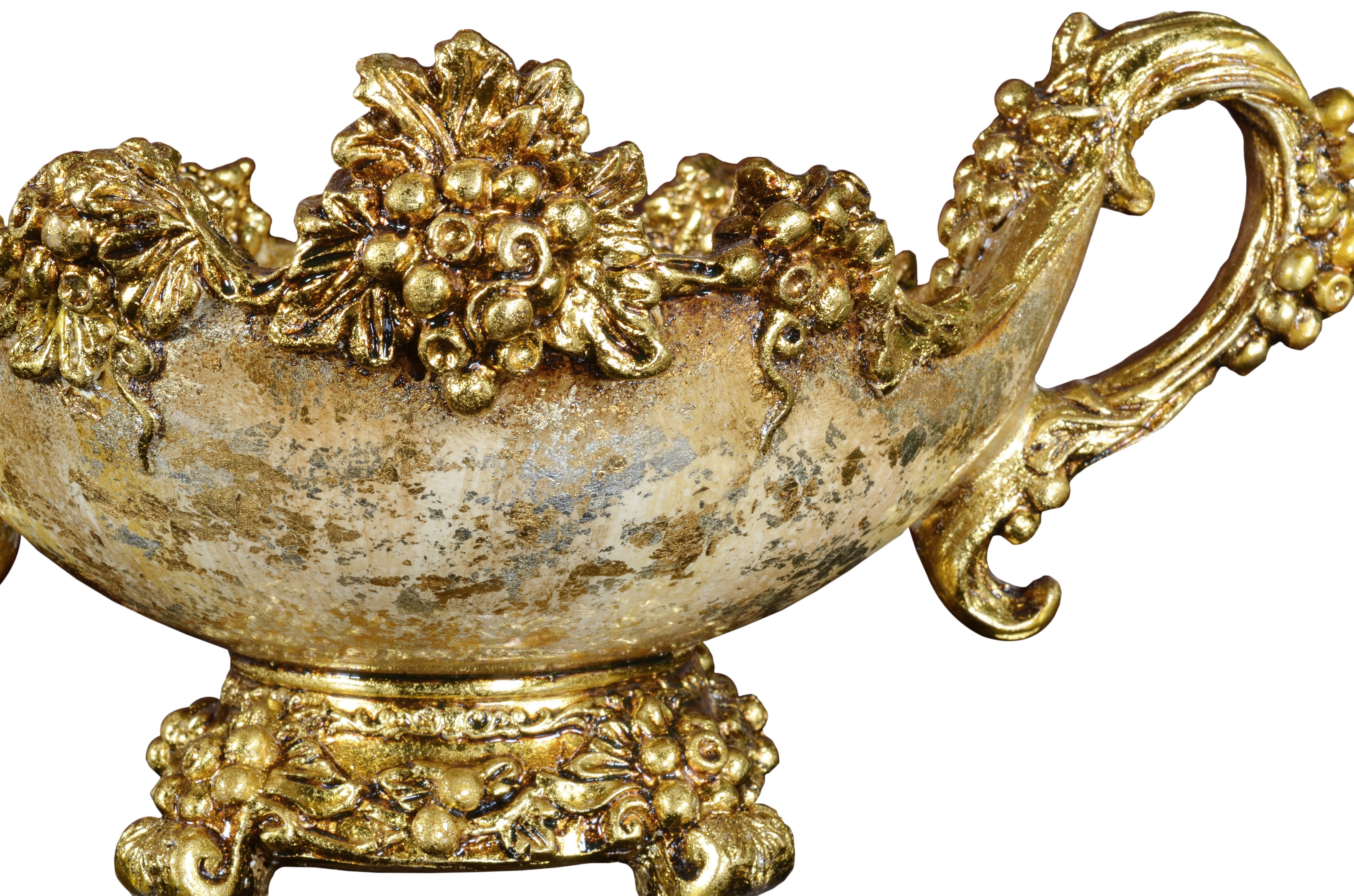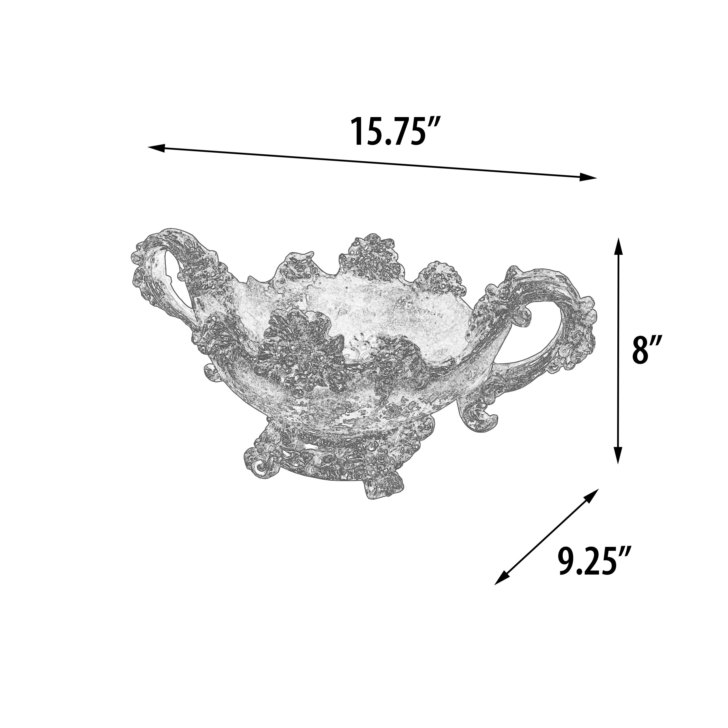 A fine Medici Bowl Grape Vine Design with Handles measuring 15.7 inches wide 9.25 inches deep and 9.87 inches tall, the grape and vine details with an oblong shape creates a perfect tabletop display item. For use as a centerpiece, a server, or a bowl, from our House of Medici collection. A collection inspired by the art of Florence and Italian Renaissance grandeur. The hand finishing in rich jeweled tones creates an interesting contrast with the variegated golds, silvers, and antiquing. Hand cast in durable Polyresin. This item would pair beautifully with several of the Medici vases offered in this collection for a customer wishing to create a larger display. There are many beautiful offerings from the Fabulous Medici Collection to be considered. One of the most expansive collections offered.