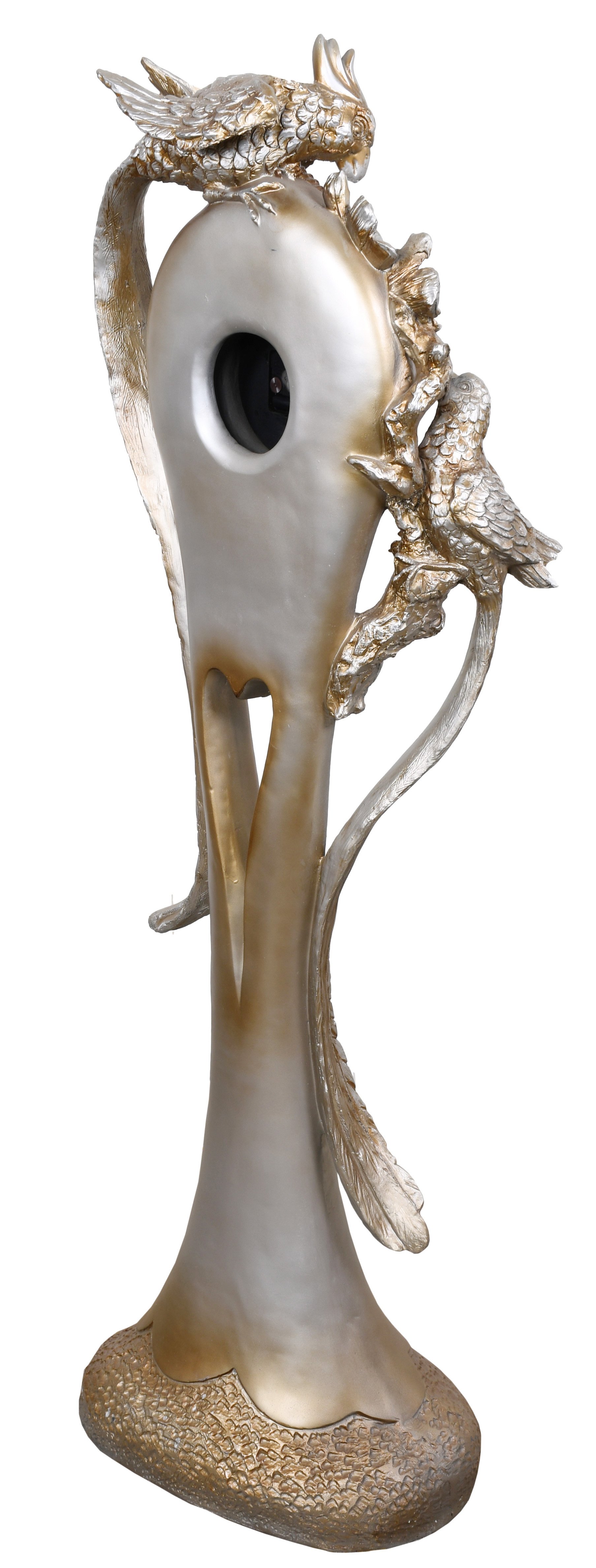 Our Parrot Floor Clock is large, at 17" wide x 17" deep x 52" tall. This standing floor clock is a very unique design that will surely grab attention. The original master was hand carved and cast in a durable Polyresin. The finishing is elegant with a silver base and hand highlighted with golden hues of umber that draws the details and creates a blended overall rich affect further enhanced with the application of Rhinestone jewels. The clock is battery operated. It comes fully assembled.