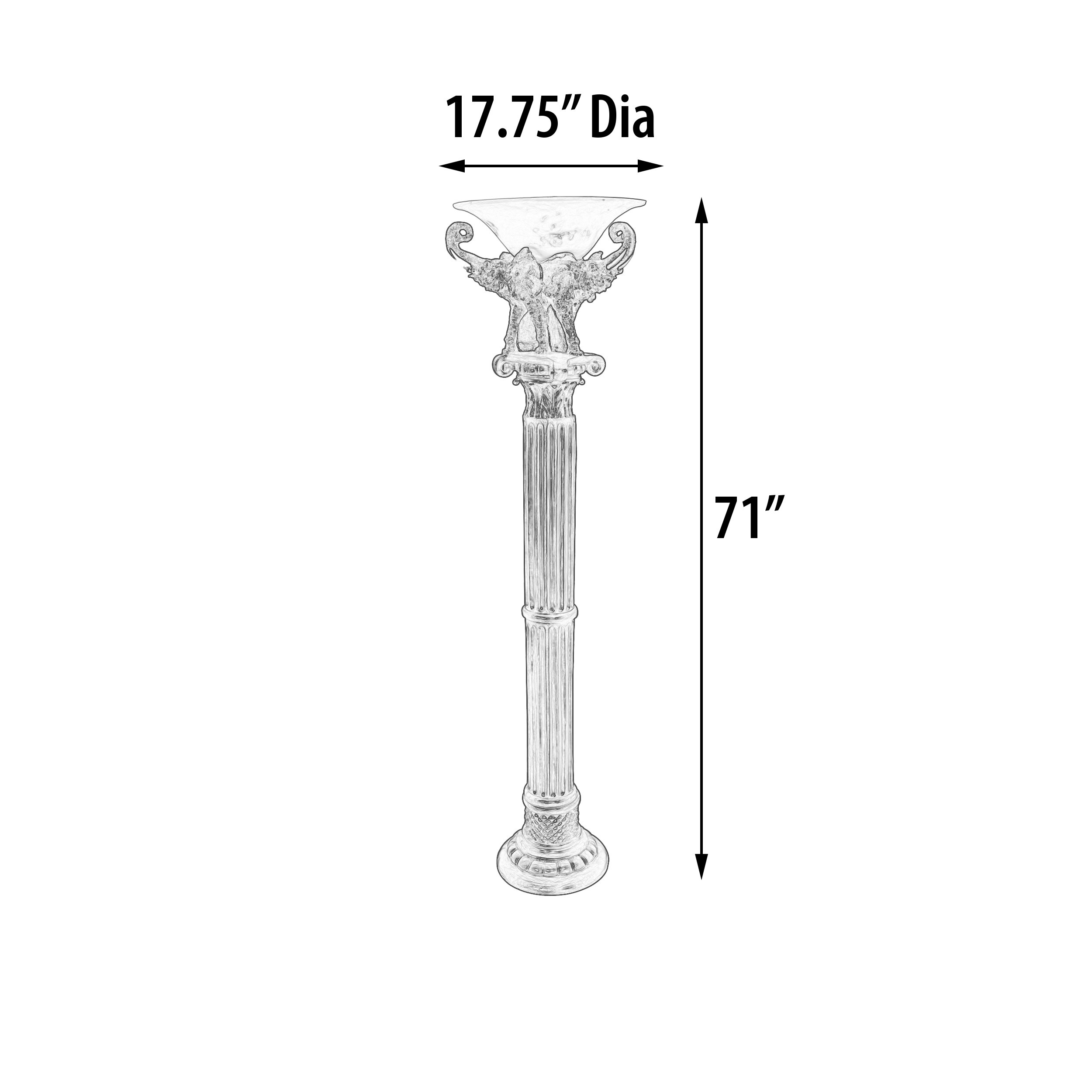 From the Serengeti Accessories Collection of AFD Home, we offer this Elephant large floor Torchiere 71 Inches tall Aptly named after the Serengeti one of the last true natural Habitat's and home of the great Migration. Elephants have always been a beloved and popular subject for Collectables and Decor and now in this creation, our beloved Elephants are also providing Floor and Decorative Lighting. The artist depicts 3 elephants facing outward atop a large fluted ionic column with trunks proudly raised of which a light shade is attached on their backs. The item is hand cast in resin with a metal rod for support and is completely hand finished with brown tones and lighter tones drawing contrast to details, the shade is cast in an antique white translucent resin for emitting light. This is a popular item and customers often order 2 for balance and symmetry. Sold Separately but often ordered in Pairs for Balance. You may also consider adding The Elephant Candle Holder Set of 3 or Elephant Grand Serving Bowl, also available from the Collection. The wiring and socket are UL listed. Bulbs are not included but the item takes standard E27/26 bulbs with a wattage up to 60 watts. Catalog:DTL-7120815 Dimensions:20.50 x 20.50 x 71.00. Assembly Required.