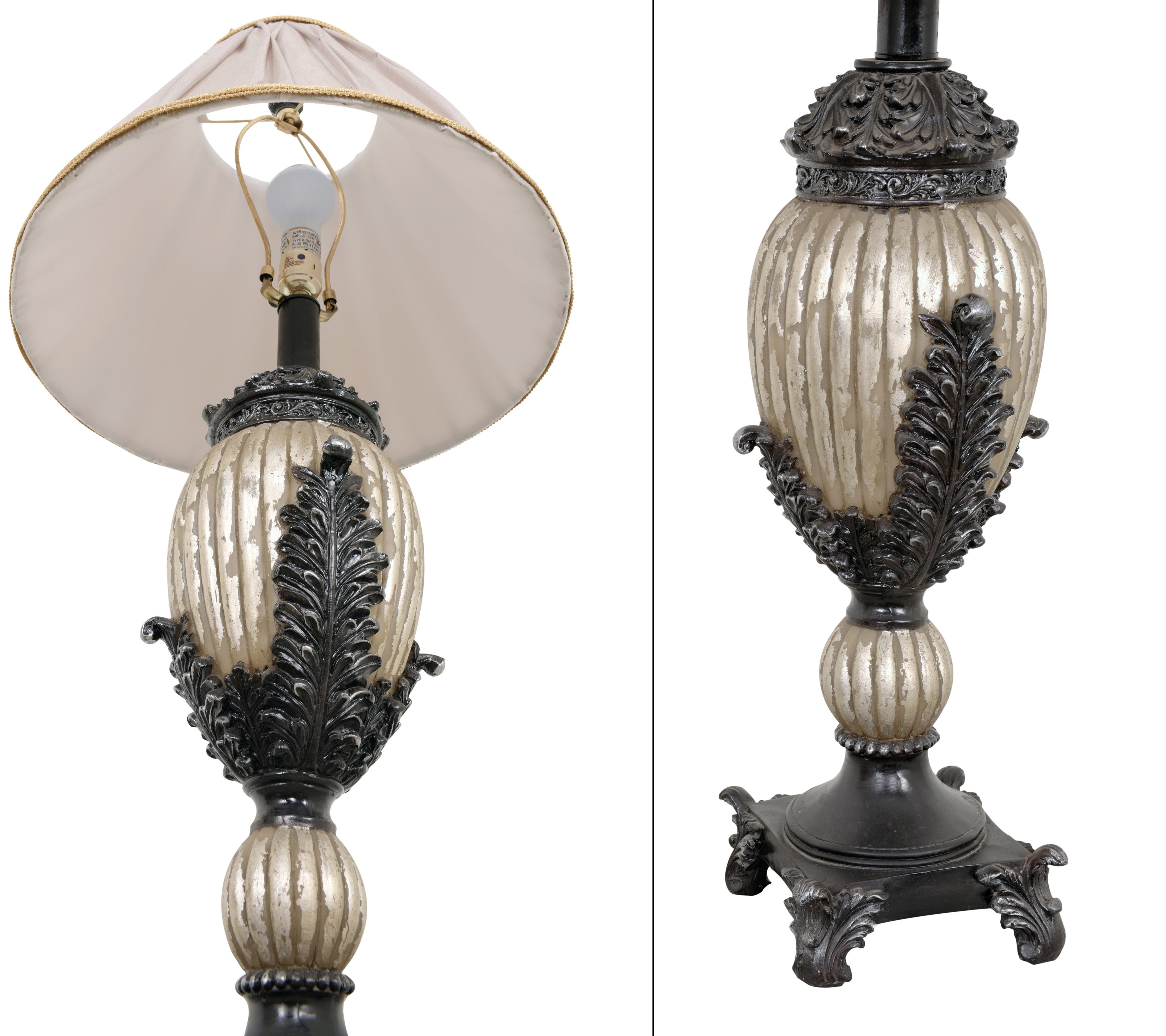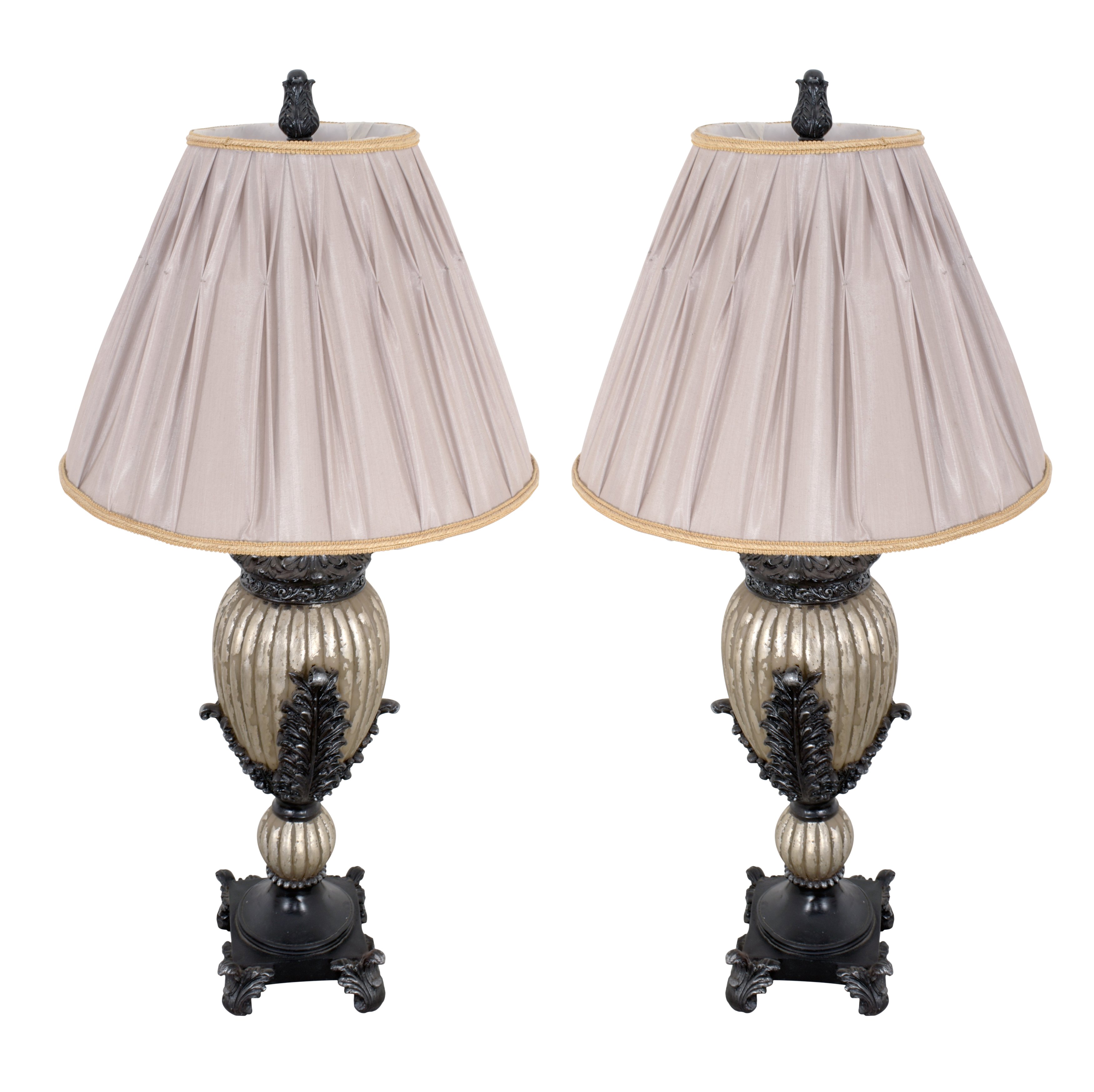 An elegant pair of lamps, accented with acanthus leaves on footed pedestal. Hand Cast and Hand Finished using an alluring Shabeen Silver Metal Leaf over an opalesque poly resin form. Final dark antiquing is rubbed on to bring out the carved details and undertones, giving each piece uniqueness. The shade is pleated with corded detail accents on the top and bottom. Each lamp comes with shade, harp, and lamp base. The wiring and socket are UL listed using standard E27/26 bulbs with a wattage up to 40 watts. Bulbs are not included.
