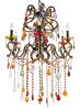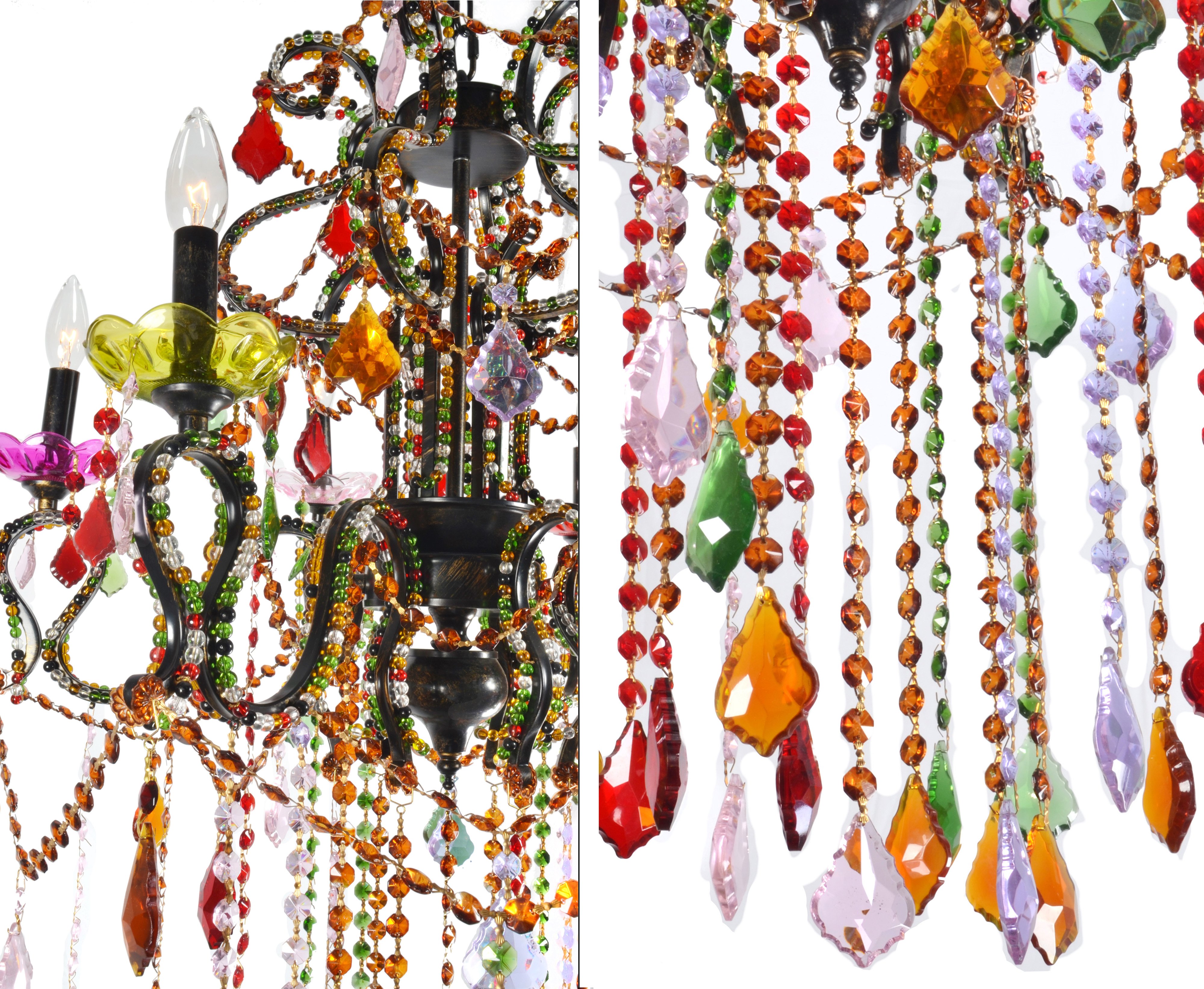 The Milano Chandelier is a unique and spectacular design offering a full spectrum of Crystal Colors. A surprising spectrum of warm colored rhinestones and glass Crystal are offered in both the dressing crystals of this beautiful Chandelier and combined with mutli-colored cabochons beads that define each undulating forged Arm that hold multi colored Bobaches and Lights. The Chandelier is hand constructed in Forged Iron, Crystal and Glass. It features 6 lights and each light holds up to a 25 Watt E12 standard Candelabra bulb. Bulbs are Not Included. It is UL Listed. The Chandelier comes fully assembled in box but requires hanging of crystal and when fully dressed weighs 21.12 lbs. The Grand Milano is the largest of the Milano Chandeliers for a larger offering consider the Milano Grand Chandelier 32.25 x 32.25 x 42.50 inches tall and customers, who love this collection will also love the beautiful Milano Candelabra Lamp. The Milano Collection is exclusively brought to you by AFD Home Collection.