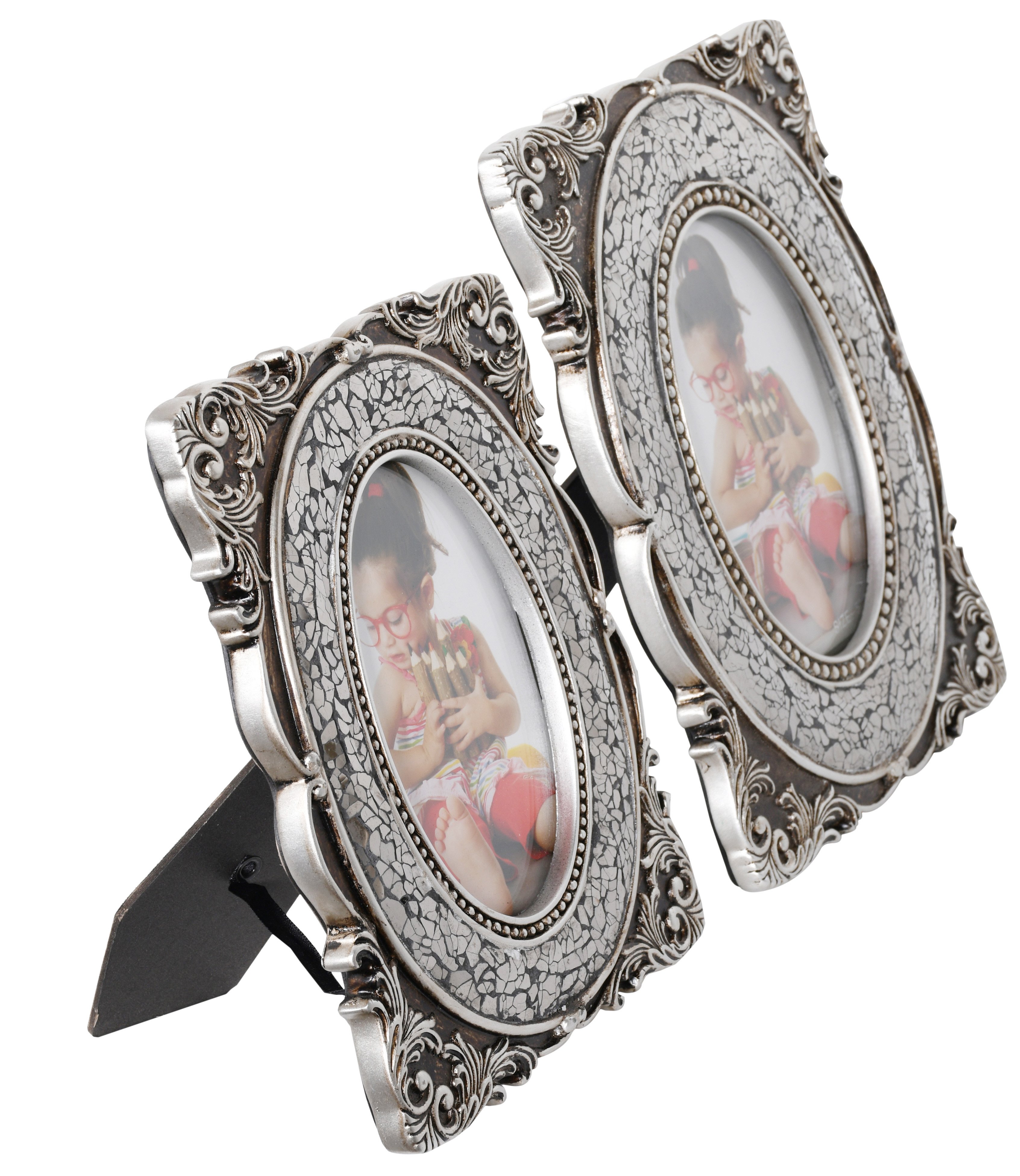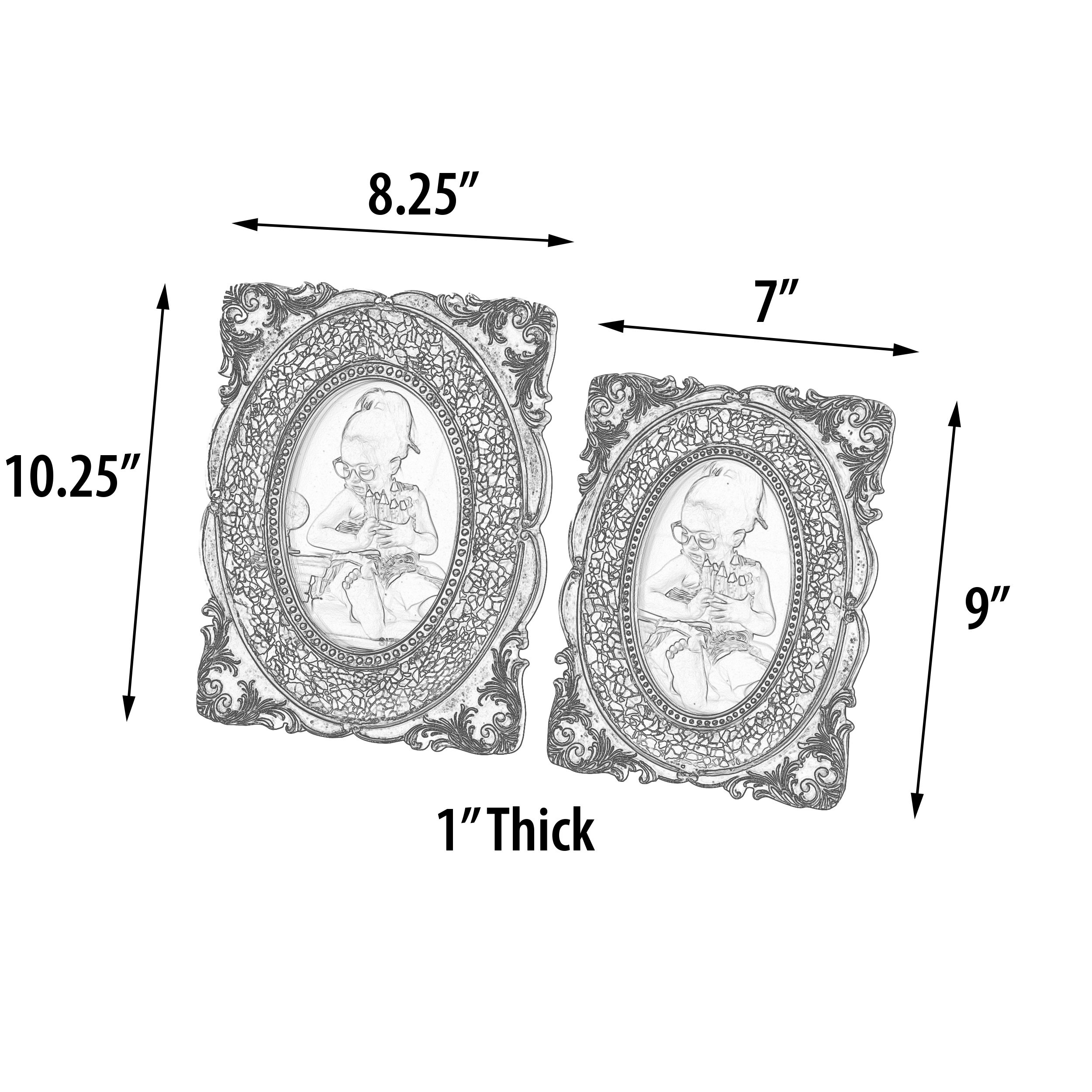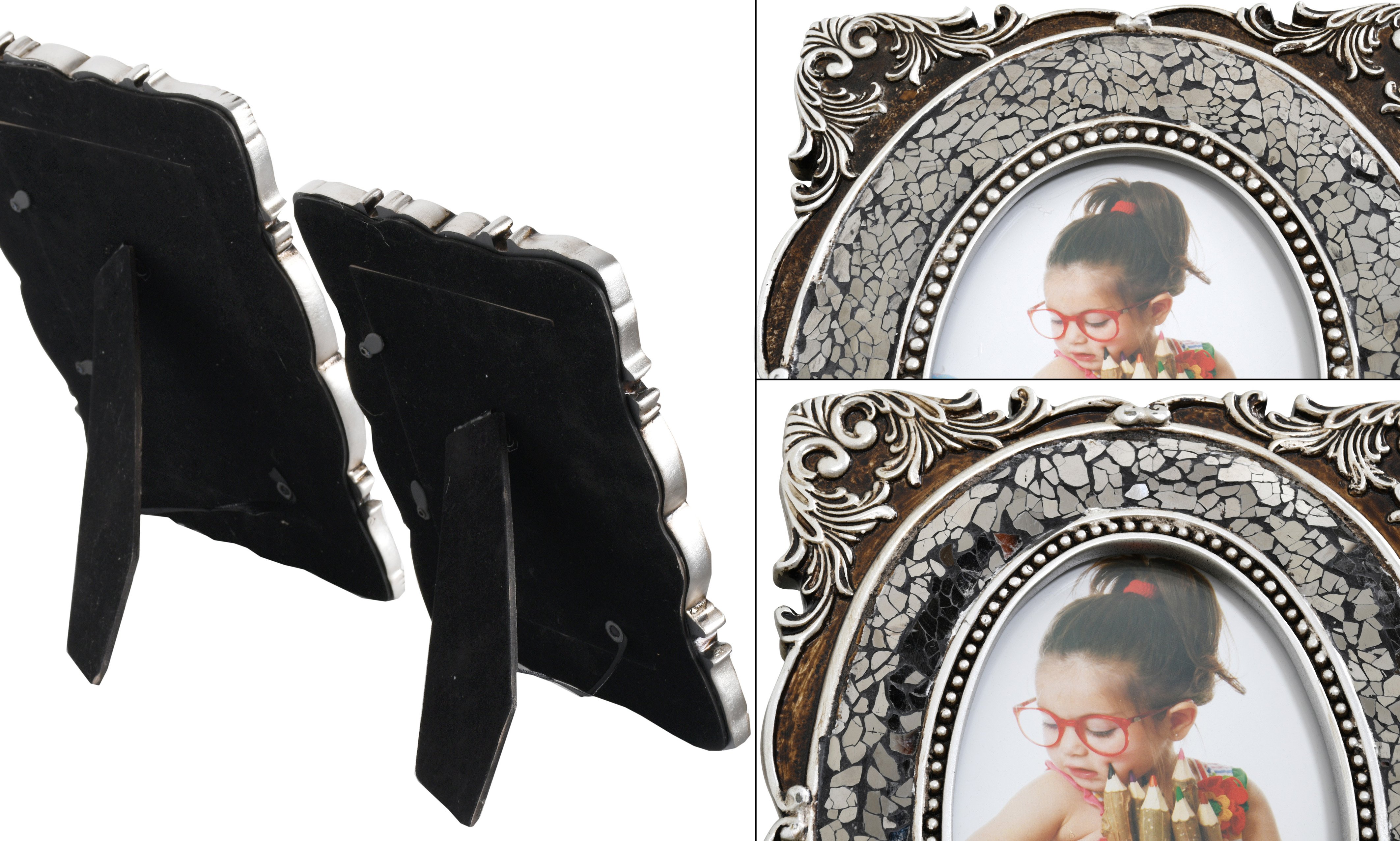 A beautiful stet of 2 photo frames adorned with hand laid micro mirror mosaic tile. The photo frames are 4x6 and 5x7 with a removable backing to insert the photos. Each photo frames border has delicate scroll details and is finished in silver with black undertones.