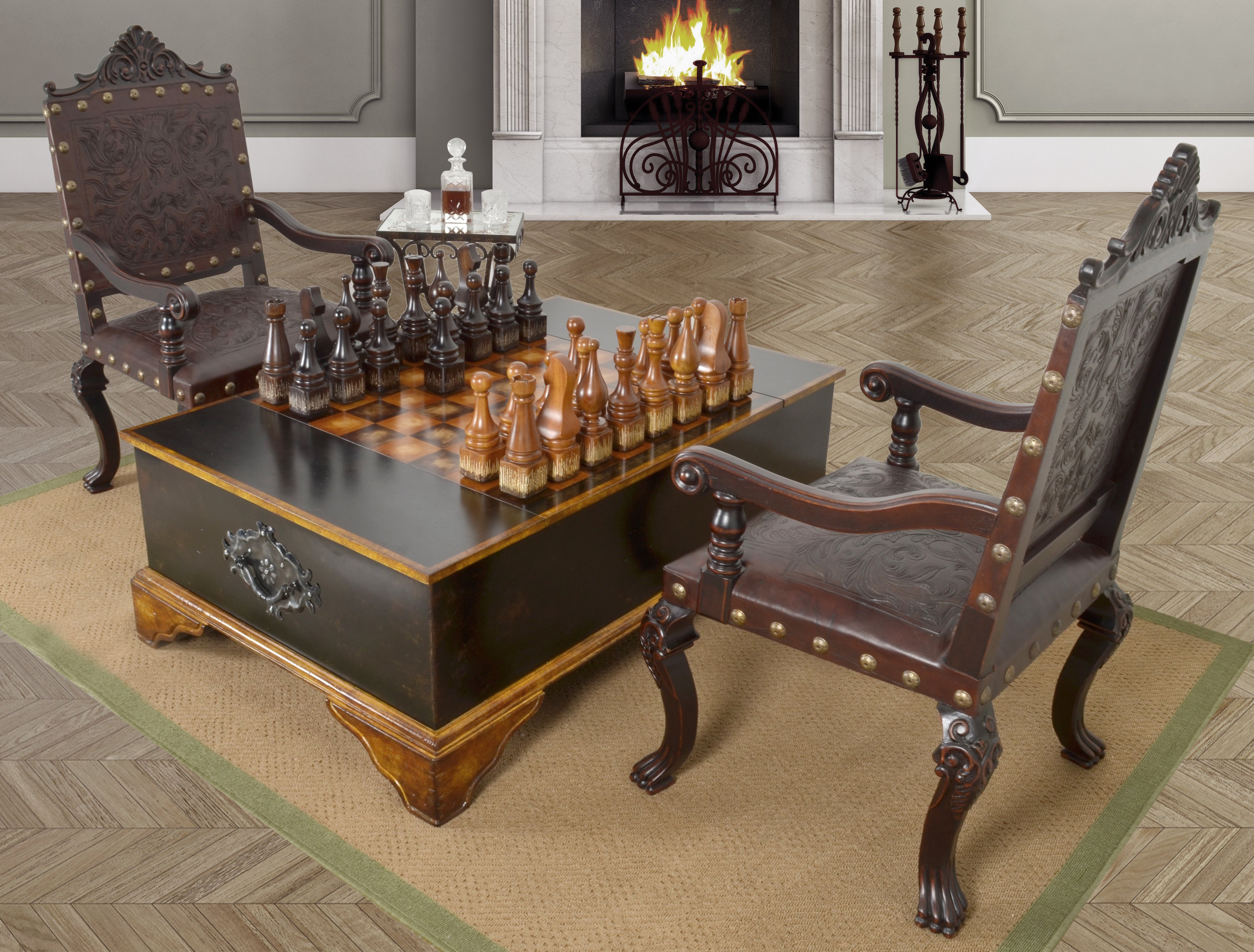 The Ebony Chess Set Coffee Table is a top selling decorative cocktail table with added game function. It has a 55" width and a depth of 37" and features a full set of 32 large hand carved Chess pieces that can be displayed or neatly store away on each side in the barely noticeable large compartments designed into the top that lift with concealed piston hardware. The table has a hand painted chess board top and boasts hand hammered and forged hardware mounted on a warm light and dark brown hued cabinet. The table is part of our Santa Lucia Collection which consists of handmade, hand painted, and distressed solid wood furniture making each piece a timeless investment. Hand crafted treasures made one piece at a time, under one roof, by our exclusive family owned manufacturer from Lima, Peru. Their master artisans are skilled in furniture making techniques influenced by the Spanish during the colonization of Peru. Many items in the diverse collection feature specialty hand painted finishes that have also been passed on and perfected from generation to generation. The family strives to be environmentally friendly by using woods re-purposed from haciendas and old colonial homes as well as wood indigenous to South American forests, primarily mahogany, cedar, moena and requiem. If you are a lover of beautiful painted furniture, find hill country rustic romantic, or find richness in Mediterranean lore Then you too may fall in furniture love with this fine collection.