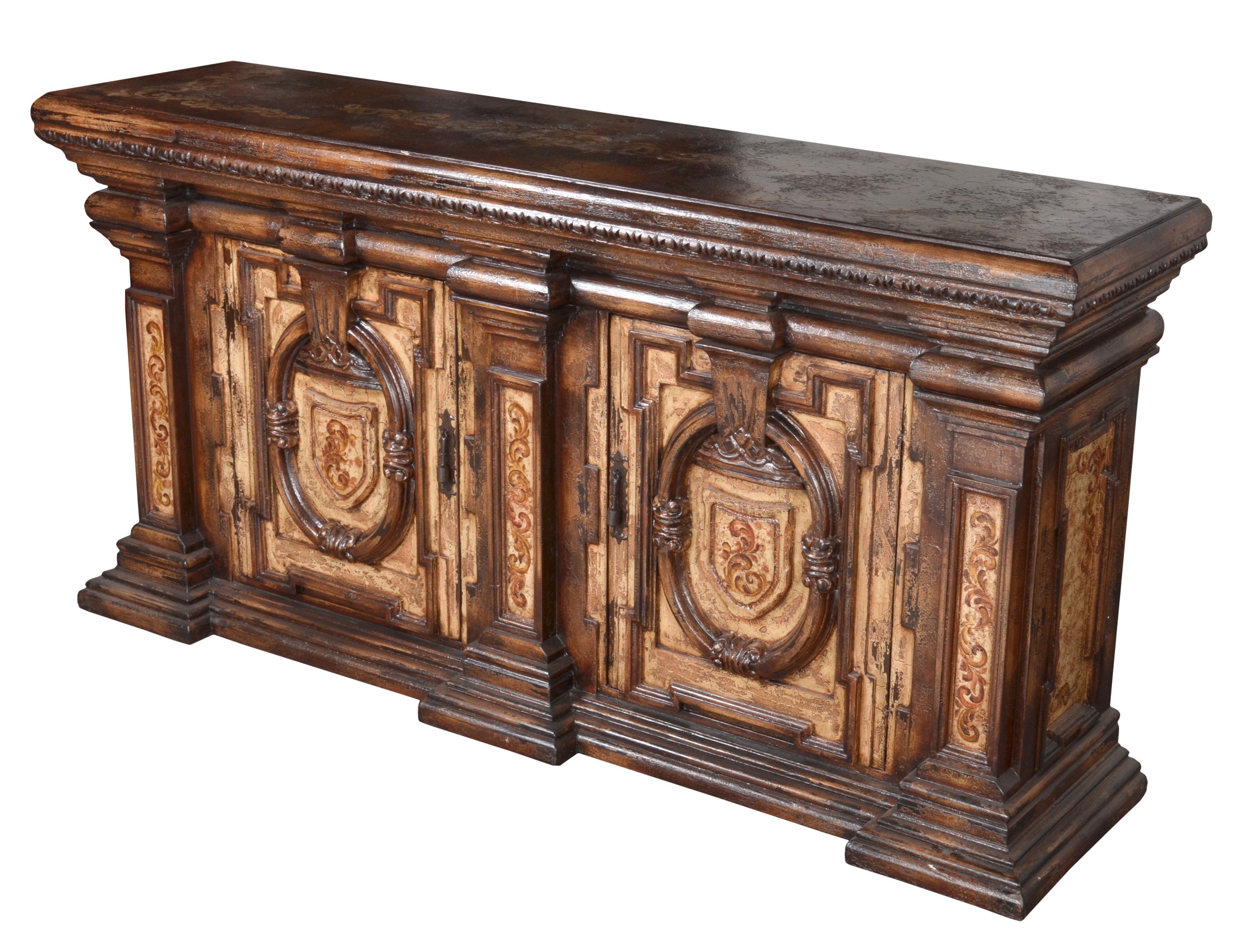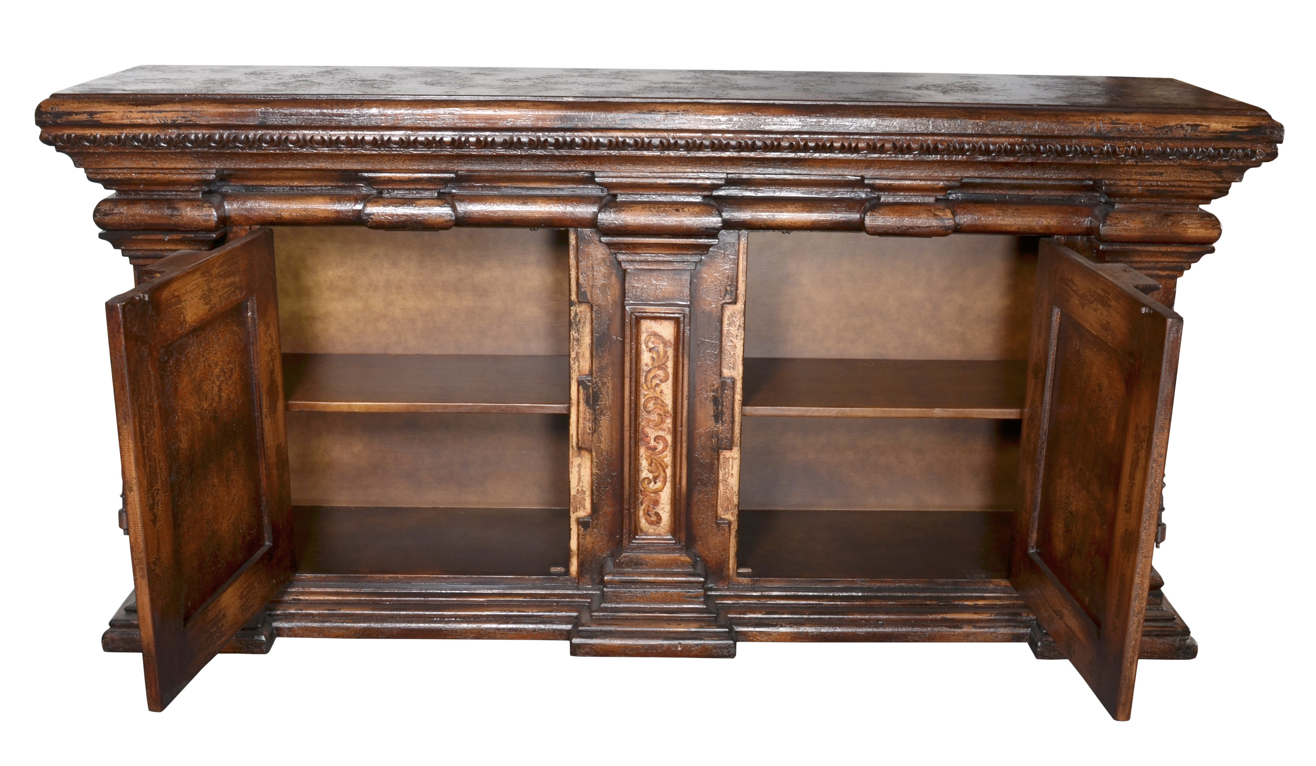 The Belruse Grand Buffet is the largest most impressive cabinet from our popular Belruse Series it stands a magnificent 97.5" wide and is 48" tall. This series boasts a Spanish influence with large scaled details and its multi layered finish of light and dark sienna and brown tones with subtle natural contrasts resulting from hand rubbing and exposing the rich wood undertones then delicately detailed with hand painted soft scrolls. There are many dramatic and beautiful buffets, consoles, sideboards and cabinets offered in this Belruse series available in different sizes and shapes to enable you to find the perfect option, but if you are looking to make a statement of truly grand and have the space, there is none better then the Belruse Grand Buffet featured. The Belruse series is part of our Santa Lucia Collection which consists of handmade, hand painted, and distressed solid wood furniture making each piece a timeless investment. Hand crafted treasures made one piece at a time, under one roof, by our exclusive family owned manufacturer from Lima, Peru. Their master artisans are skilled in furniture making techniques influenced by the Spanish during the colonization of Peru. Many items in the diverse collection feature specialty hand painted finishes that have also been passed on and perfected from generation to generation. The family strives to be environmentally friendly by using woods re-purposed from haciendas and old colonial homes as well as wood indigenous to South American forests, primarily mahogany, cedar, mean and requiem. If you are a lover of beautiful painted furniture, find hill country rustic romantic, or find richness in Mediterranean lore Then you too may fall in furniture love with this fine collection.
