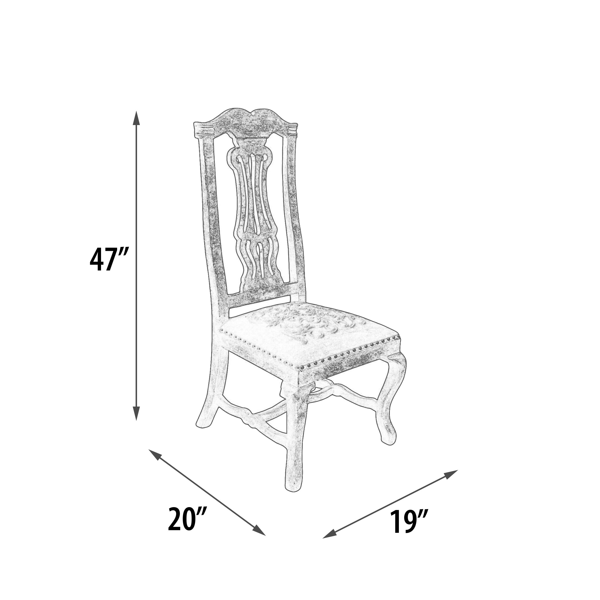 The Juliana Carved Leather Side Chair is beautiful hand made chair with hand carved leather seat and part of the newest Juliana Peruvian Dining Room Collection. The chair is offered here separately but can also be combined with the matching table set. This series boasts a Spanish influence with large scaled details and its multi layered finish of light and dark sienna and brown tones with subtle natural contrasts resulting from hand rubbing and exposing the rich wood undertones then delicately detailed with hand painted soft scrolls. There are many options to add on and perfect your dining room design. Whether you are looking just for a special Chair like this or would prefer to order the complete set with Table and Bench options. This collection is expansive and when space is available consider adding any of the matching side boards, wine cabinets and or buffets. The Juliana series is part of our Santa Lucia Collection which consists of handmade, hand painted, and distressed solid wood furniture making each piece a timeless investment. Hand crafted treasures made one piece at a time, under one roof, by our exclusive family owned manufacturer from Lima, Peru. Their master artisans are skilled in furniture making techniques influenced by the Spanish during the colonization of Peru. Many items in the diverse collection feature specialty hand painted finishes that have also been passed on and perfected from generation to generation. The family strives to be environmentally friendly by using woods re-purposed from haciendas and old colonial homes as well as wood indigenous to South American forests, primarily mahogany, cedar, moena and requiem. If you are a lover of beautiful painted furniture, find hill country rustic romantic, or find richness in Mediterranean lore Then you too may fall in furniture love with this fine collection.