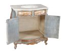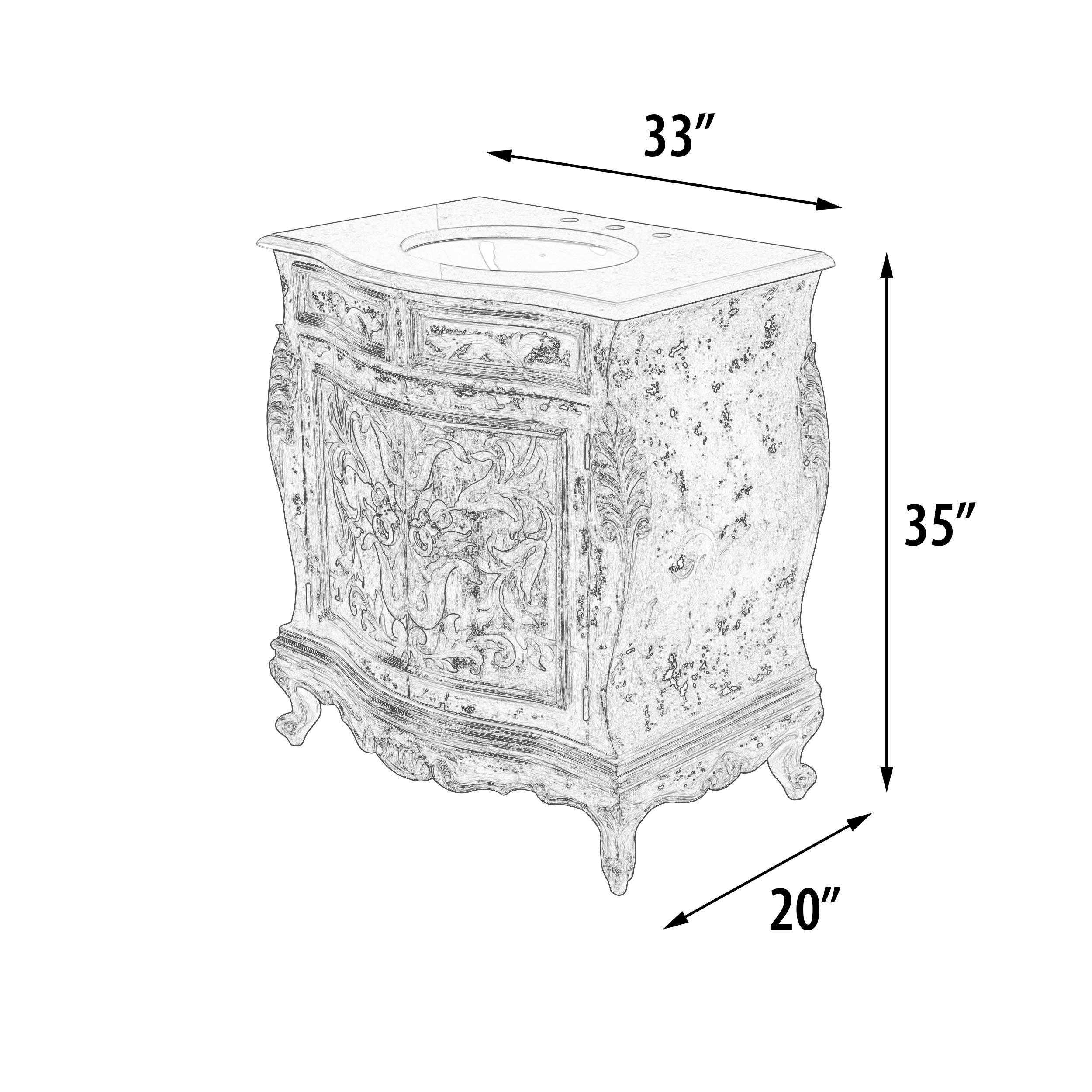 The Serena Vanity from our Serena Series is a 33" wide single bowl vanity. The vanity is beautiful and decorative as well as designed to make installation as easy as possible. It comes with a mounted beige solid marble top with pre-drilled holes for faucets, a mounted porcelain bowl and the back was designed with an opening to allow for easy plumbing hook-ups. This collection boasts a Spanish and French influence with its large scaled details in a finish of varying tones of soft bleus featuring a contrast of distressed creamy whites and delicately detailed with hand painted soft scrolls. Consider ordering 2 for a large master bath application. The Serena series is part of our Santa Lucia Collection consisting of handmade, hand painted, and distressed solid wood furniture making each piece a timeless investment. Hand crafted treasures made one piece at a time, under one roof, by our exclusive family owned manufacturer from Lima, Peru. Their master artisans are skilled in furniture making techniques influenced by the Spanish during the colonization of Peru. Many items in the diverse collection feature specialty hand painted finishes that have also been passed on and perfected from generation to generation. The family strives to be environmentally friendly by using woods re-purposed from haciendas and old colonial homes as well as wood indigenous to South American forests, primarily mahogany, cedar, moena and requiem. If you are a lover of beautiful painted furniture, find hill country rustic romantic, or find richness in Mediterranean lore Then you too may fall in furniture love with this fine collection.