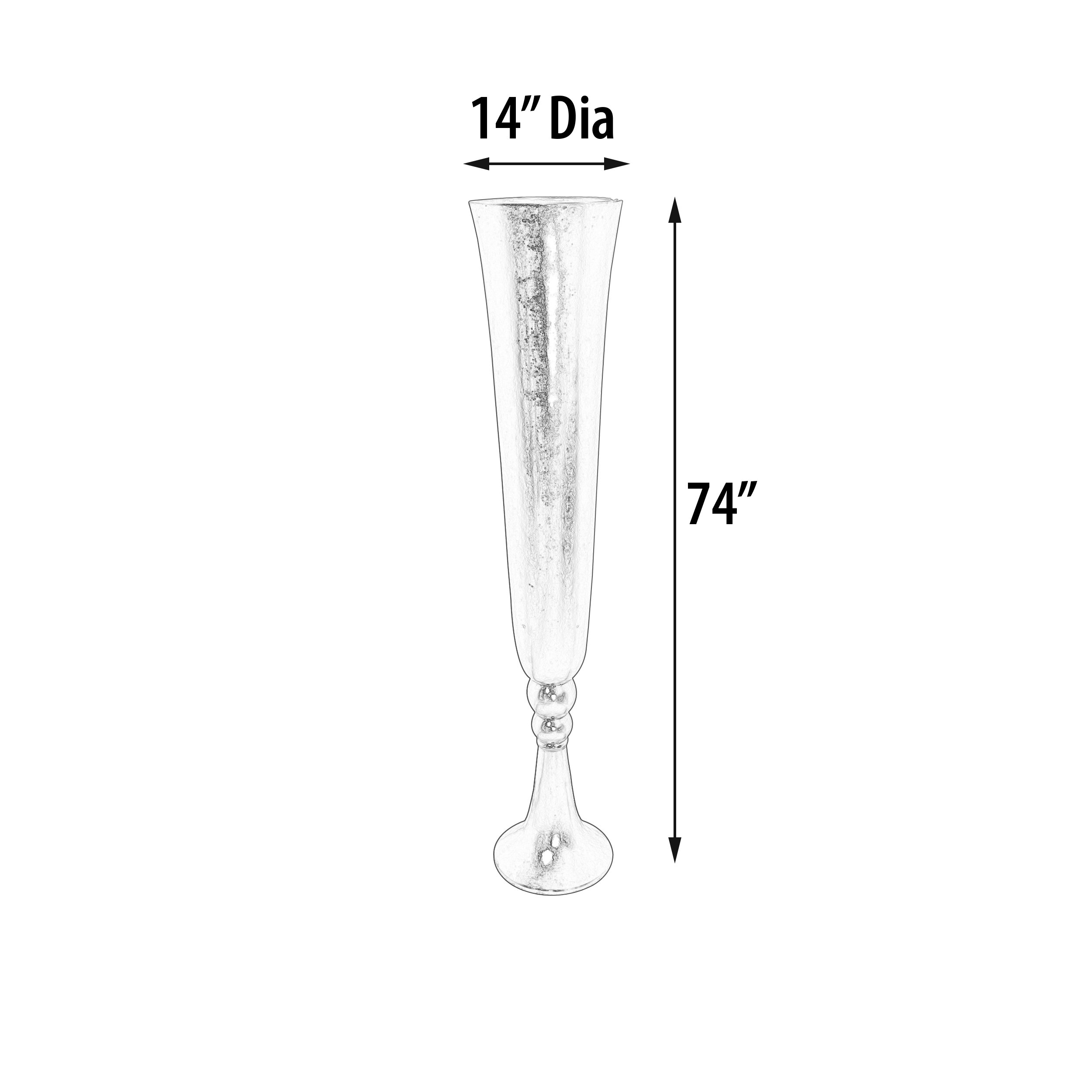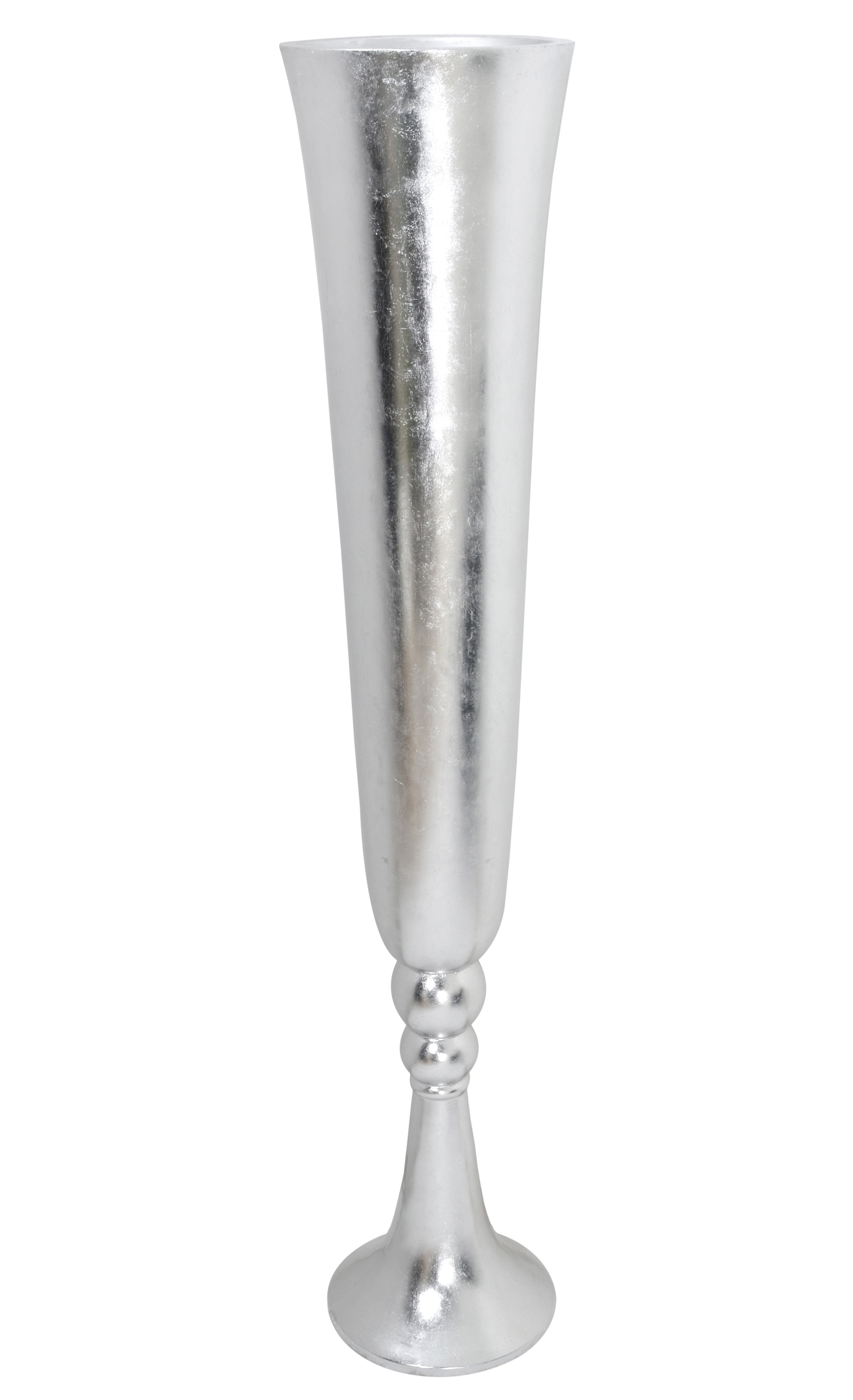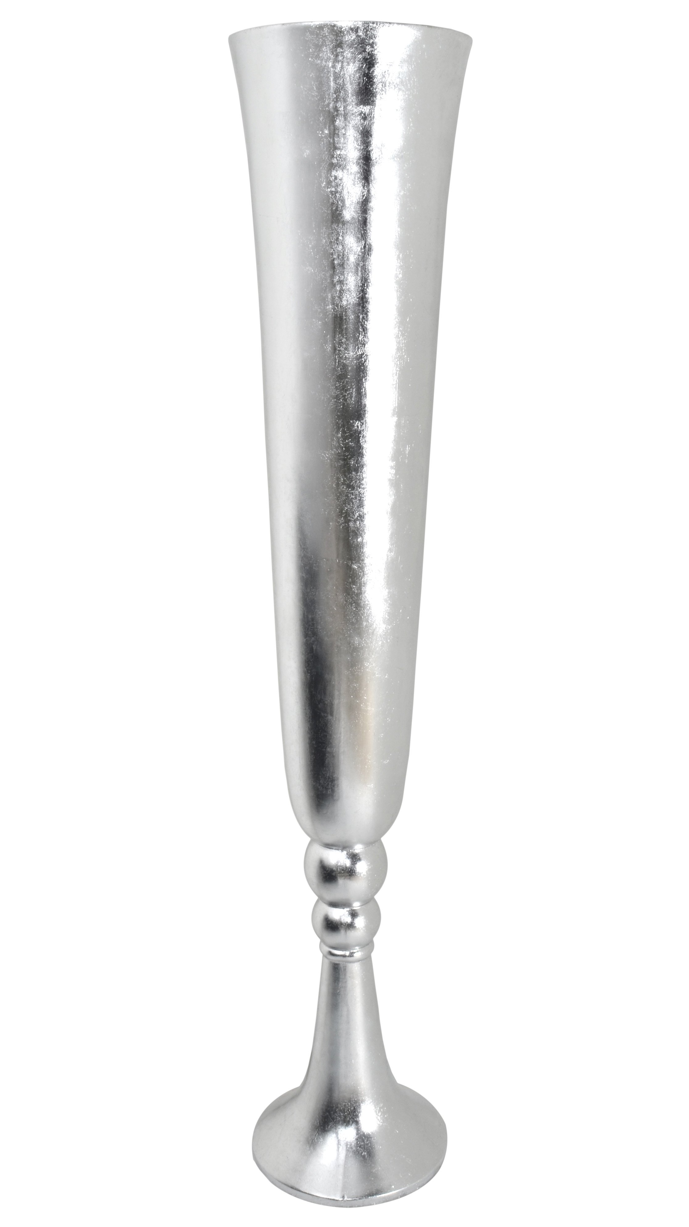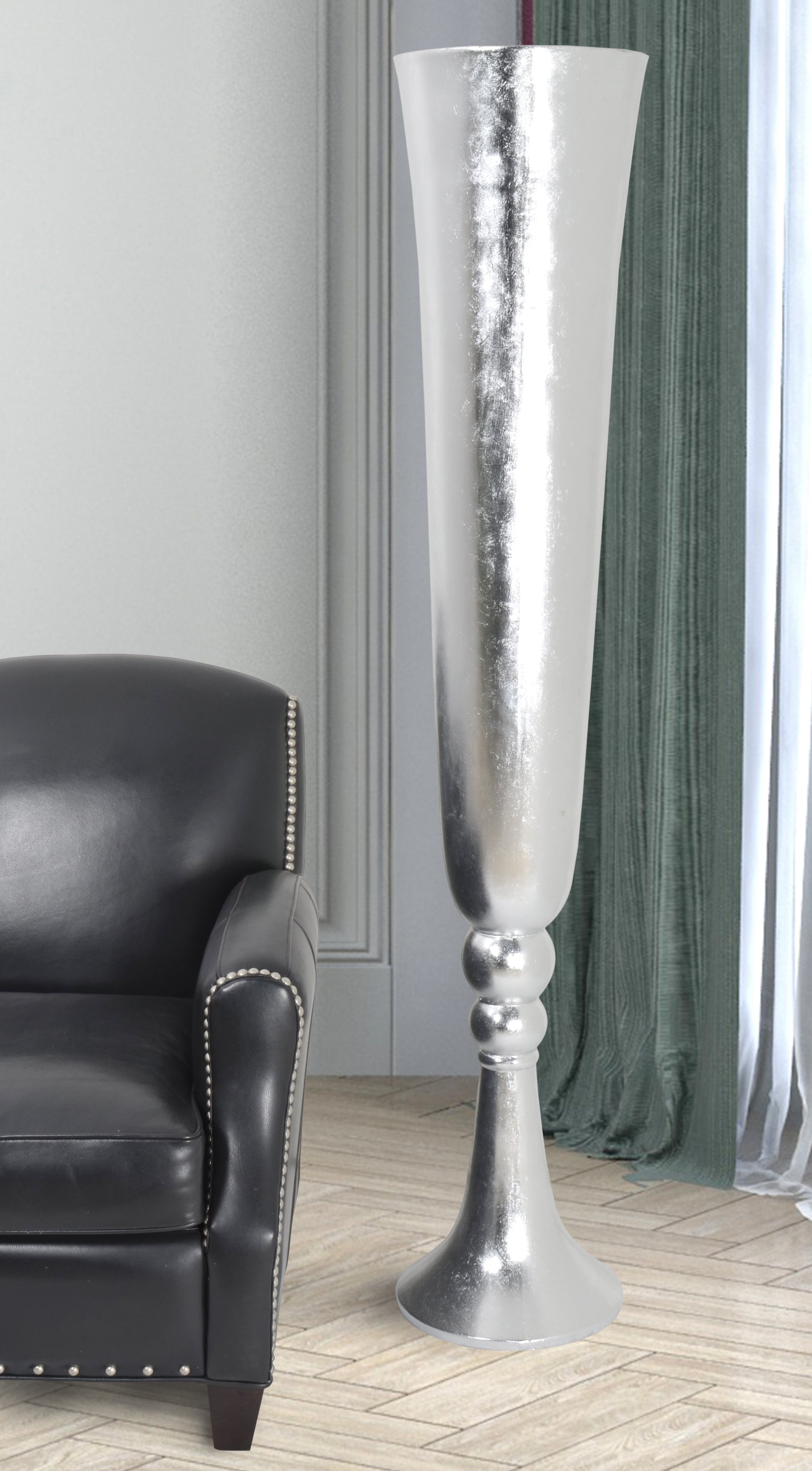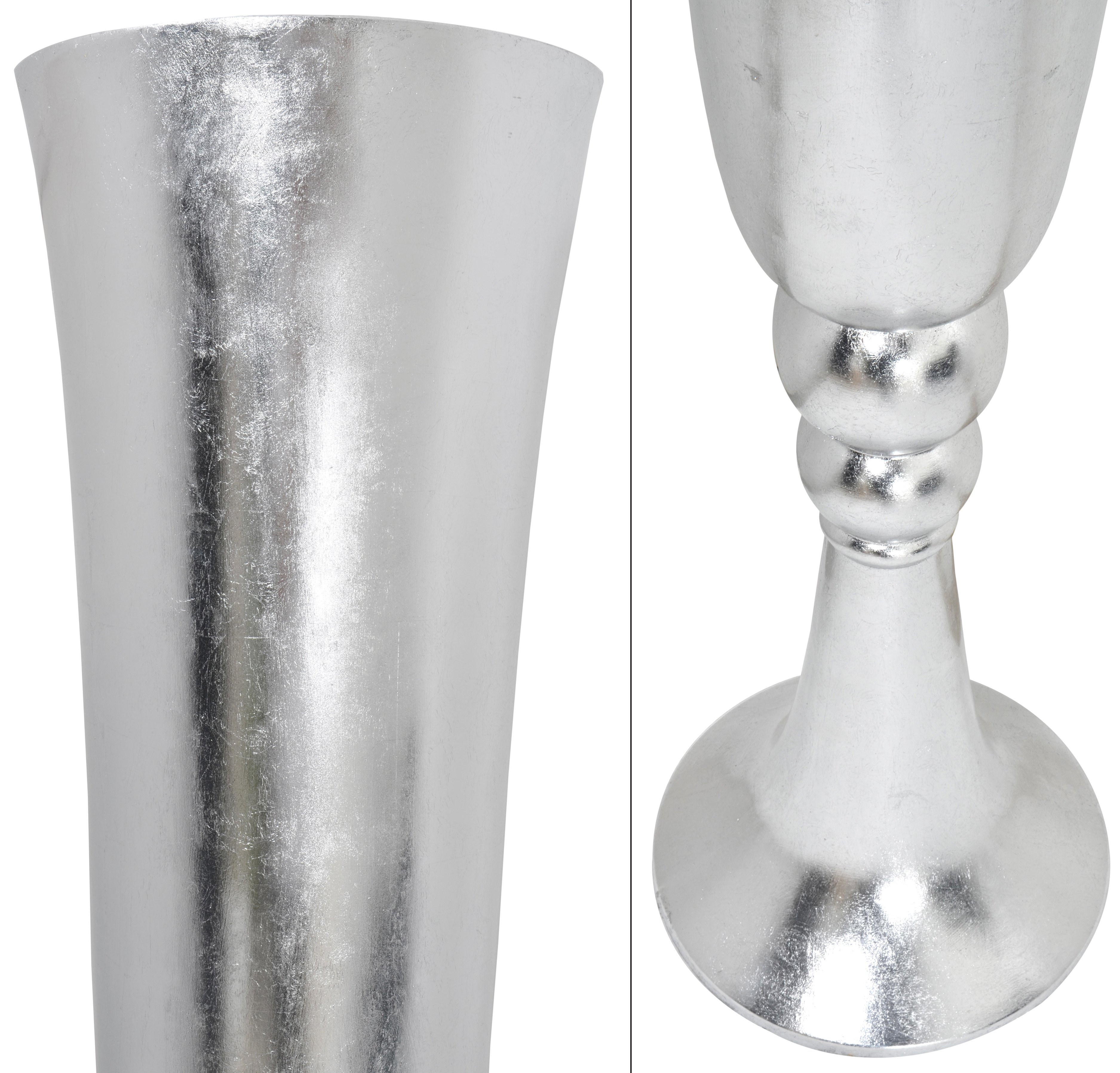A striking 74" tall fluted vase in a contemporary all silver leaf finish, from our Argento finish collection. A large collection featuring many beautiful shaped and functional items, all with clean lines but very much a collection with an emphasis on scale and drama. Sold separately but often ordered in pairs for balance and symmetry. The vase is hand cast in a fiberglass resin which is durable and can withstand outdoor applications. The hand applied silver leaf finish is further protected with an enriching lacquer top coat. The finish however is not recommended for outdoor use unless maintained with protective lacquer top coatings. The frequency of which will depend on your specific conditions.