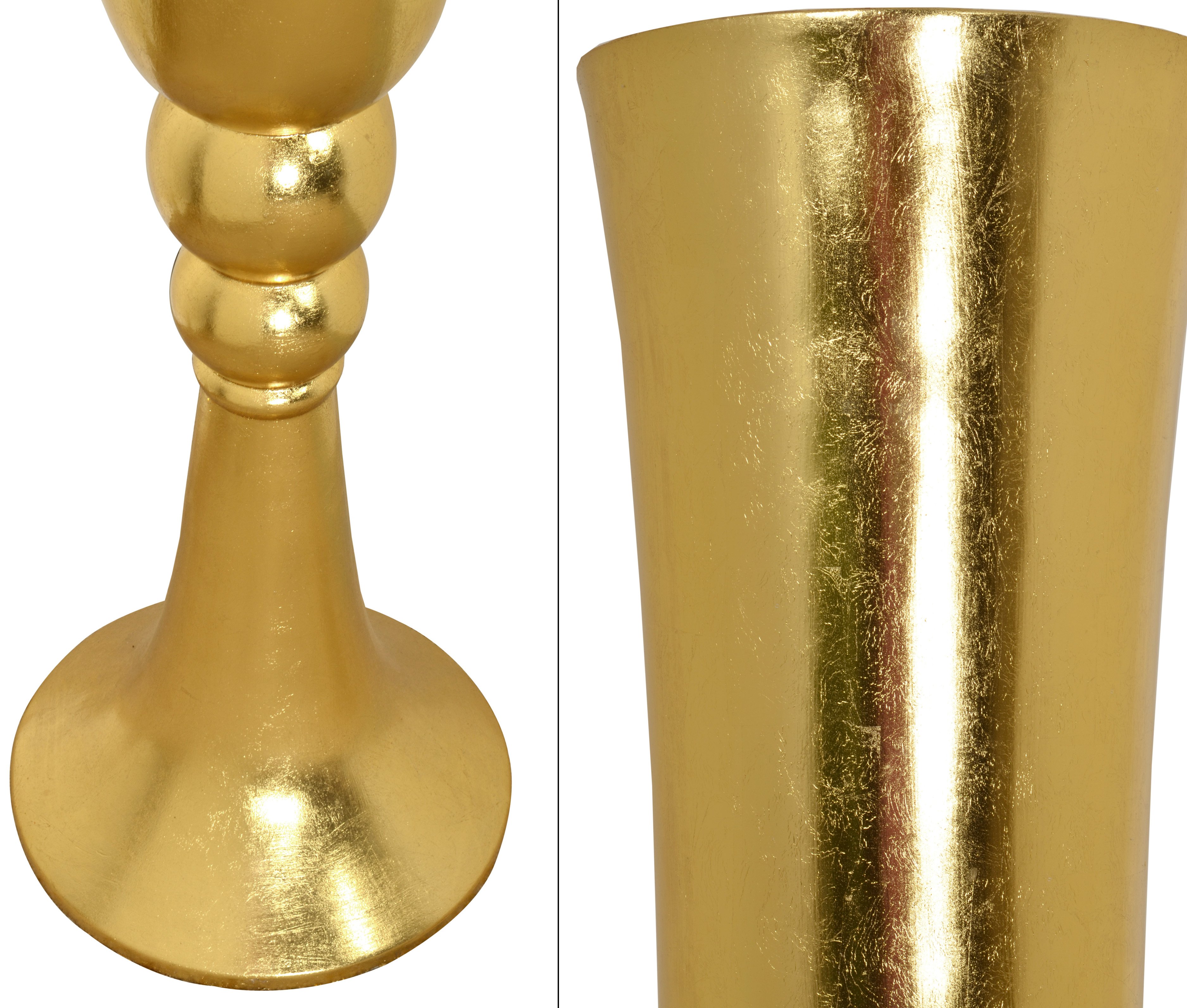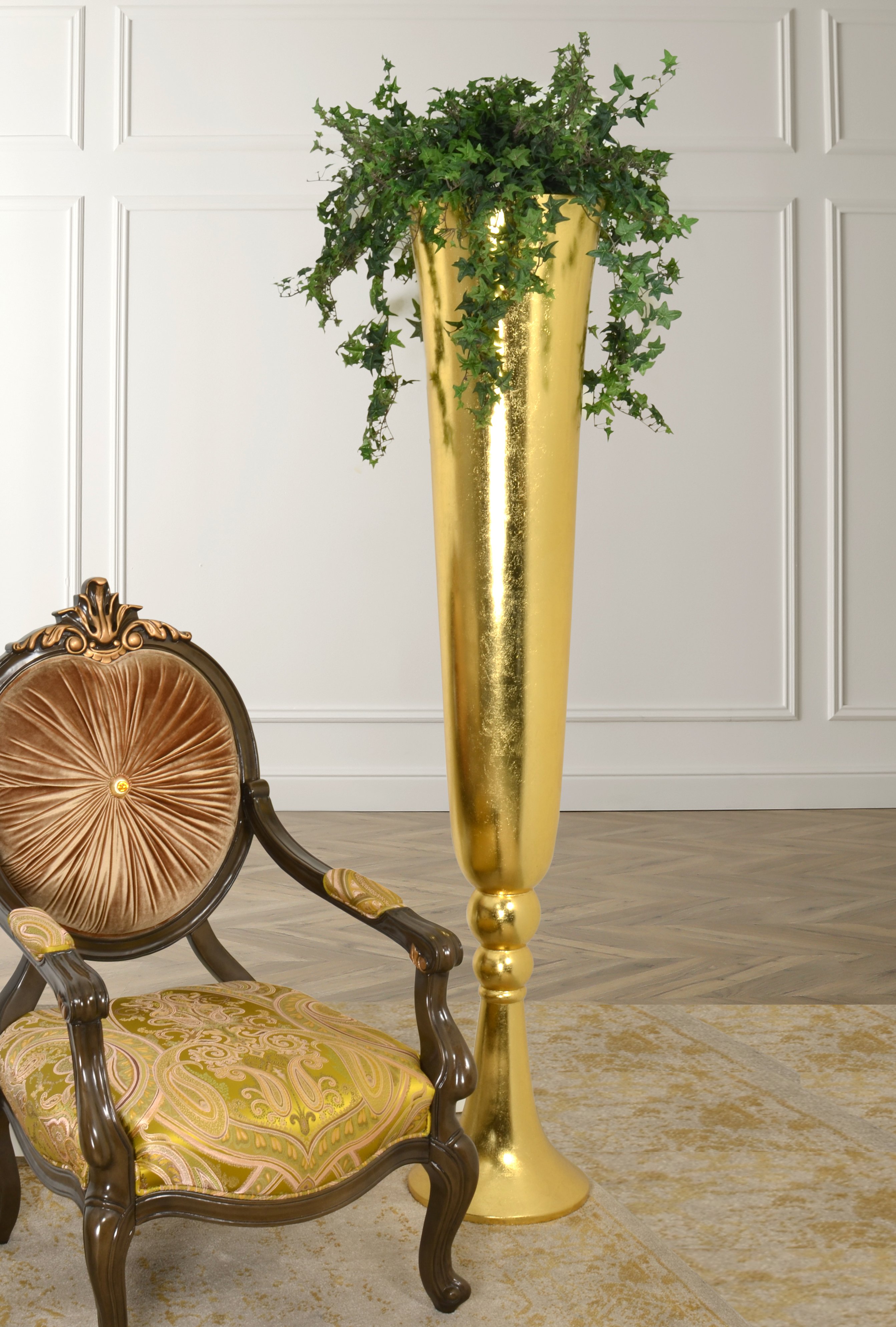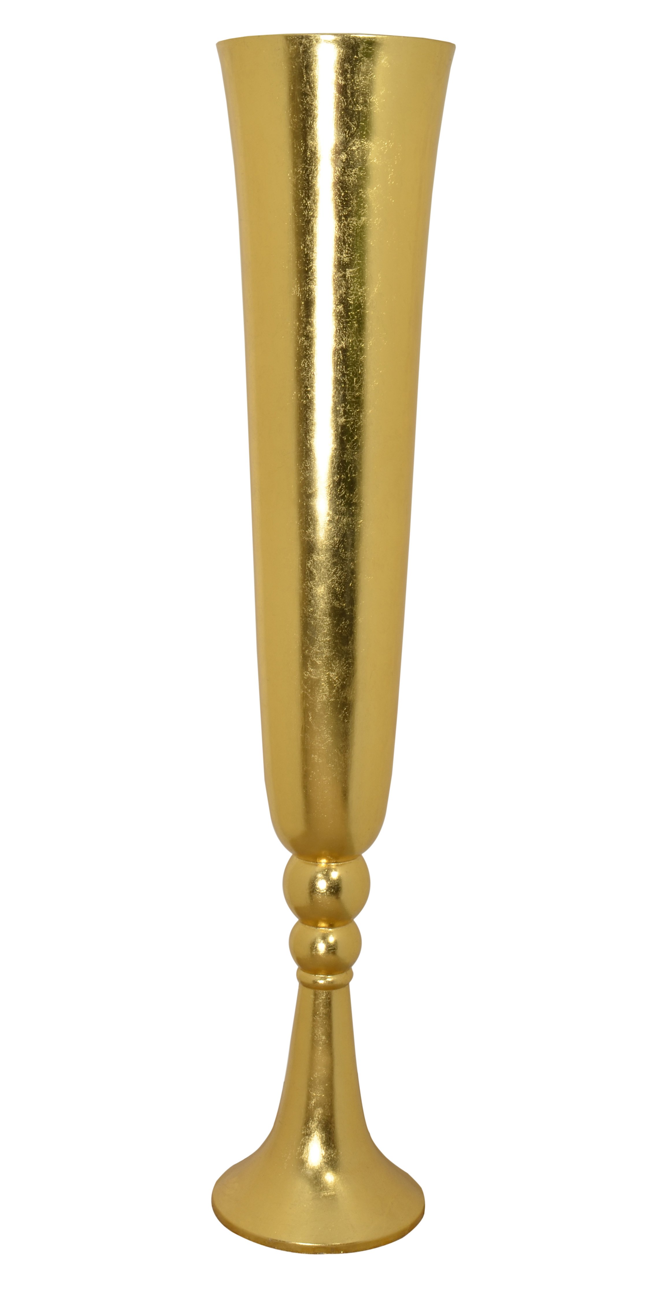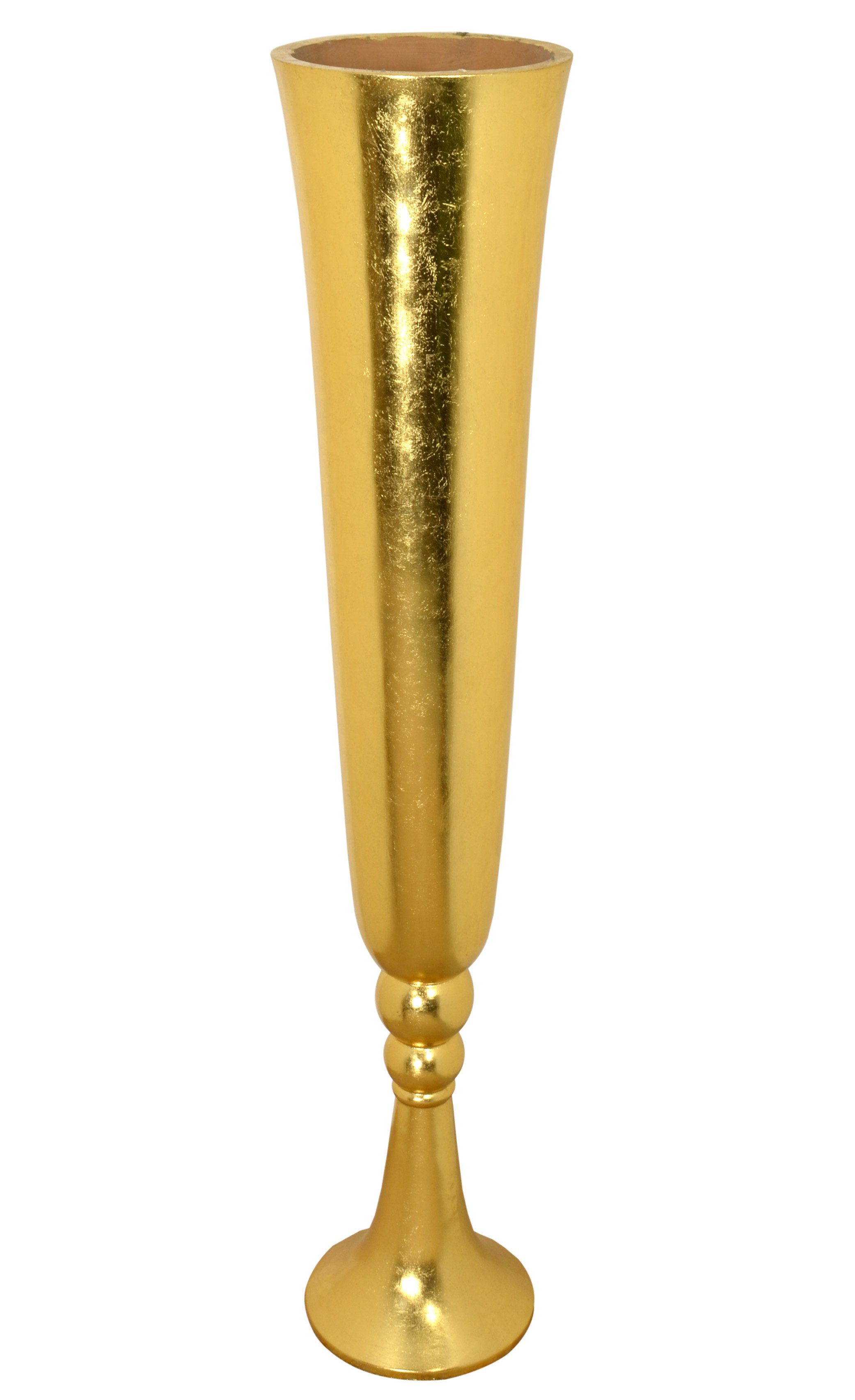 A striking 74" tall fluted vase in a contemporary all gold leaf finish, from our Oro finish collection. A large collection featuring many beautiful shaped and functional items, all with clean lines but very much a collection with an emphasis on scale and drama. Sold separately but often ordered in pairs for balance and symmetry. The vase is hand cast in a fiberglass resin which is durable and can withstand outdoor applications. The hand applied gold leaf finish is further protected with an enriching lacquer top coat. The finish however is not recommended for outdoor use unless maintained with protective lacquer top coatings. The frequency of which will depend on your specific conditions.