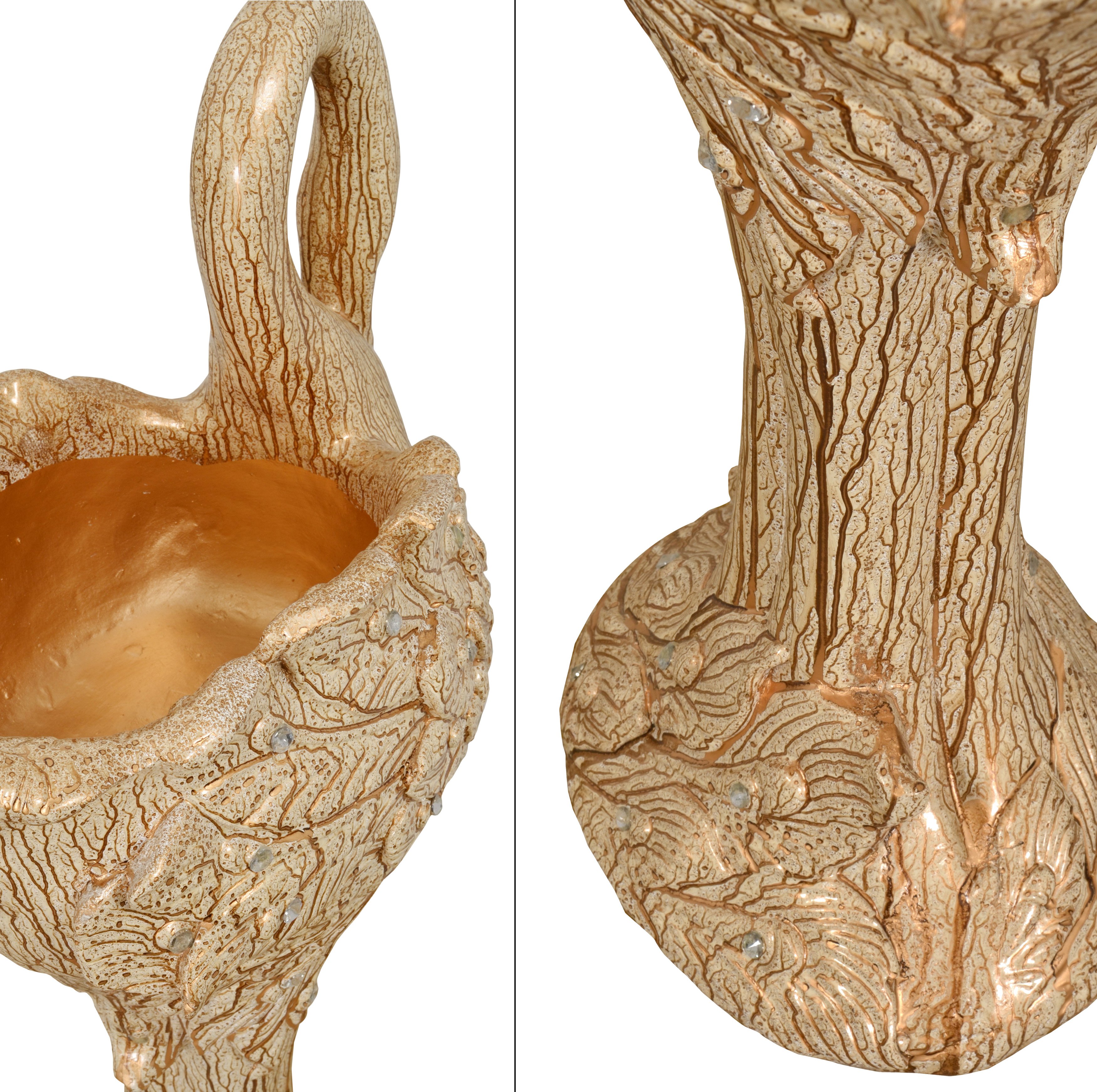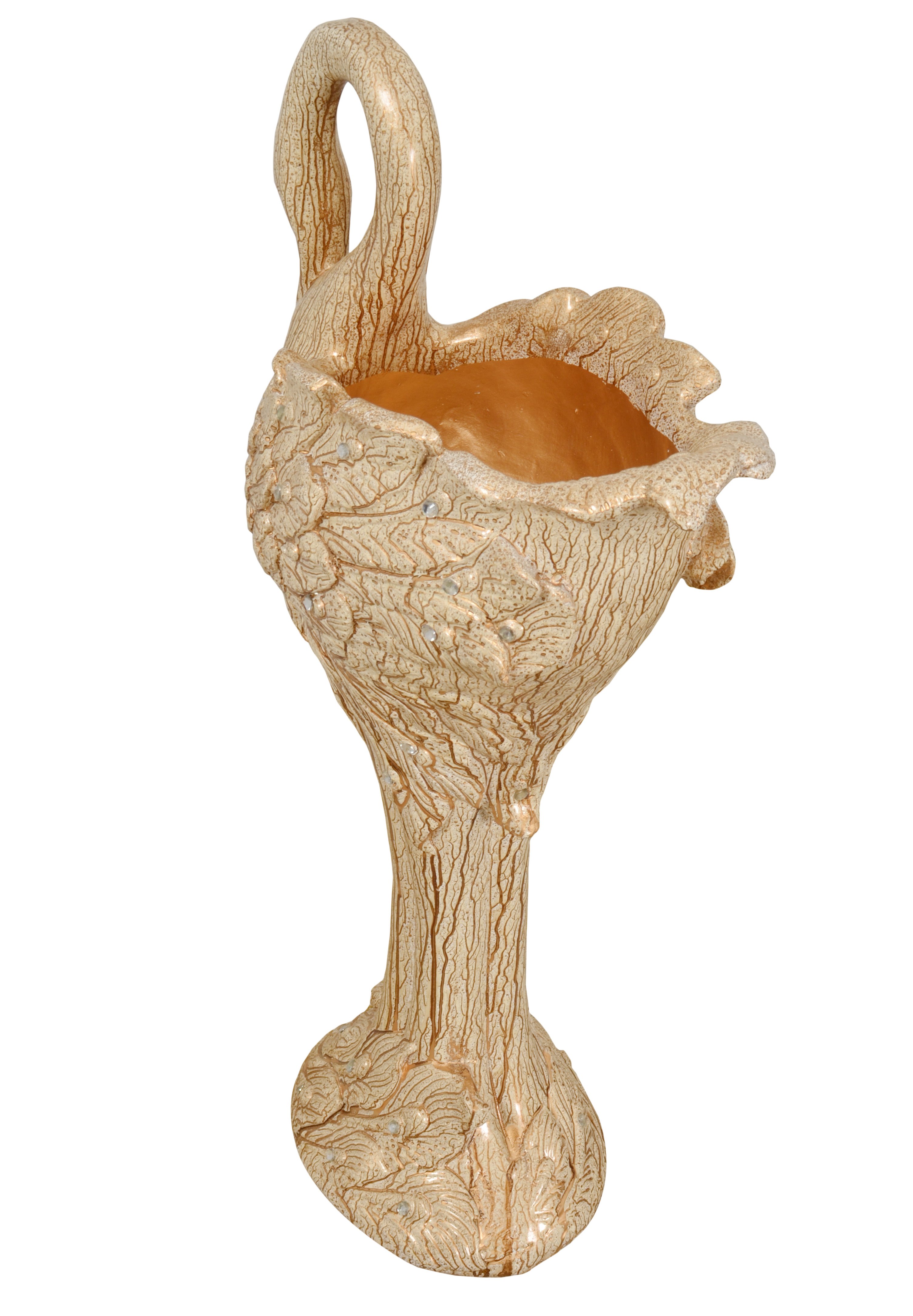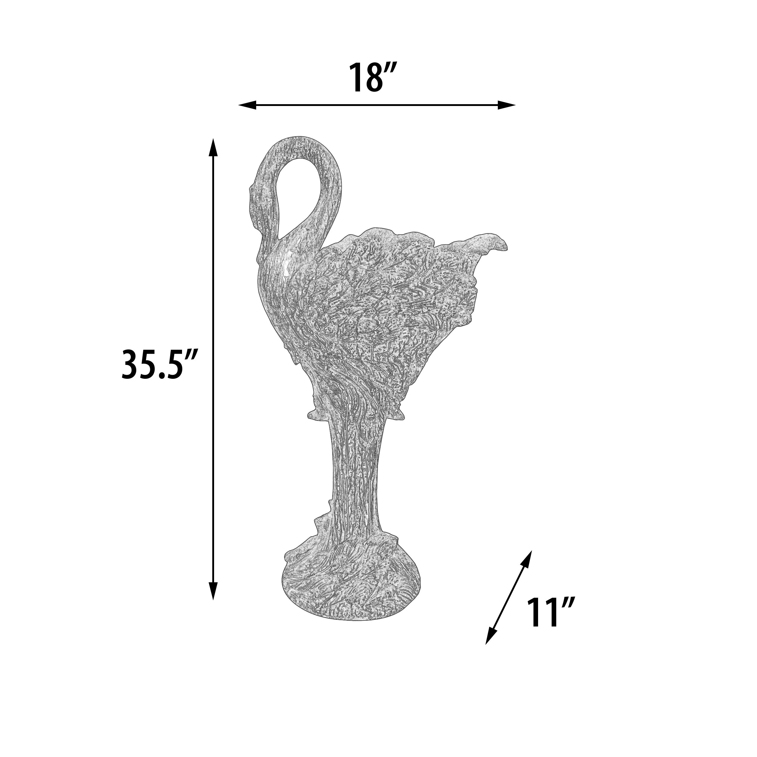 An unusual figural swan vase 18" wide and 35.5" tall. Featuring a rich and interesting hand applied golden drizzle finish. The drizzled affect created uses a combination of light contrasting ecru and a darker gold over a gold base with a black hand rub that accents the artist carved details and then further enhanced with a lustrous lacquer top coat. Sold separately but often ordered in pairs for balance and symmetry. The vase is hand cast in a fiberglass resin which is durable and can withstand outdoor applications. The finish however is not recommended for outdoor use unless maintained with protective lacquer top coatings. The frequency of which will depend on your specific conditions.
