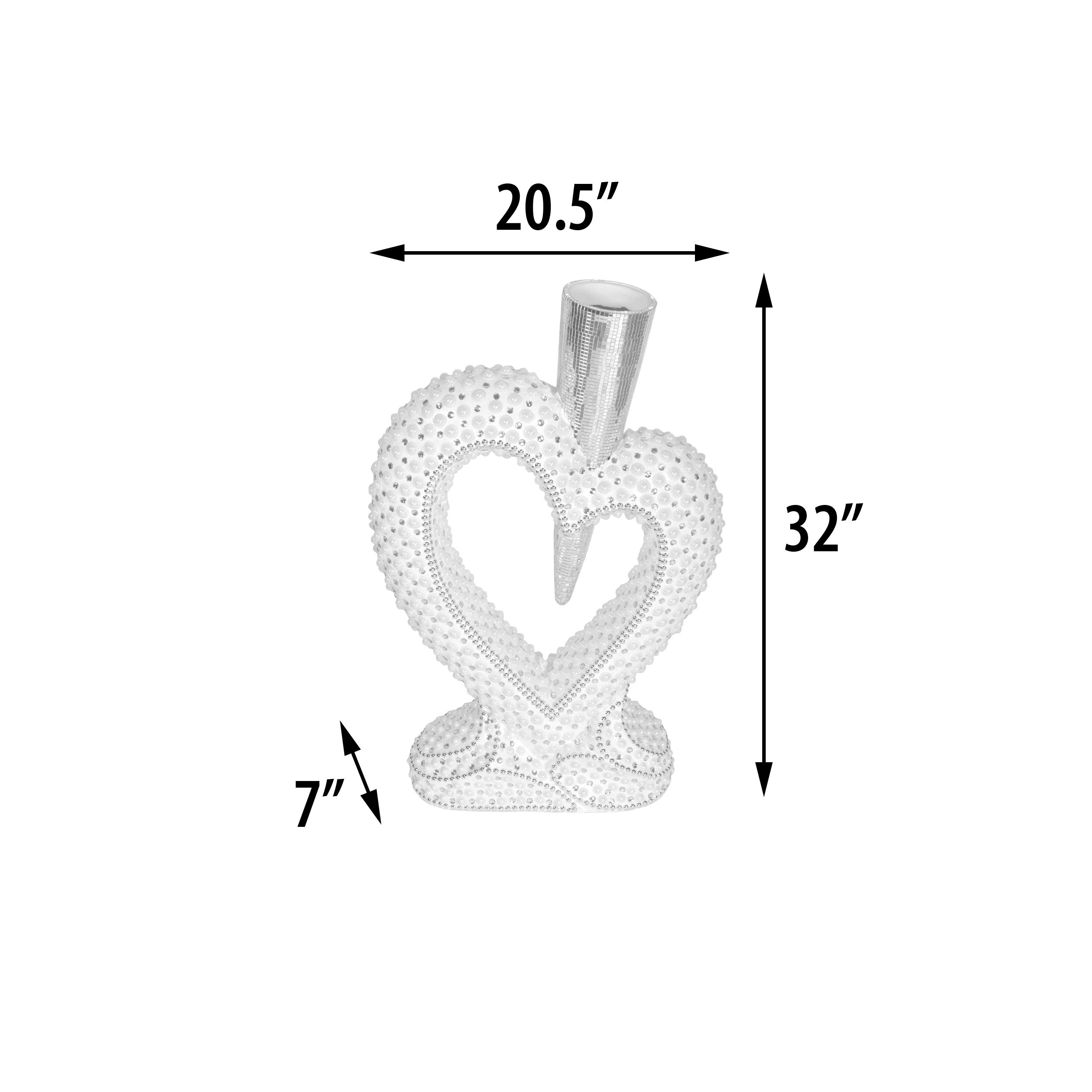 A very chic White Heart. This commanding artist-designed sculpture is created with 100's of meticulous hand applied jewels and faux pearlescent shells intermittently placed all over its base with a very dramatic micro mosaic mirrored top. The item is hand cast in durable fiberglass resin.