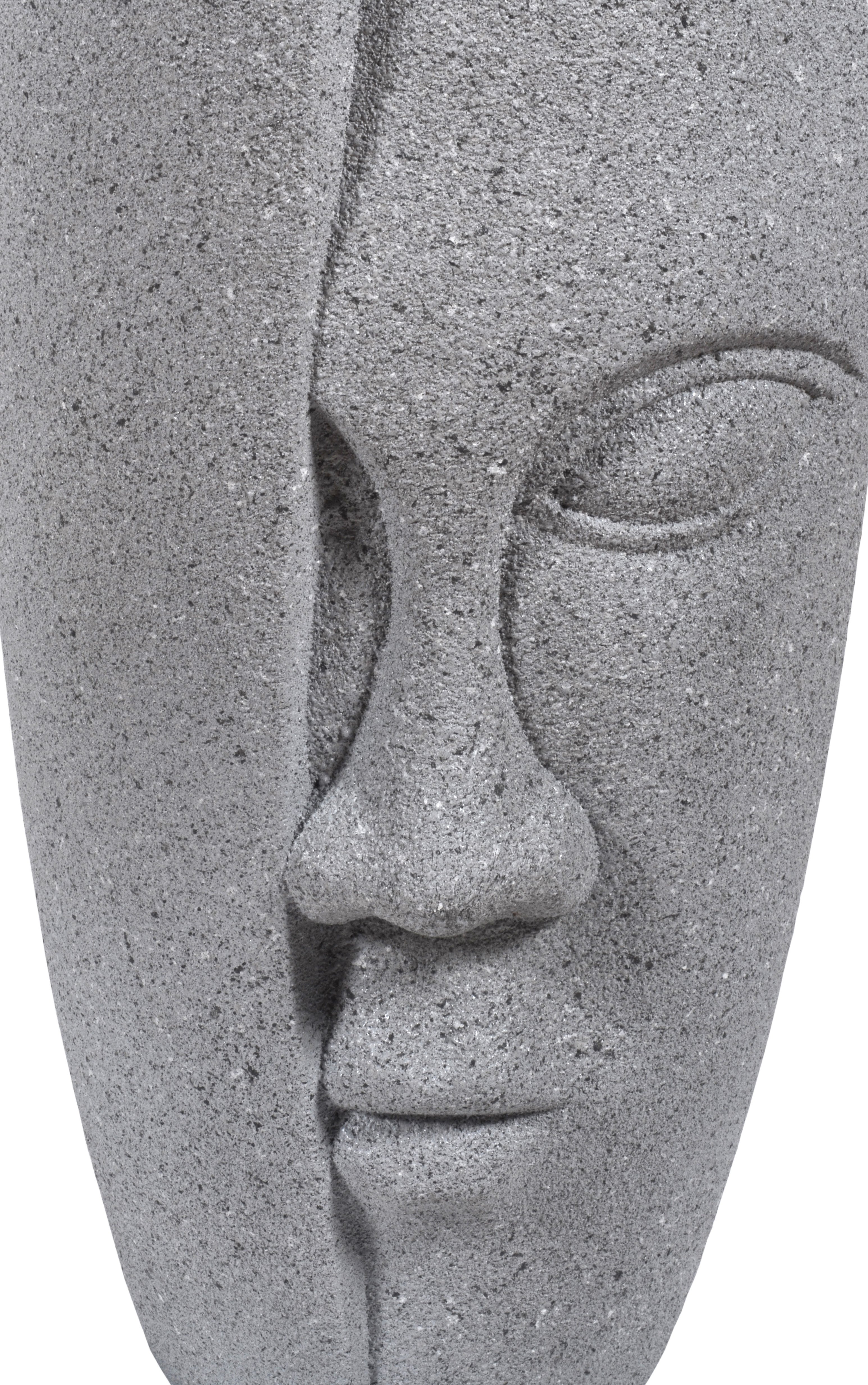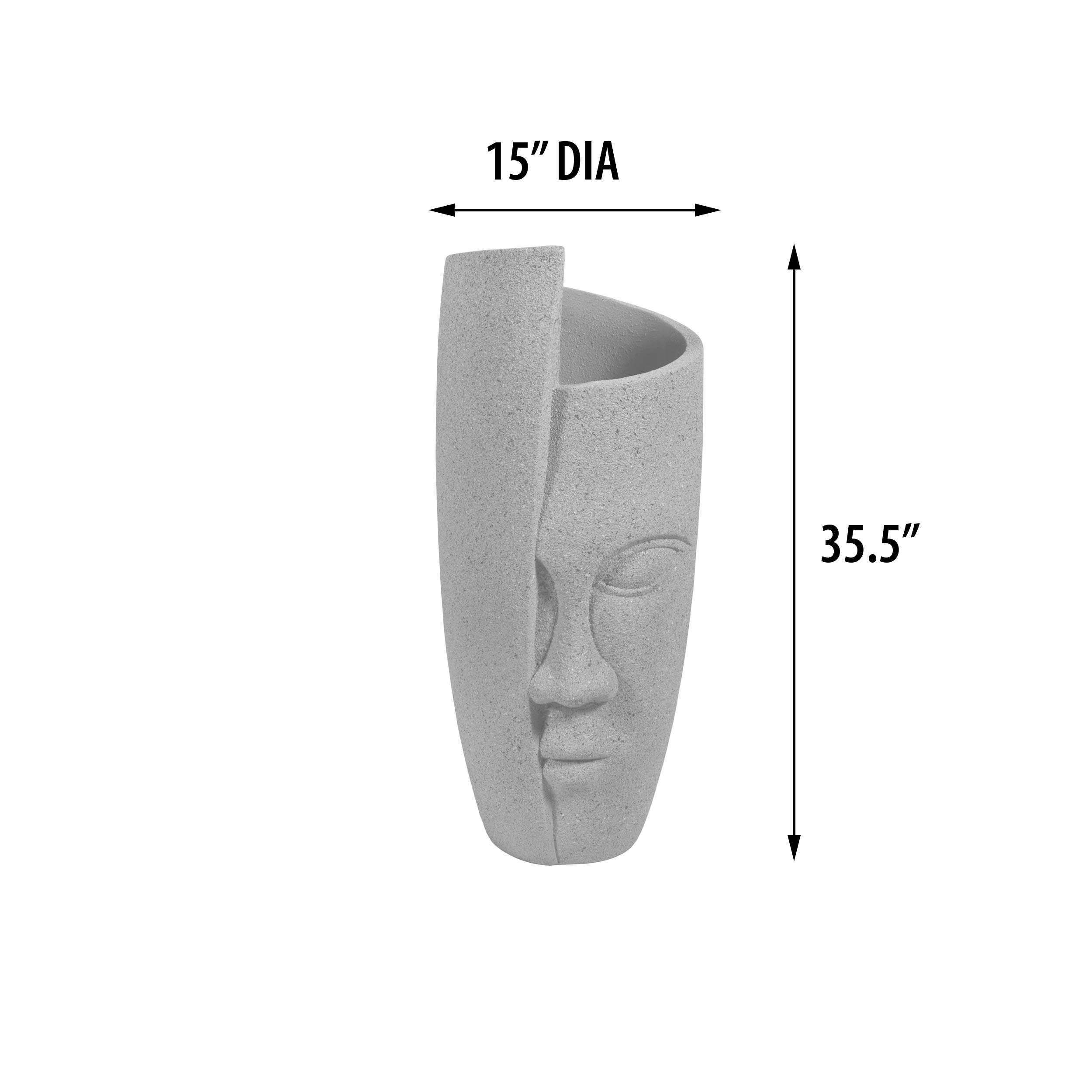 Our Bourgeois Medium Face Planter 35.50 Inches Tall. Our unique Bourgeois series of planters come in 3 graduated heights for creating interesting displays. Fill with flowers for enhanced function or use as stand alone decorative objects. The item is hand Cast in durable all weather indoor or outdoor Fiberglass with an exterior Rough stone granite grey finish. No assembly Required. Buy one size or combine with other sizes.