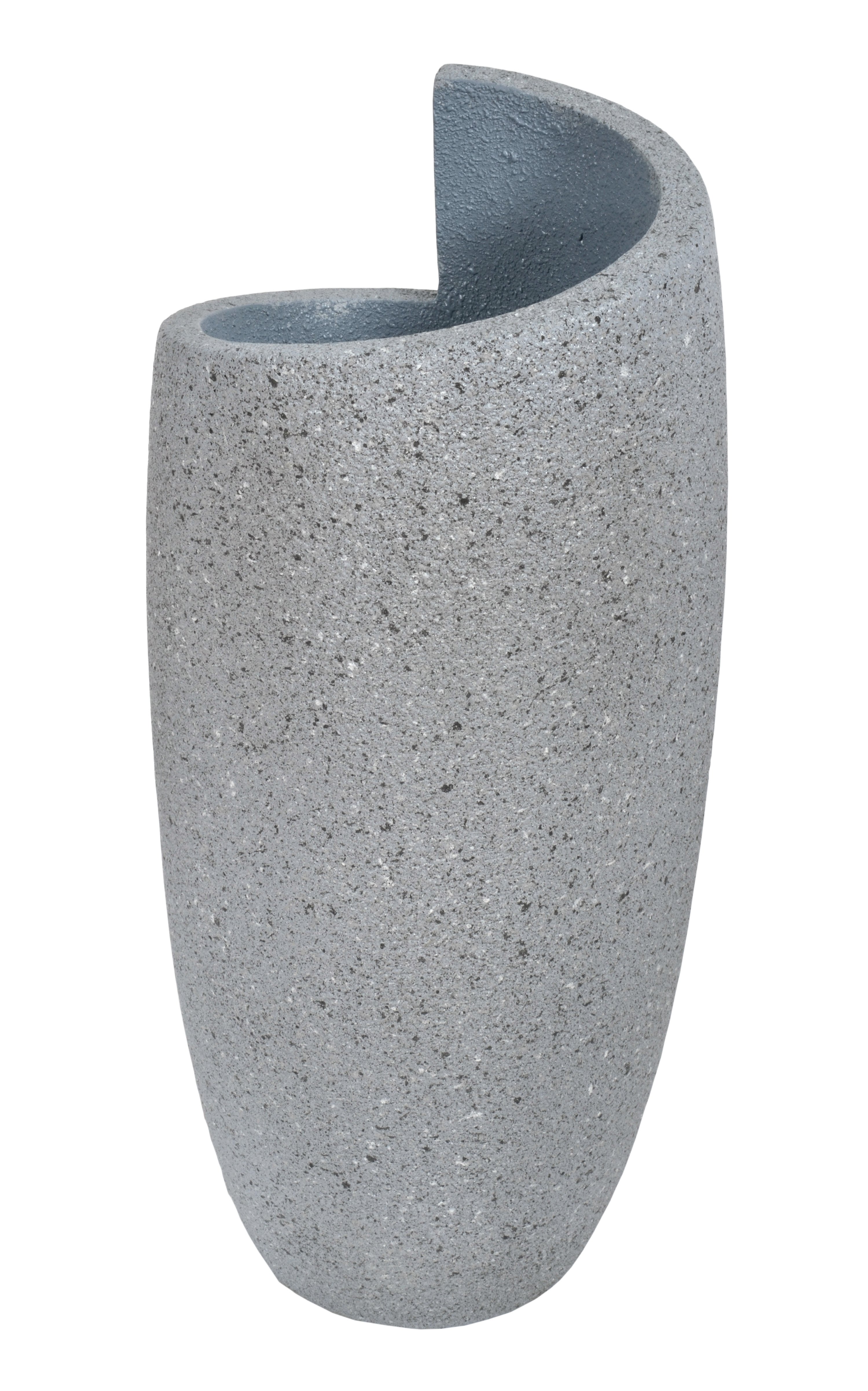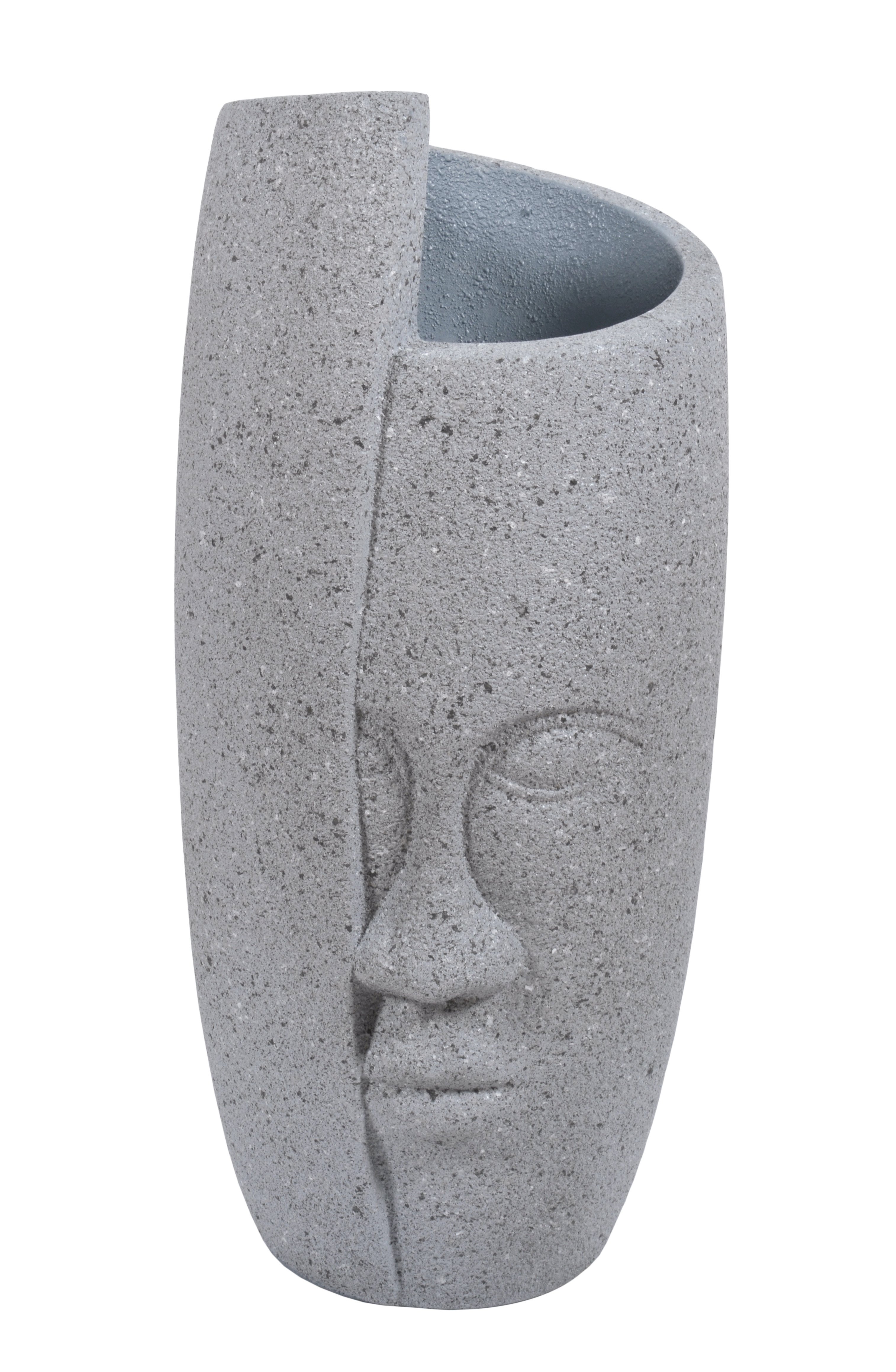Our Bourgeois Face Planter 28.50 Inches Tall. Our unique Bourgeois series of planters come in 3 graduated heights for creating interesting displays. Fill with flowers for enhanced function or use as stand alone decorative objects. The item is hand Cast in durable all weather indoor or outdoor Fiberglass with an exterior Rough stone granite grey finish. No assembly Required. Buy one size or combine with other sizes.