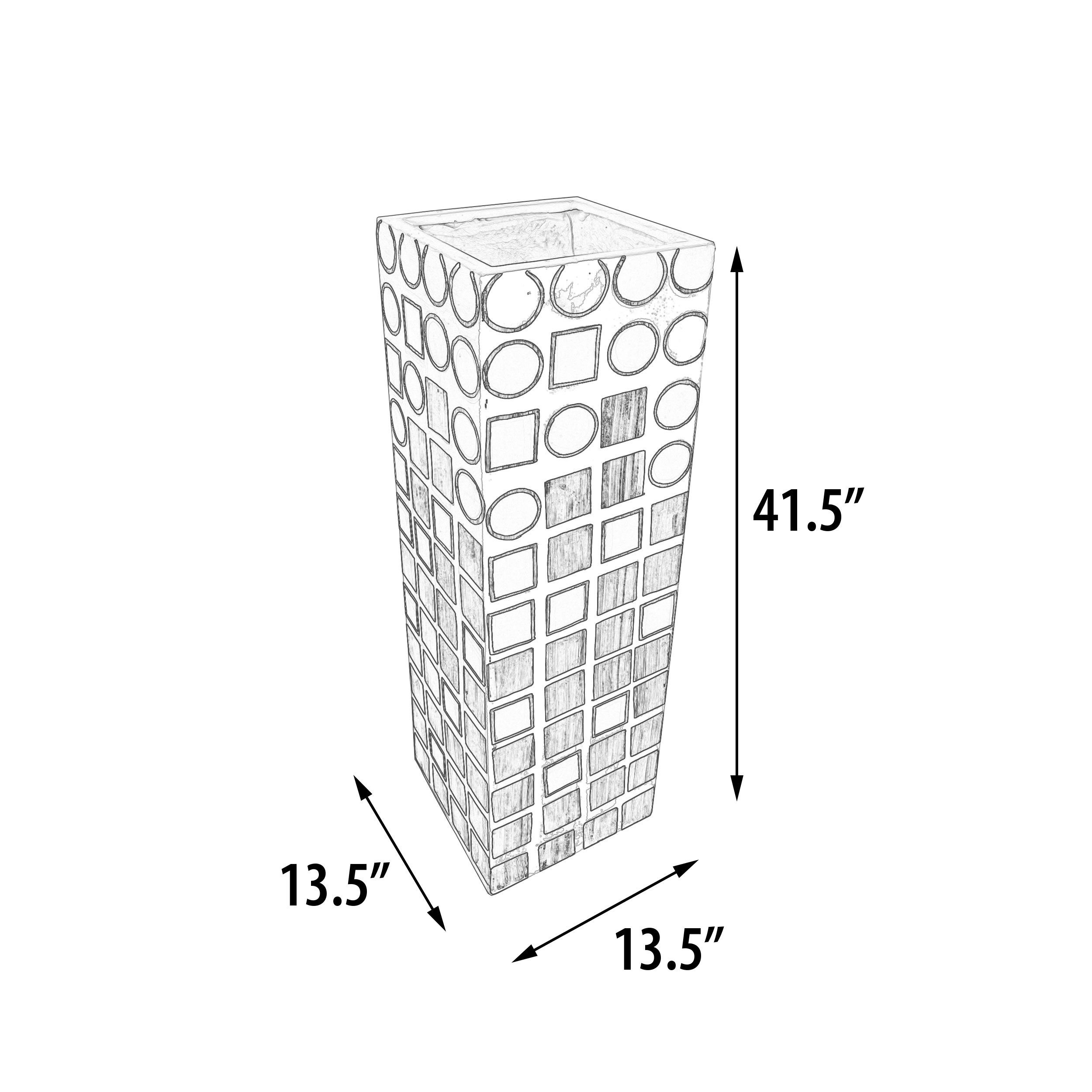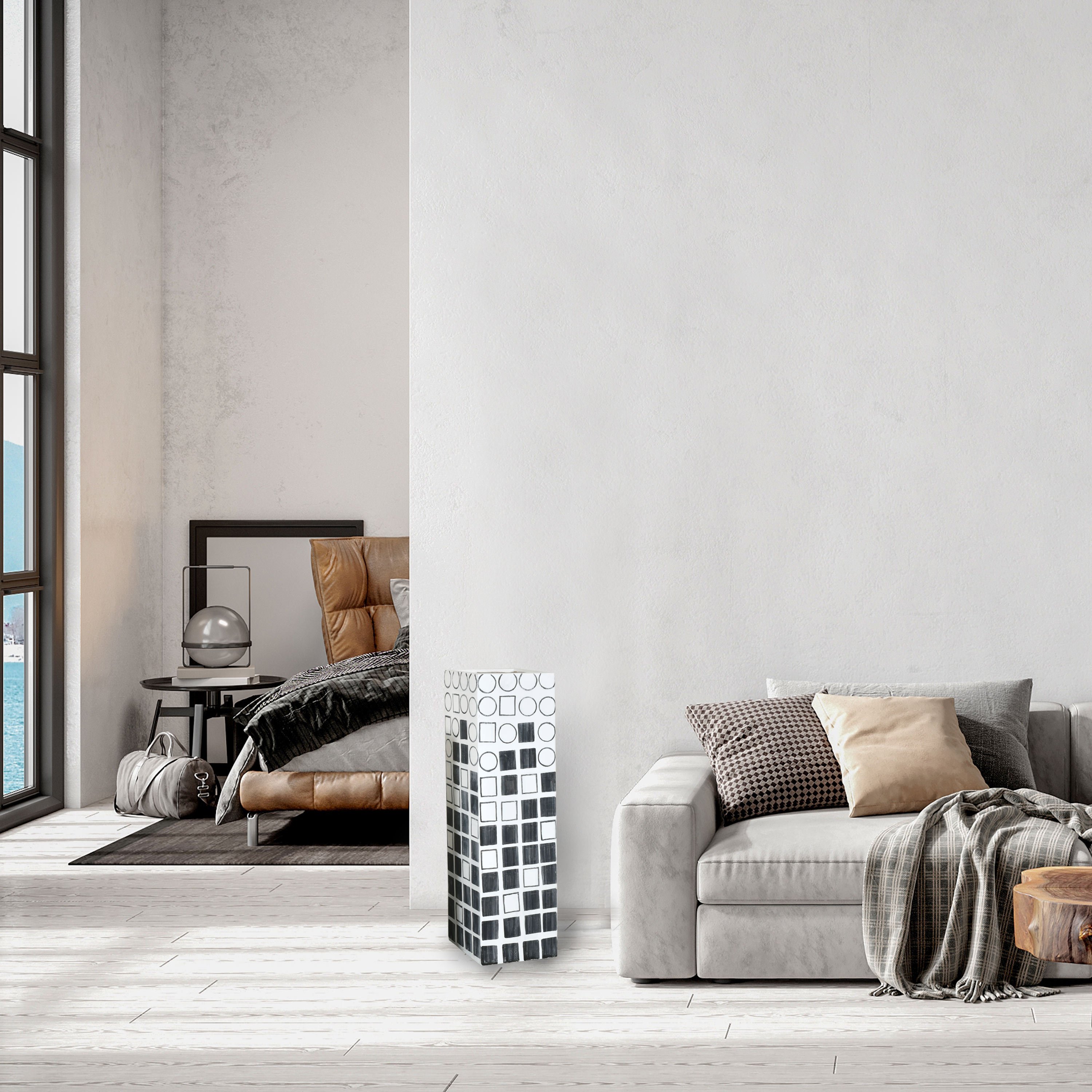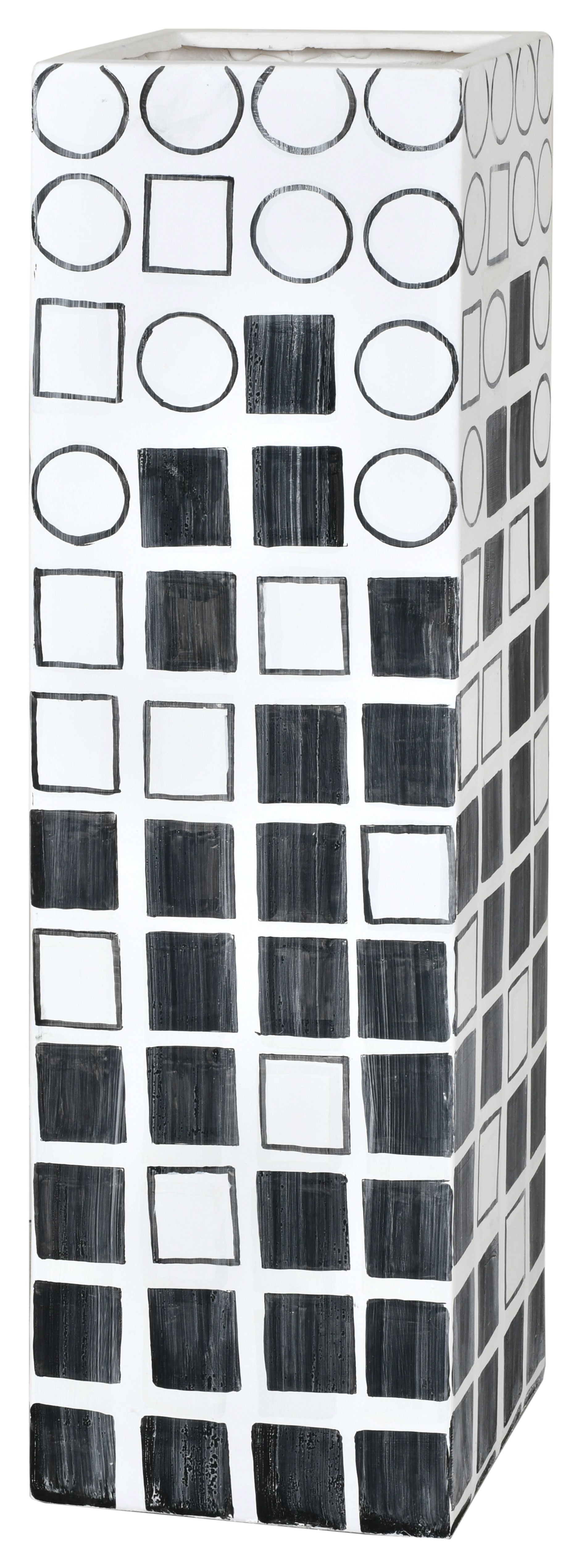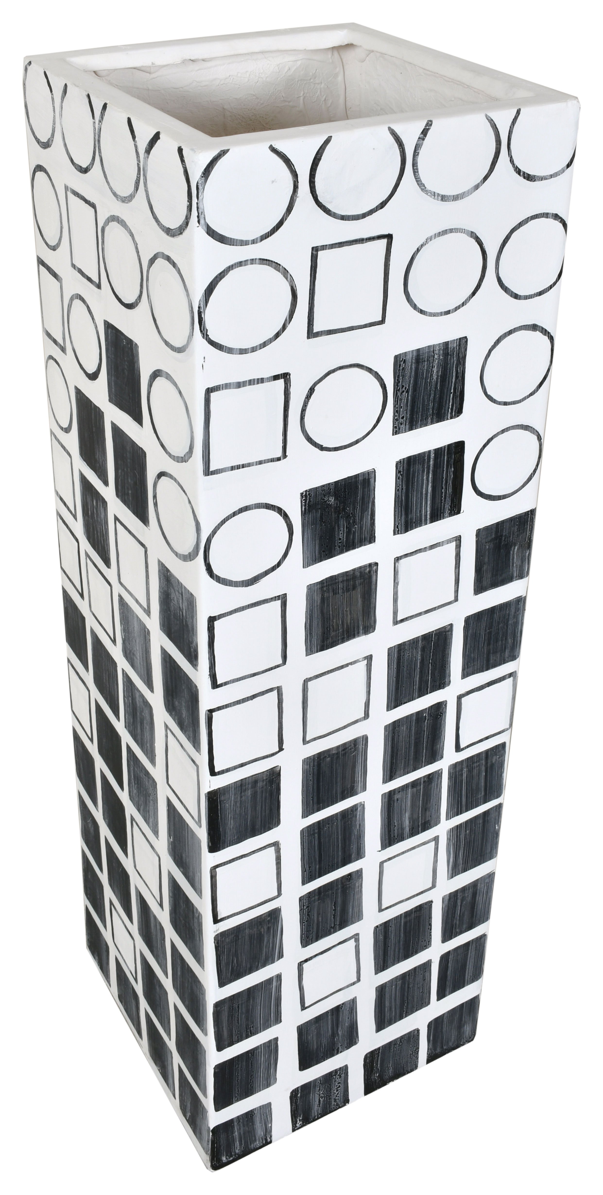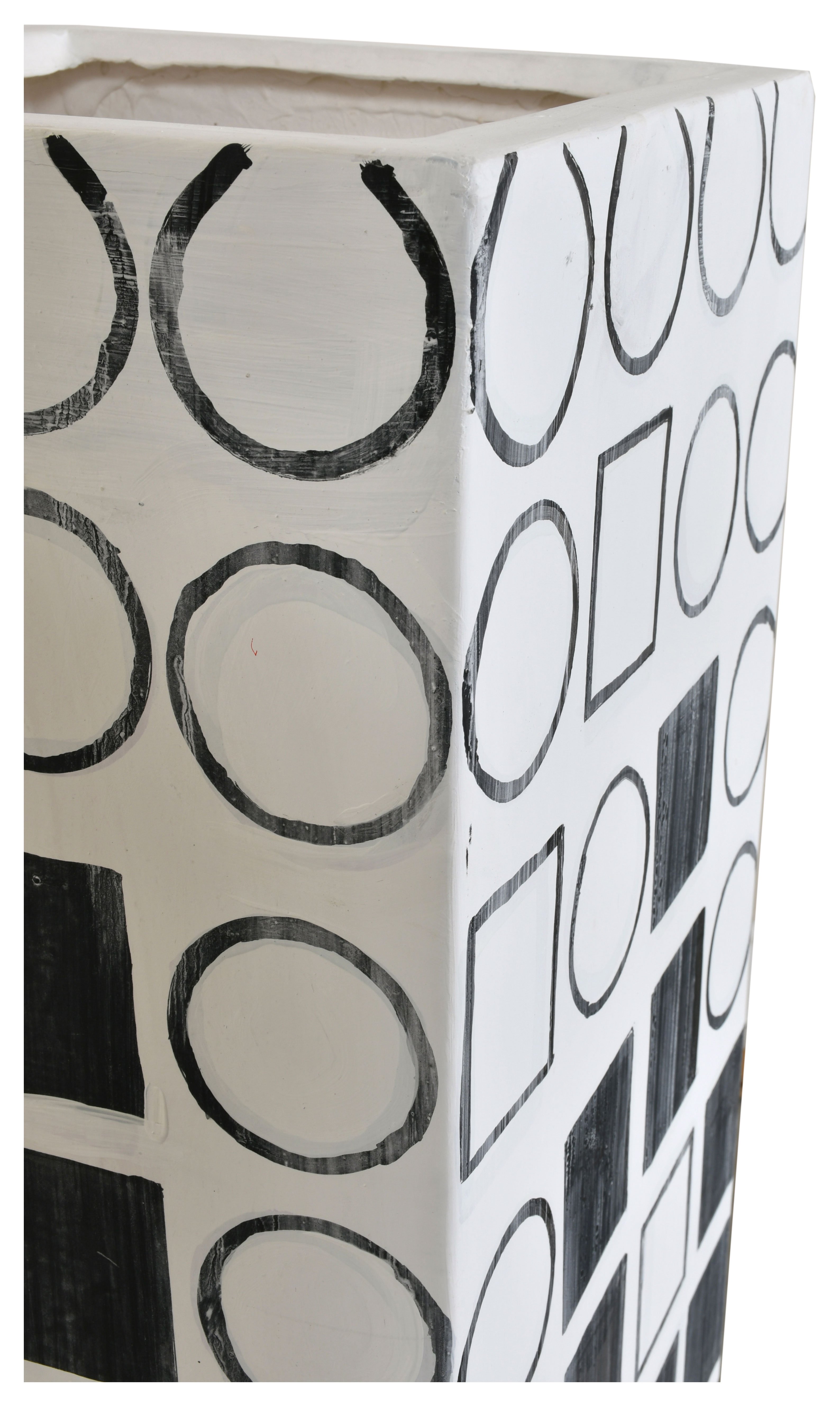 Elevate your decor with the striking 48-inch-Tall Decorative Planter Vase, a standout piece that combines contemporary style with a modern flair. This vase, measuring 13 inches in both width and depth, offers a commanding presence and an artistic touch to any space. Entirely hand-painted in a chic black and white palette, this vase is adorned with an array of geometric shapes, creating a dynamic and engaging visual appeal. The intricate design and monochromatic scheme make this piece versatile enough to complement various decor styles while adding a touch of sophistication. While this 48-inch-tall vase is impactful on its own, it can also be paired with the 32-inch and 40-inch vases from the same collection to create a stunning ensemble. Arranging these vases together allows for an interesting play of heights and forms, enhancing the depth and complexity of your decorative display. Ideal for holding tall branches, ornamental grasses, or simply used as a standalone statement piece, this vase introduces an element of contemporary elegance to your living room, foyer, or office. Its hand-painted finish ensures that each piece is unique, offering an exclusive and refined touch to your interior design. Embrace the artistry and modernity of the 48-inch Tall Decorative Planter Vase, a piece that promises to enrich your space with its bold design and sophisticated charm.
