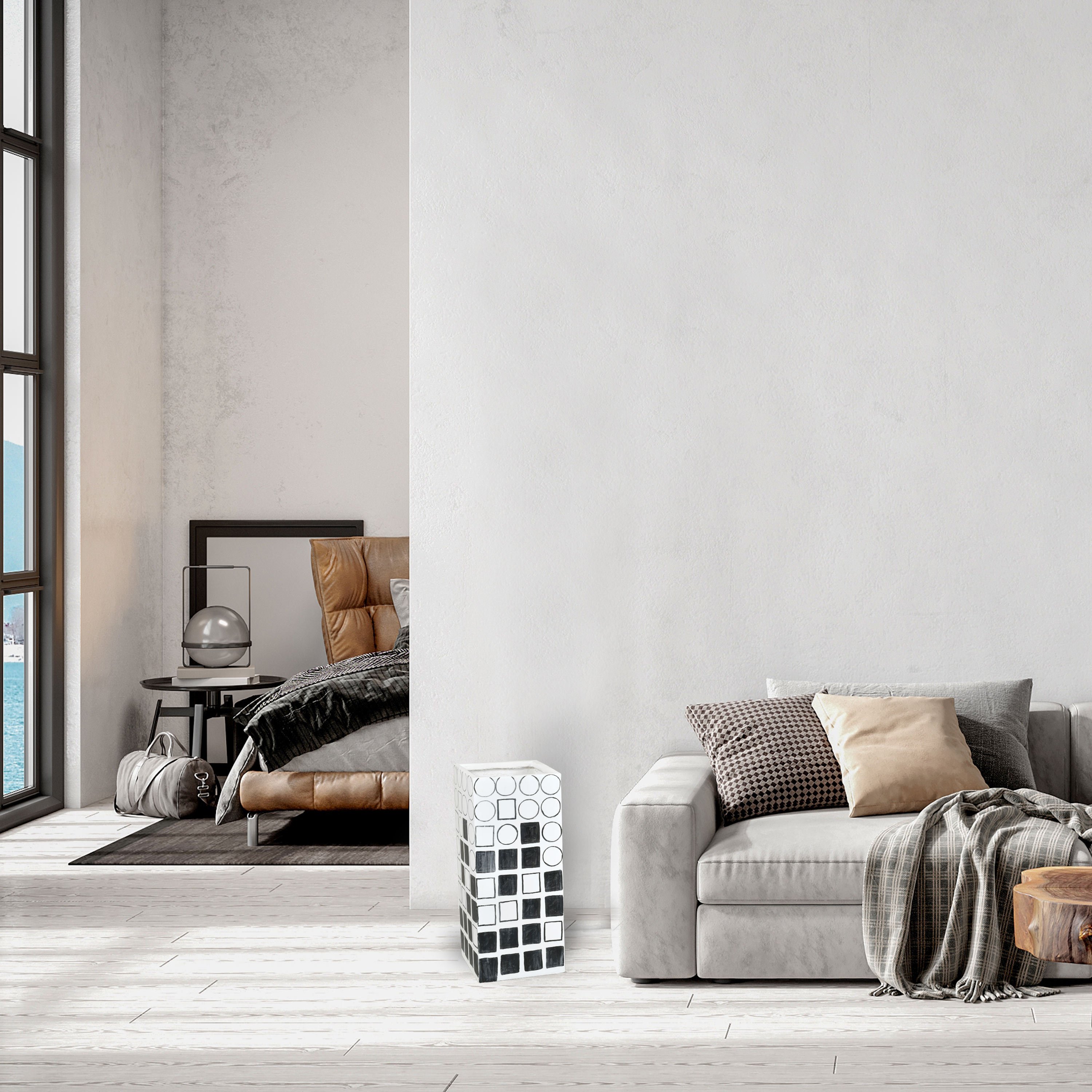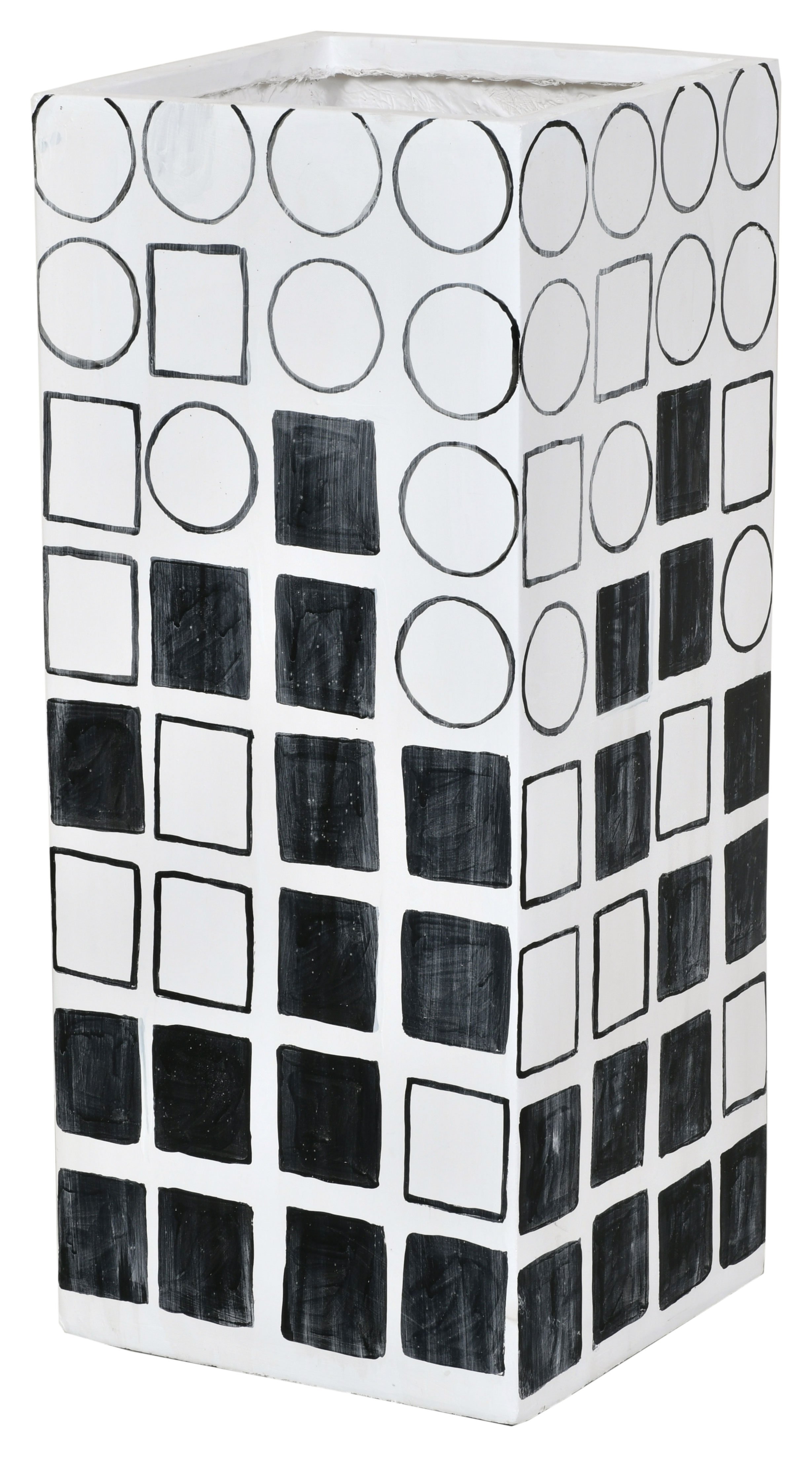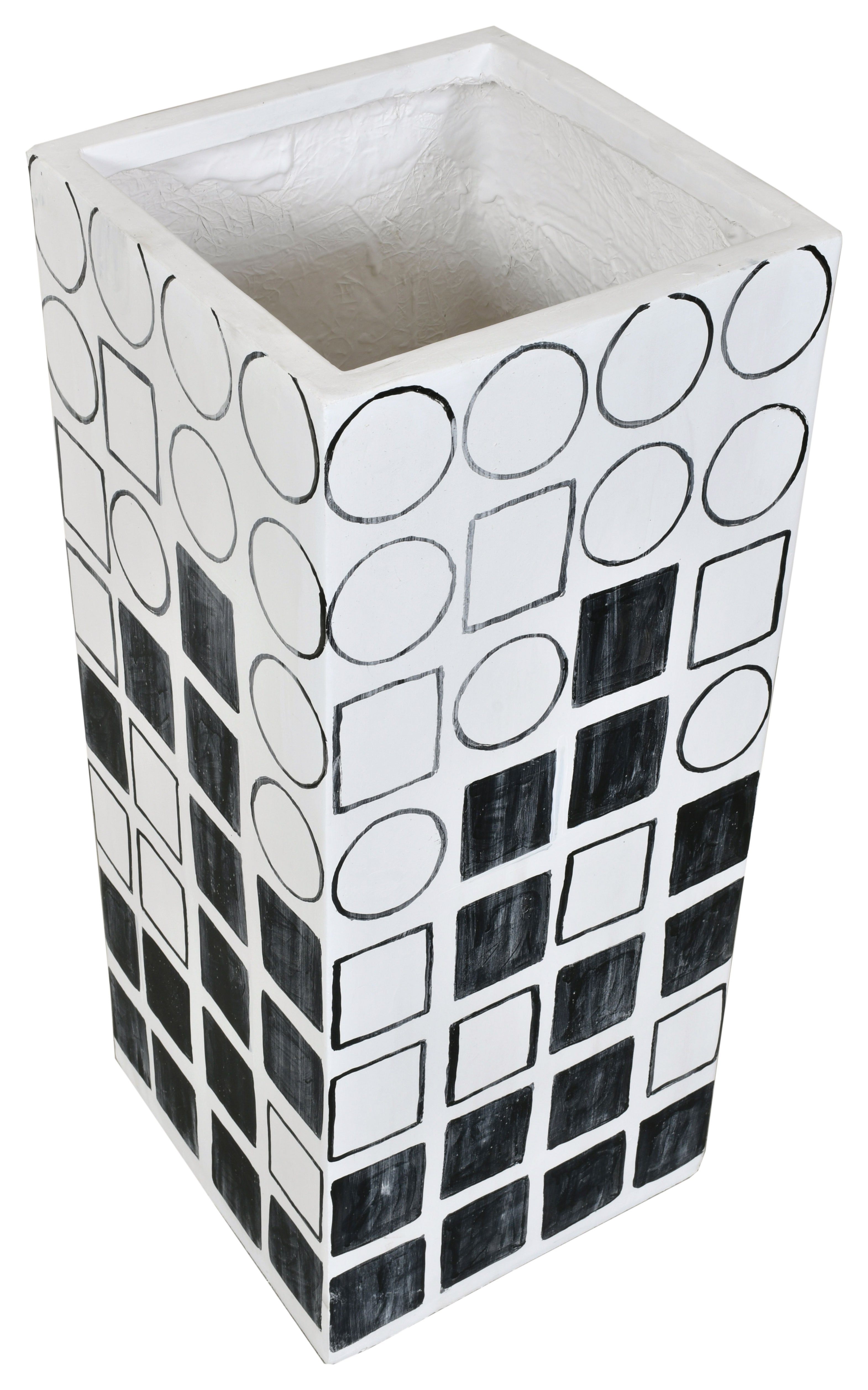 Elevate your decor with the 32-inch tall Decorative Planter Vase, a striking piece that melds contemporary style with a modern flare. Measuring 13 inches in both width and depth, this hand-painted black and white vase is adorned with an array of geometric shapes, offering a dynamic and engaging visual appeal. Crafted with meticulous attention to detail, this vase stands out with its unique design and artistic hand-painted finish. The geometric patterns provide a bold contrast against the vase's sleek silhouette, making it an eye-catching addition to any room. While it makes a statement on its own, this 32-inch planter vase can also be paired with the 40-inch and 48-inch versions from the same collection to create a tiered arrangement. Such a setup offers varying heights and an added depth to your decorative display, enhancing the visual interest and contemporary feel of your space. Ideal for holding plants or as a standalone decor piece, this planter vase brings a touch of elegance and modernity to any setting. Whether gracing an entryway, living room, or office, it serves as a captivating focal point, infusing your environment with a blend of sophistication and artistic flair. Embrace the contemporary charm of this 32-inch tall Decorative Planter Vase and transform any area into a stylishly adorned space.