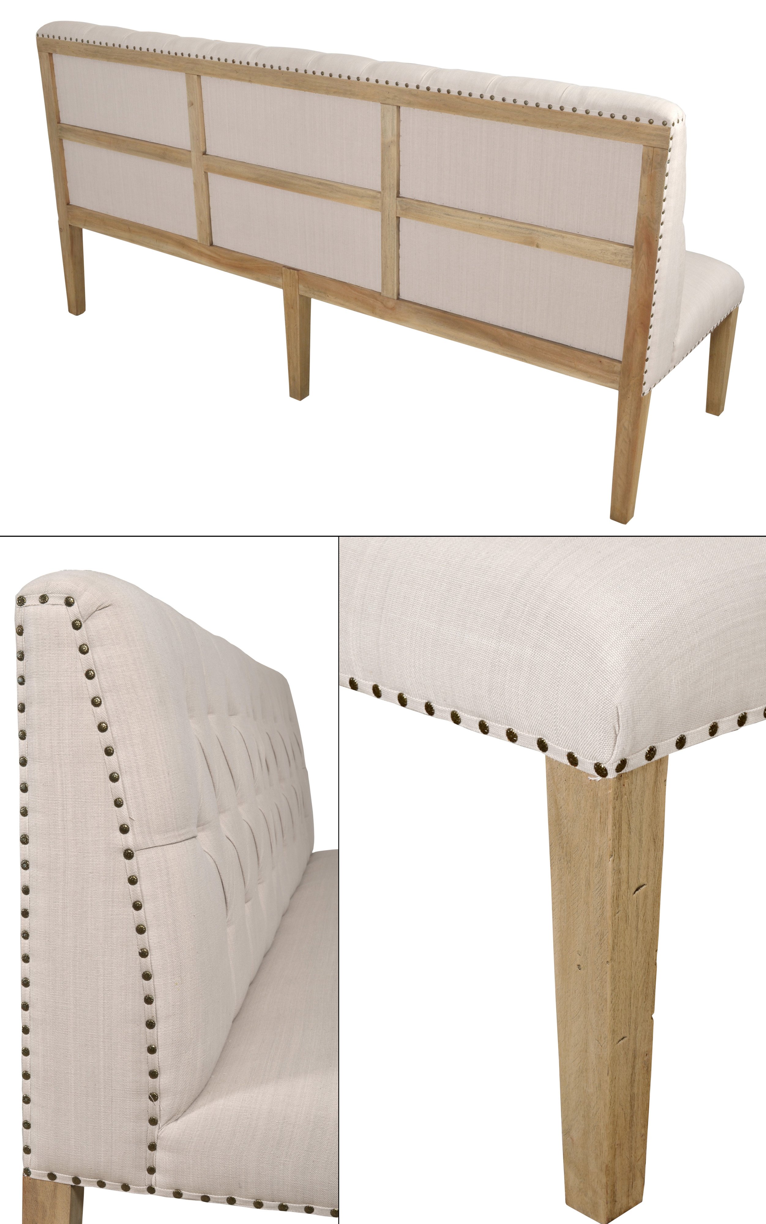The Inverness Farmhouse Bench, a versatile and stylish piece of furniture from Heritage's acclaimed Farmhouse and Coastal collections. Measuring an impressive 85 inches in width, 27 inches in depth, and 40 inches in height, this bench offers both spacious seating and a touch of elegance to any room. Crafted with meticulous attention to detail, the Inverness Farmhouse Bench is constructed from solid mahogany, known for its durability and beautiful grain. The wood is finished in a light, distressed tone that evokes a sense of warmth and rustic charm, making it a perfect fit for farmhouse or coastal-inspired interiors. The bench's inner back features fashionable tufting, fully upholstered in thick, neutral linen, providing both comfort and style. Whether used as a standalone piece or paired with the Inverness Dining Set, this bench adds a functional yet chic element to your space. Heritage Furniture is renowned for its commitment to quality and craftsmanship, with each piece bench-made by skilled artisans. This ensures that the Inverness Farmhouse Bench is not only a beautiful addition to your home but also a durable one, built to last with reasonable care. Perfect for a variety of settings, from the dining room to an entryway or bedroom, the Inverness Farmhouse Bench invites you to enjoy its comfort and style. Consider complementing it with matching fireside chairs to create a cohesive look, enhancing the beauty and functionality of your home decor. No assembly is required, allowing you to enjoy this exquisite piece immediately upon arrival.
