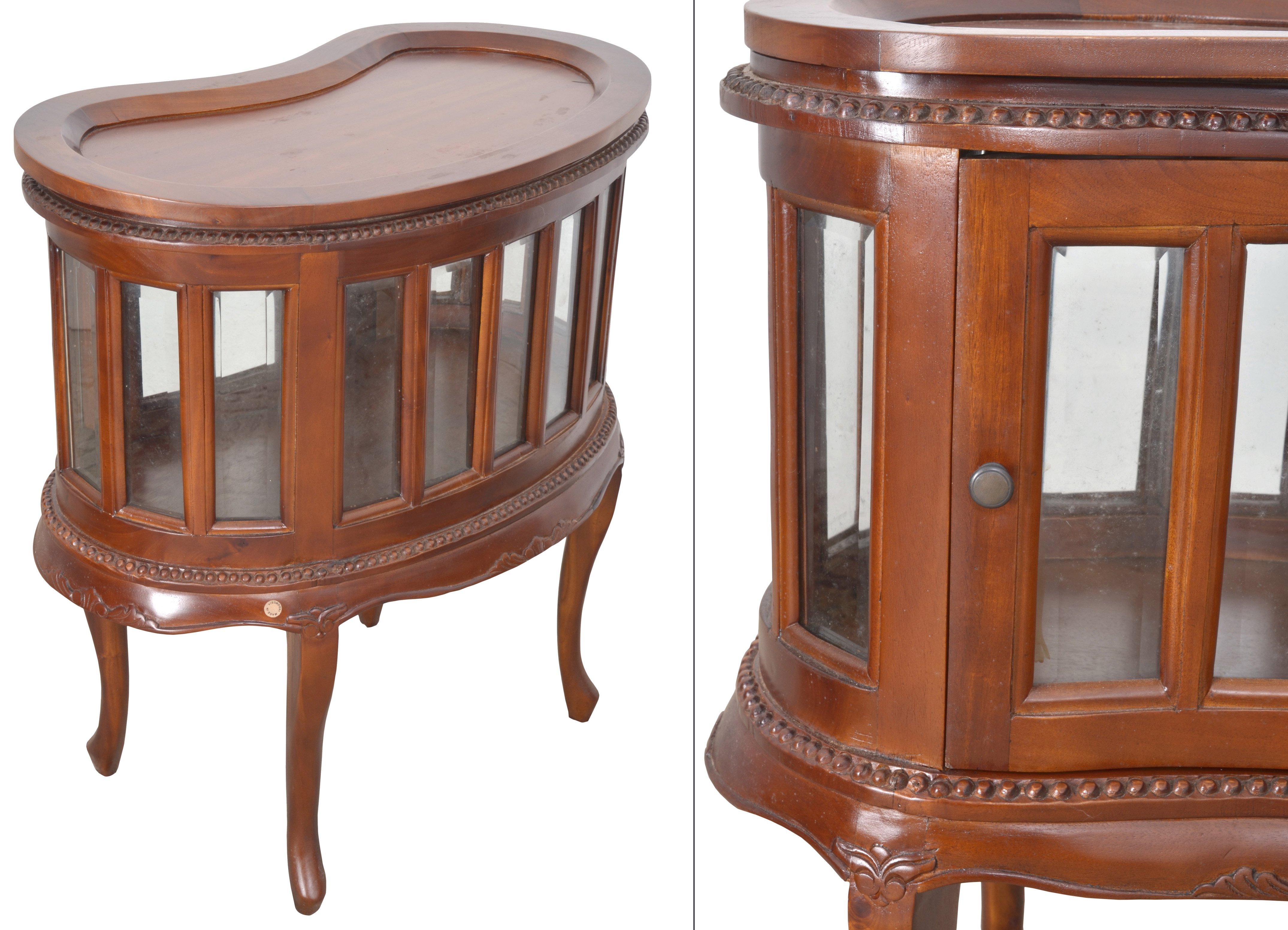Our Kidney Chocolate Table is a recreation of a traditional display cabinet 29.5" wide x 17.5 " deep x 30.5" tall. It features a removable tray that was originally intended in the design as a serving tray, a shapely display cabinet surrounded by individual beveled glass panels and a door atop 4 legs. The item is hand carved in mahogany with a mahogany finish. Made by hand and imported from Indonesia.