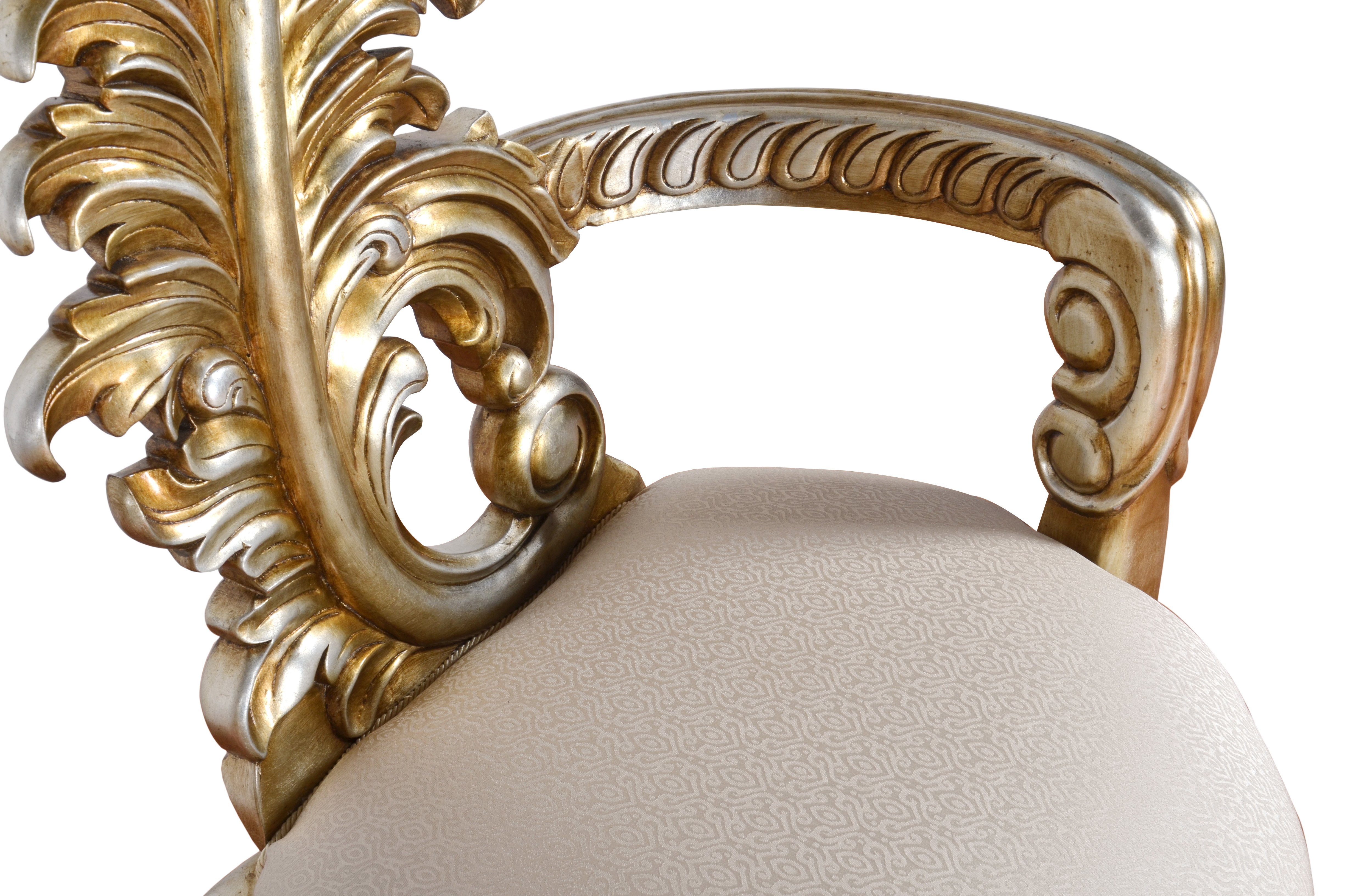 Platina Italia Leaf Chair Set of 2 each measuring 23 width x 22 depth x 61.5 inches tall. They are a beautiful example of a style of furnishings, originating in France about 1720, evolved from Baroque styling, This intricately carved Rococo designed chair set offers elongated backs with symmetrical carvings. The chairs are hand carved out of solid Mahogany that is then tastefully finished in our Platina finish and upholstered with an imported Silver Taffeta fabric. Another exclusive design and finish from the Heritage Collection, a division of AFD Home. A collection of fine, hand made furniture in the purest of standards of age old traditional crafting. Each piece is hand carved, one piece at a time, by some of the world's best carvers. The special Mahogany wood comes from replanted forests. The selected wood has been kiln dried. The item in its final form is stress and pressure tested prior to finishing to insure long lasting stability, in most climates, a Heritage Brand standard. The Platina finish series offers many accompanying items to these chairs that can be considered and combined to expand your desired interior. The chairs come fully assembled, a process of finer construction offering a more stable seating. Made by hand and imported from Indonesia.