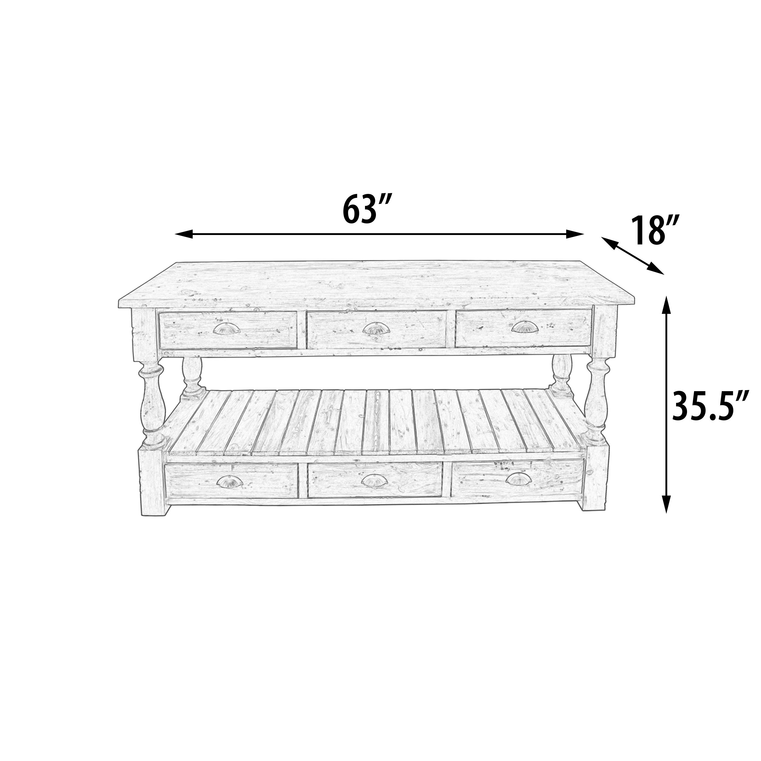 The 63"W Farmhouse Rustic Country Coastal Console Table 6 Drawers at 63" wide x 18" deep x 35.50" tall is a very cool, unique item in the style of an old butcher block counter. It features a thick wood top with 6 drawers, brass towel rail, antiqued hand-hammered hardware. It is a part of a popular new Farmhouse Series from the Heritage Collection. The Farmhouse Series is an expanding series that is affordable yet appropriately fashioned for a more relaxed Farmhouse lifestyle. The style of the collection also can fit with farmhouse interiors as well as southern or new England designed more rustic homes. The items are all hand made using solid bleached pine from Indonesia. The table is sold separately and is a unique stand-alone addition. All of the Farmhouse Series pairs perfectly with each other and can be mixed matched and combined with increasing the desired interior design