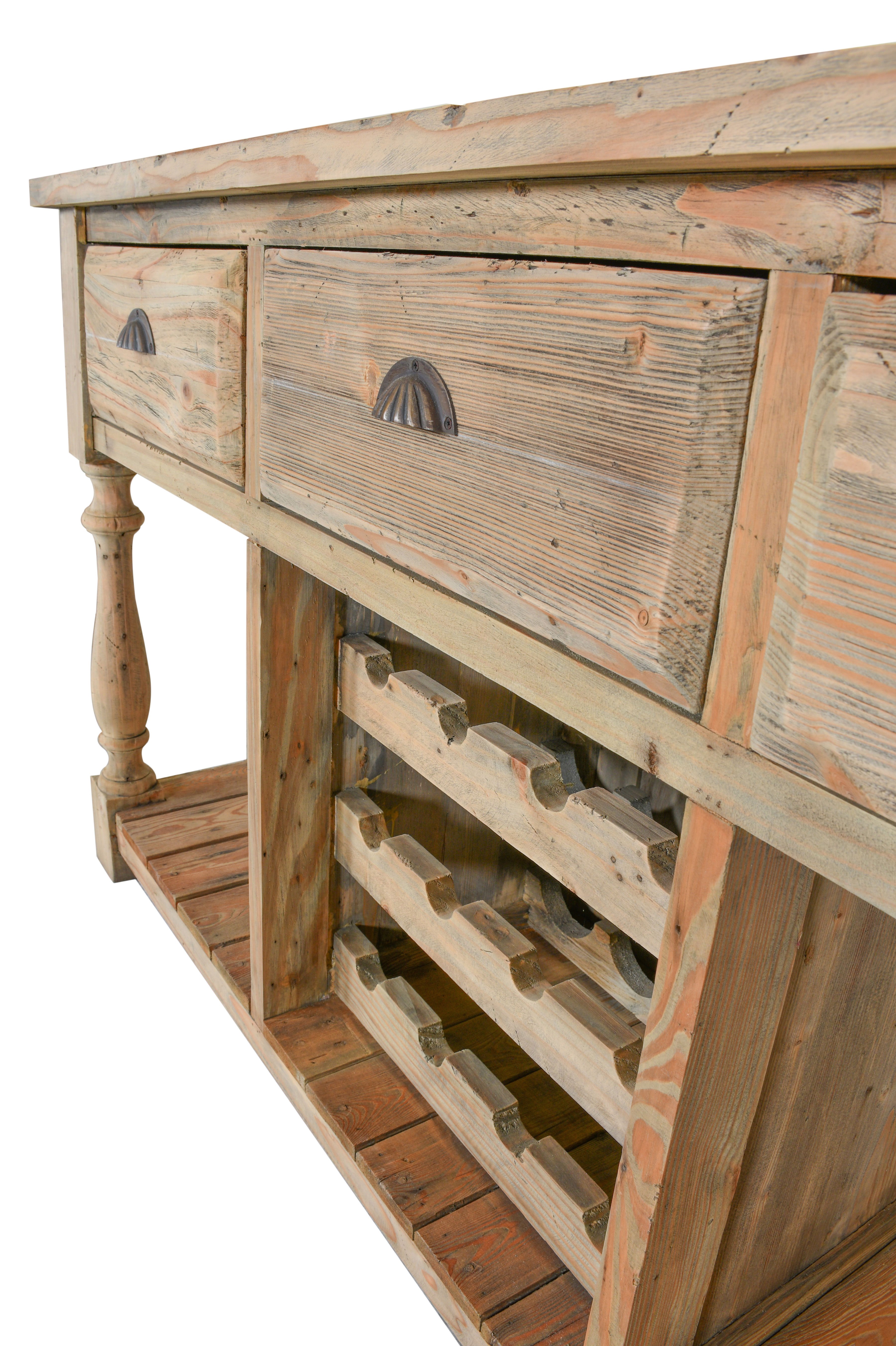 Crafted from Authentic Reclaimed New Zealand Pine, this console showcases a blend of natural aged pine and timeless charm of authentic craftsmanship. Reclaimed wood imported from New Zealand, sourced from old barns, houses, barns, boxcars, and wine barrels all seasoned wood with age-old character that make it highly desirable. Repurposing this wood is not only environmentally responsible but also a crucial element in achieving the genuine look and quality of the bar wine console. Functional and aesthetically pleasing, the console bar features three drawers, open plank base shelving, and a center fitted with 12 bottle storage. Handcrafted with care, the bar console requires no assembly, making it a hassle-free addition to your home. A testament to craftsmanship, sustainability, and the enduring appeal of authentic design.