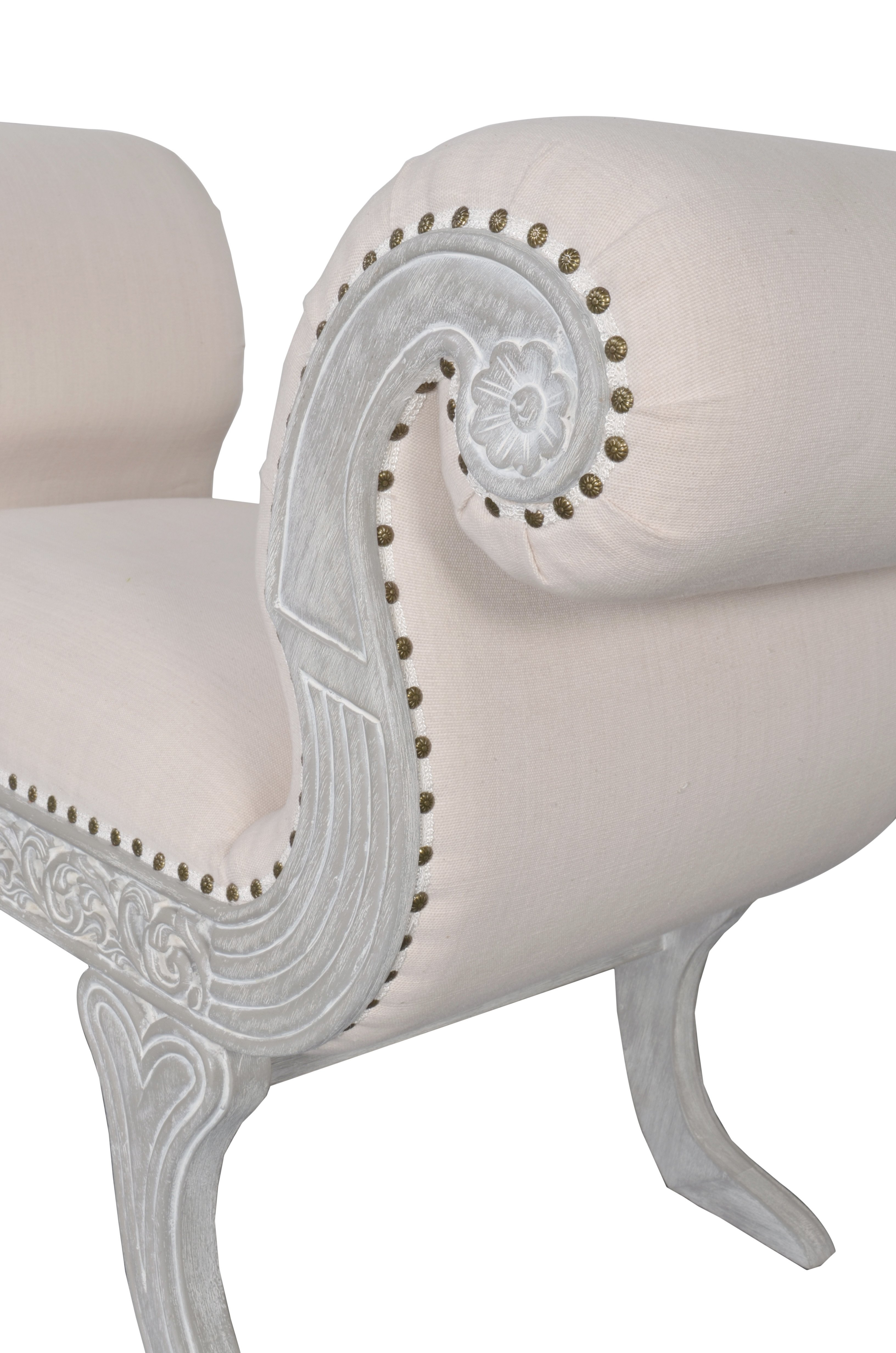 Our Mystique Mahogany Scrolled Love Seat with 50 " Length and 33" Tall is from our new Mystique Mahogany Collection from Heritage, a division of AFD Home lends richness to a simpler luxurious lifestyle. A turn of the century design brought to grander American scale with tall rolled arms, and impressive hand-carved details. While beautifully decorative, the seat provides a seating solution for an elegant vanity, a bed or window bench or settee. It is Handcrafted out of hand-selected solid Mahogany wood that is then tastefully finished in our NEW intermediate Mystique Grey, a neutral or achromatic color. Our Mystique Grey finishing technique has evolved over the years and as such, is the special focus of this new Collection. Mystique Grey is so placeable by today’s top designers because it is truly a color that is without color, A salute to a new contemporary, sophisticated lifestyle, a combination of finish and design that celebrate the beauty of fine grain of the Mahogany wood and enhance the vestiges of this rich wood gloriously visible in a tone that will create solidity to your overall design. This bench works beautifully with our Mystique Mahogany Maison Royale Bed King or pair it with any of the Mystique Mahogany Grey Collection offerings. No assembly required!