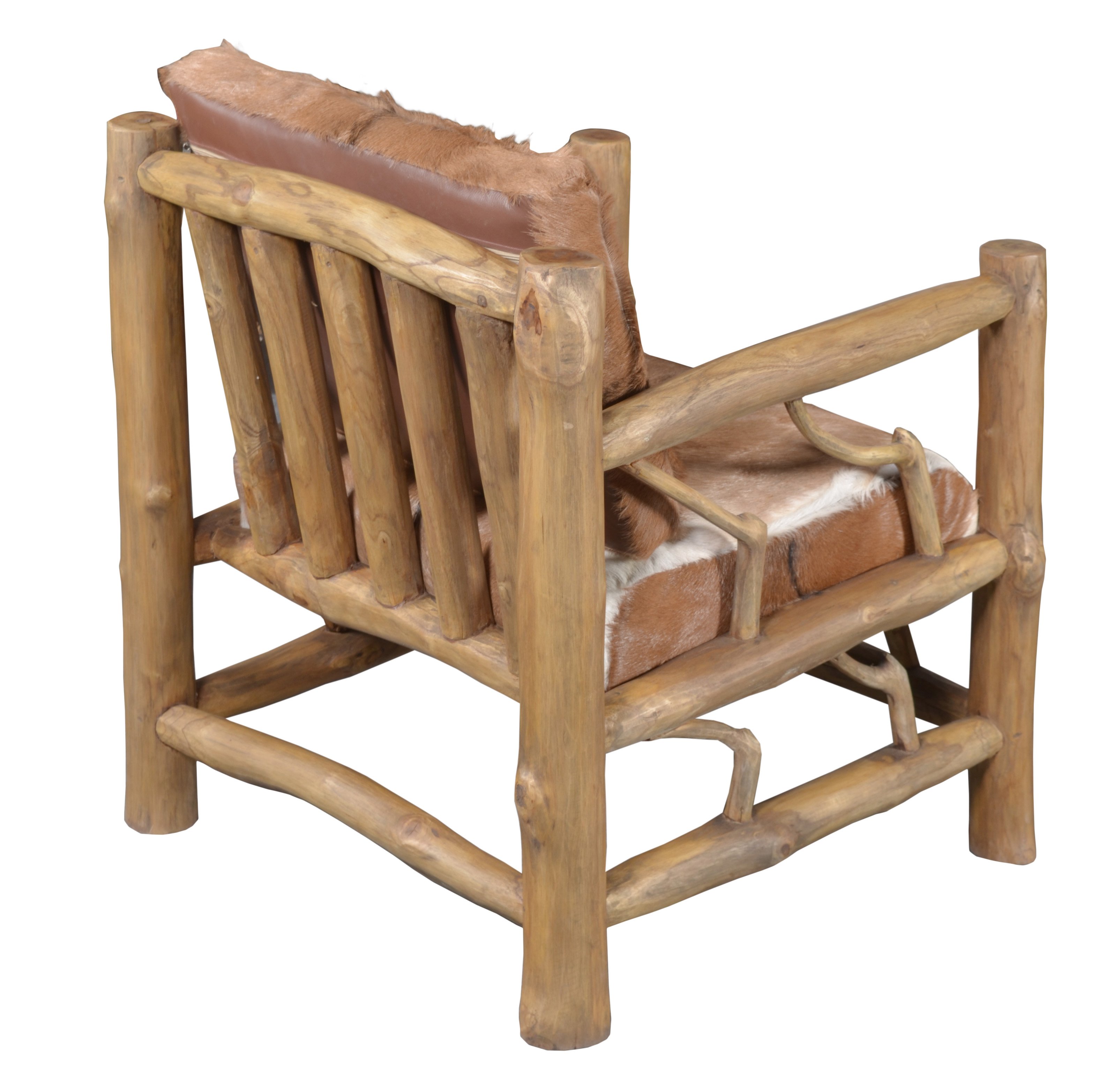 A 29 " wide x 31" deep x 33" tall comes this Fur Teak Lodge Arm Chair, a deep seating club style chair, from our Adirondack Teak Collection. Adirondack furniture refers to a rugged architectural style using native building materials within an irregular wooded landscape. The chair offered is made using natural exotic Teak lumber from Indonesia. it is hand crafted using age old and proven mortise and Tenon construction. This technique has been used for thousands of years by woodworkers around the world to join pieces of wood, it is the most authentic looking construction and very strong. The seat cushions and backs are beautiful and covered in authentic hides. This item is sold separately but often combined with other offering from the Adirondack series for a more complete designed affect. Made by hand and imported from Indonesia.